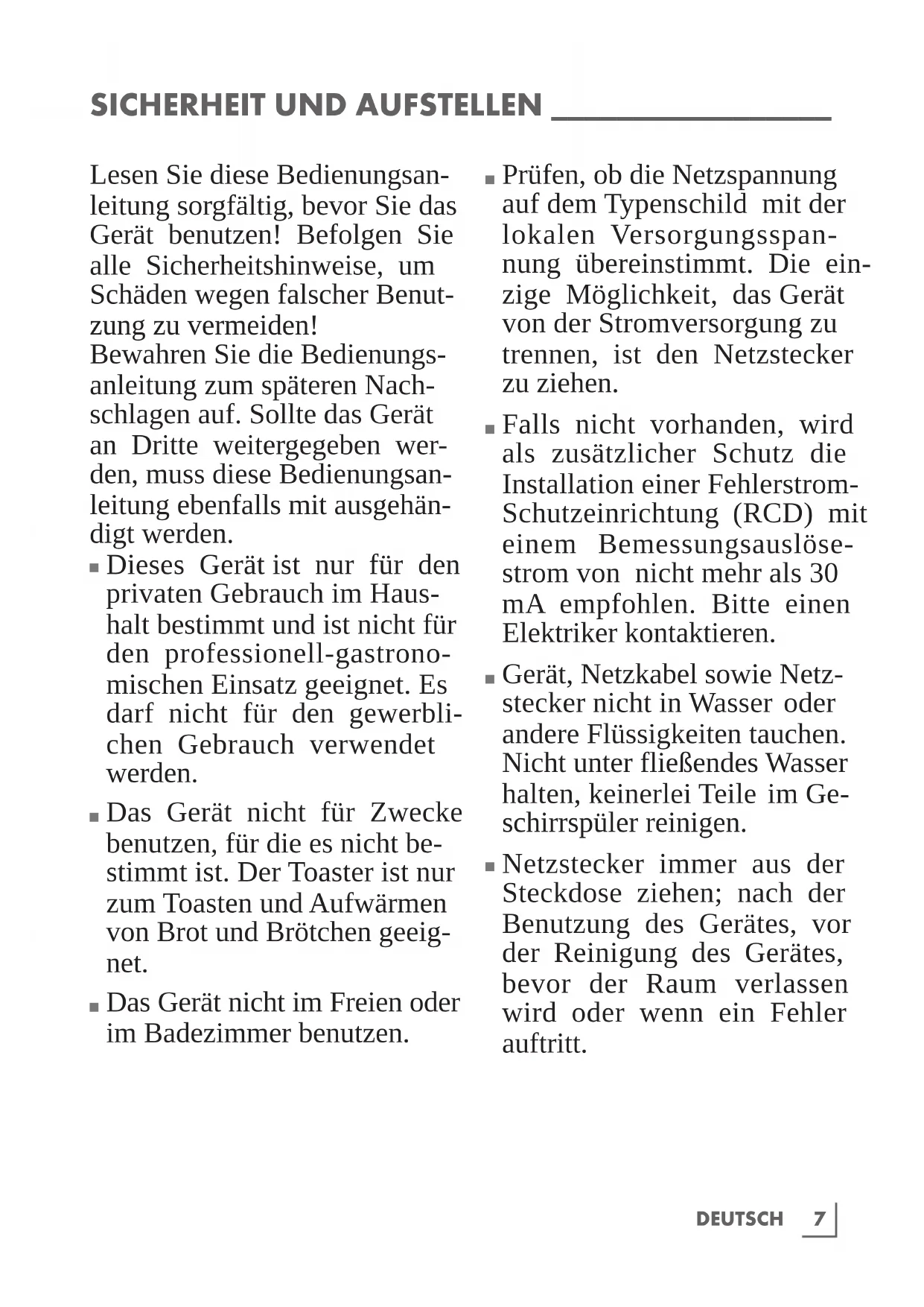 Das Gerät nicht für Zwecke benutzen, für die es nicht be- stimmt ist. Der Toaster ist nur zum Toasten und Aufwärmen von Brot und Brötchen geeig- net.