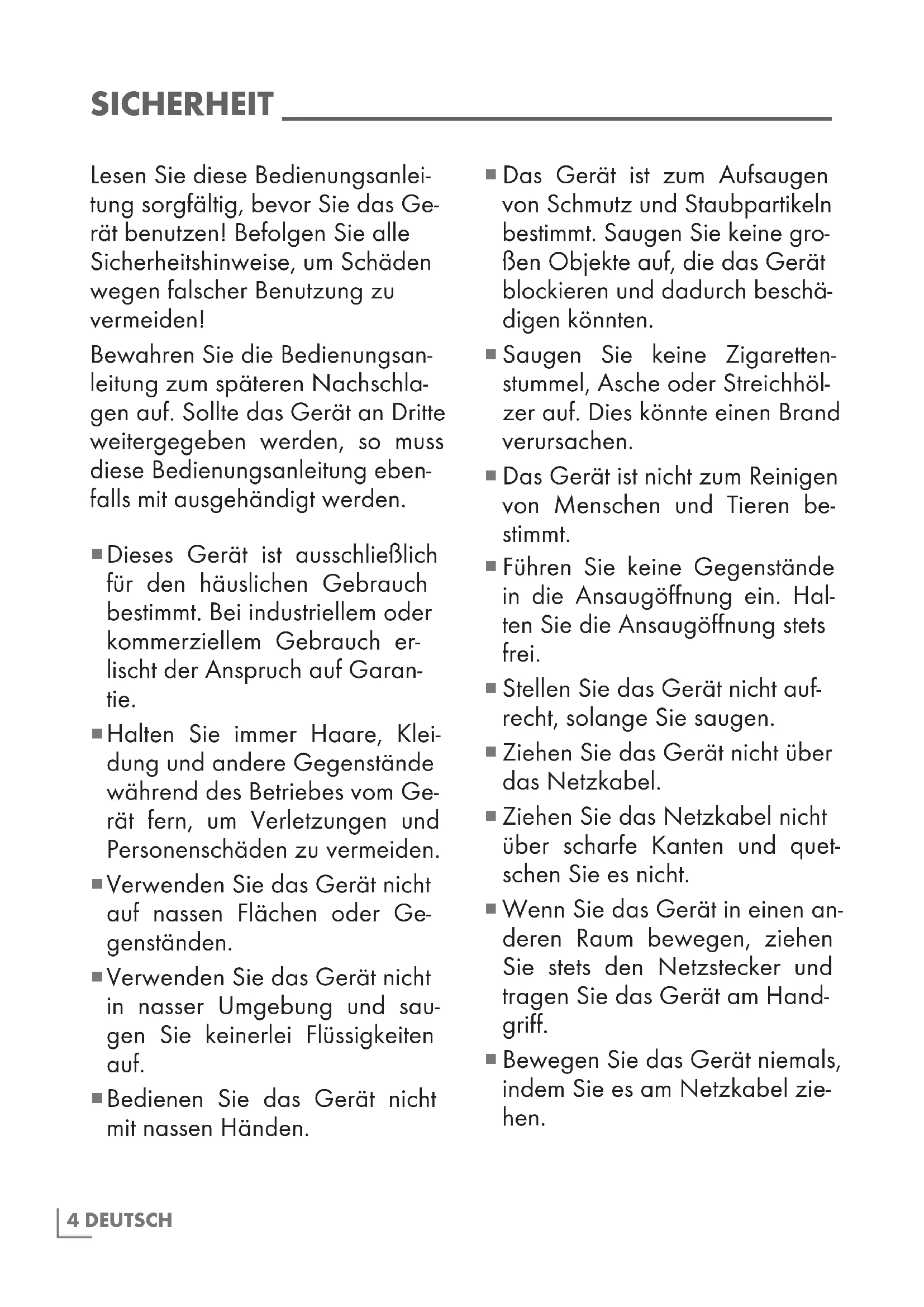 SICHERHEIT ________________________________ Lesen Sie diese Bedienungsanlei- tung sorgfältig, bevor Sie das Ge- rät benutzen! Befolgen Sie alle Sicherheitshinweise, um Schäden wegen falscher Benutzung zu vermeiden! Bewahren Sie die Bedienungsan- leitung zum späteren Nachschla- gen auf. Sollte das Gerät an Dritte weitergegeben werden, so muss diese Bedienungsanleitung eben- falls mit ausgehändigt werden.