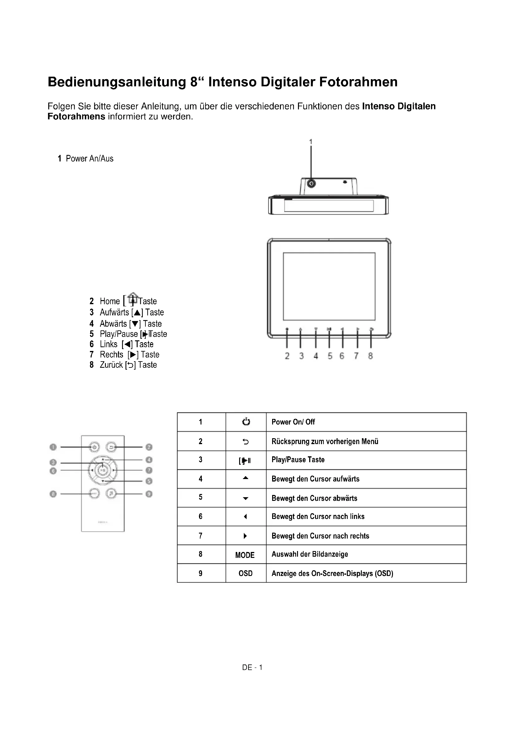 V1.0DE - 1 Bedienungsanleitung 8“ Intenso Digitaler Fotorahmen Folgen Sie bitte dieser Anleitung, um über die verschiedenen Funktionen des Intenso Digitalen Fotorahmens informiert zu werden.