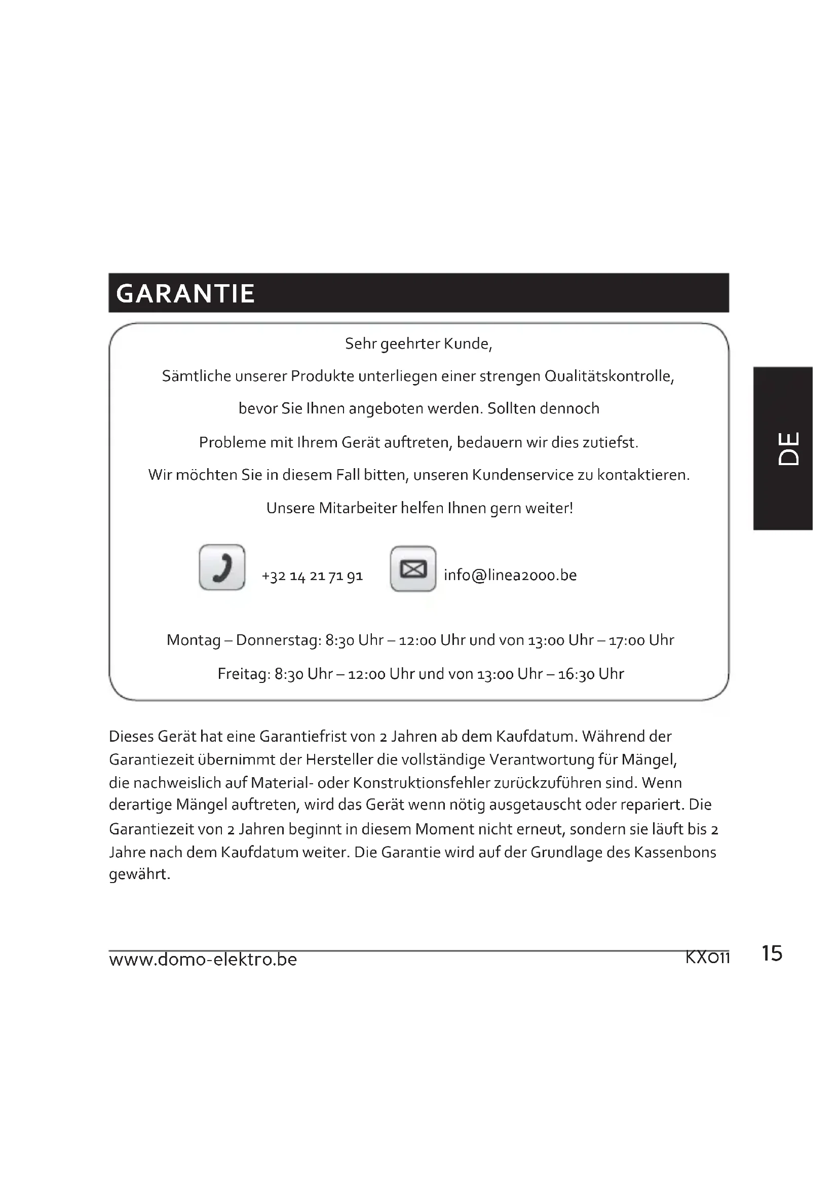 Dieses Gerät hat eine Garantiefrist von 2 Jahren ab dem Kaufdatum. Während der Garantiezeit übernimmt der Hersteller die vollständige Verantwortung für Mängel, die nachweislich auf Material- oder Konstruktionsfehler zurückzuführen sind. Wenn derartige Mängel auftreten, wird das Gerät wenn nötig ausgetauscht oder repariert. Die Garantiezeit von 2 Jahren beginnt in diesem Moment nicht erneut, sondern sie läuft bis 2 Jahre nach dem Kaufdatum weiter. Die Garantie wird auf der Grundlage des Kassenbons gewährt.