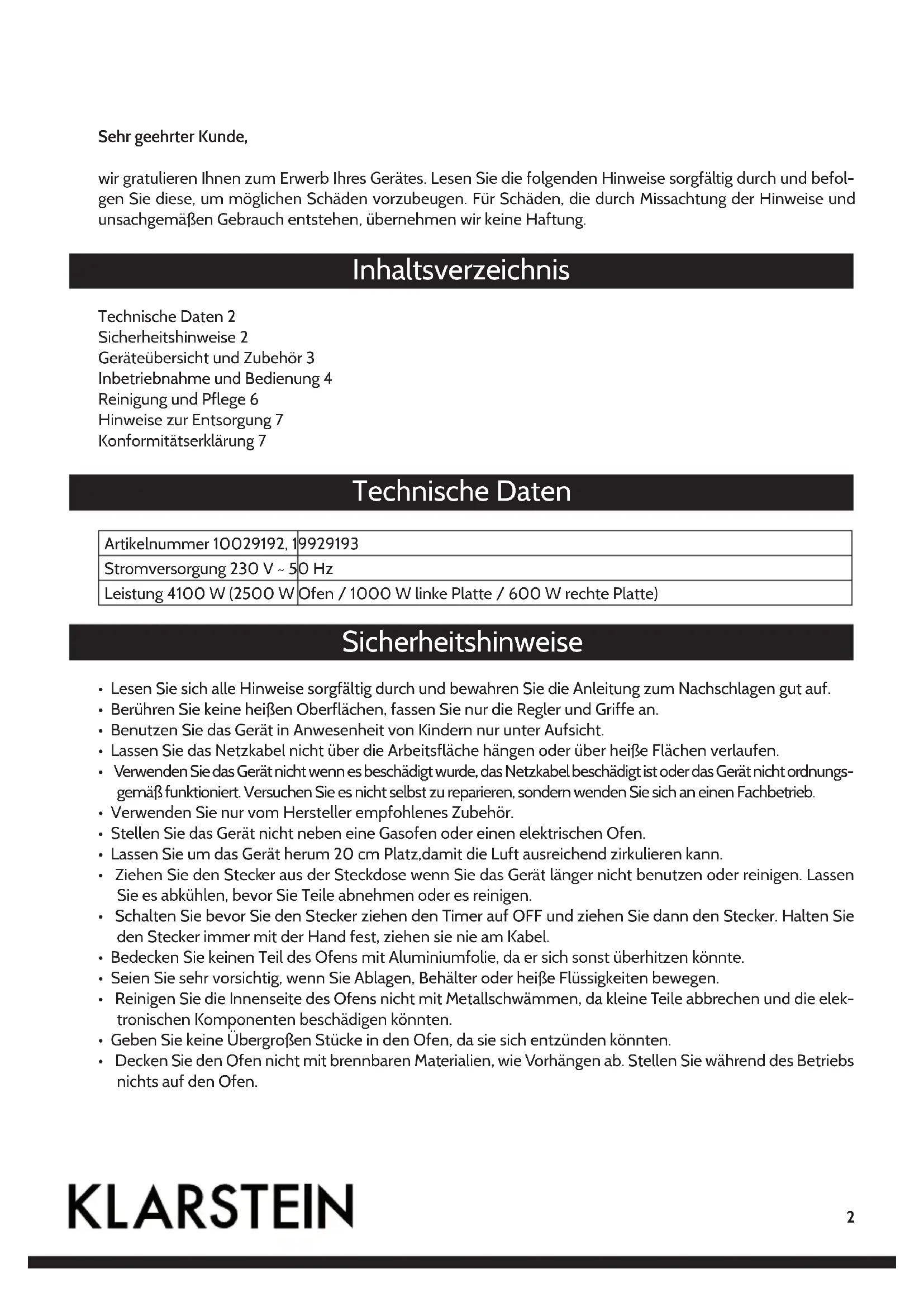 - Befestigen Sie das Zubehör wieder im Ofen und verstauen Sie ihn. WICHTIG: Benutzen Sie zu Reinigung keine Scheuermittel oder scharfkantige Objekte, wie Messer oder Scheuerschwäm- me, da sie die Oberfläche beschädigen. Tauchen Sie das Gerät, das Netzkabel und den Stecker niemals in Wasser oder andere Flüssigkeiten. Hinweise zur Entsorgung Befindet sich die linke Abbildung (durchgestrichene Mülltonne auf Rädern) auf dem Pro- dukt, gilt die Europäische Richtlinie 2002/96/EG. Diese Produkte dürfen nicht mit dem normalen Hausmüll entsorgt werden. Informieren Sie sich über die örtlichen Regelungen zur getrennten Sammlung elektrischer und elektronischer Gerätschaften. Richten Sie sich nach den örtlichen Regelungen und entsorgen Sie Altgeräte nicht über den Hausmüll. Durch die regelkonforme Entsorgung der Altgeräte werden Umwelt und die Gesundheit ihrer Mitmenschen vor möglichen negativen Konsequenzen geschützt. Materialrecycling hilft, den Verbrauch von Rohstoffen zu verringern. Konformitätserklärung Hersteller: Chal-Tec GmbH, Wallstraße 16, 10179 Berlin, Deutschland. Dieses Produkt entspricht den folgenden Europäischen Richtlinien: 2014/30/EU (EMV) 2014/35/EU (LVD) 2011/65/EU (RoHS)8 Dear Customer, Congratulations on purchasing this equipment. Please read this manual carefully and take care of the following hints to avoid damages. Any failure caused by ignoring the mentioned items and cautions mentioned in the instruction manual are not covered by our warranty and any liability. Contents Technical Data 8 Safety Instructions 8 Product Description and Accessory 9 Use and Operation 10 Cleaning and Care 12 Hints on Disposal 13 Declaration of Conformity 13 Technical Data Item number 10029192, 19929193 Power supply 230 V ~ 50 Hz Power consumtion 4100 W (2500 W oven / 100 W left plate / 600 W right plate) Safety Instructions