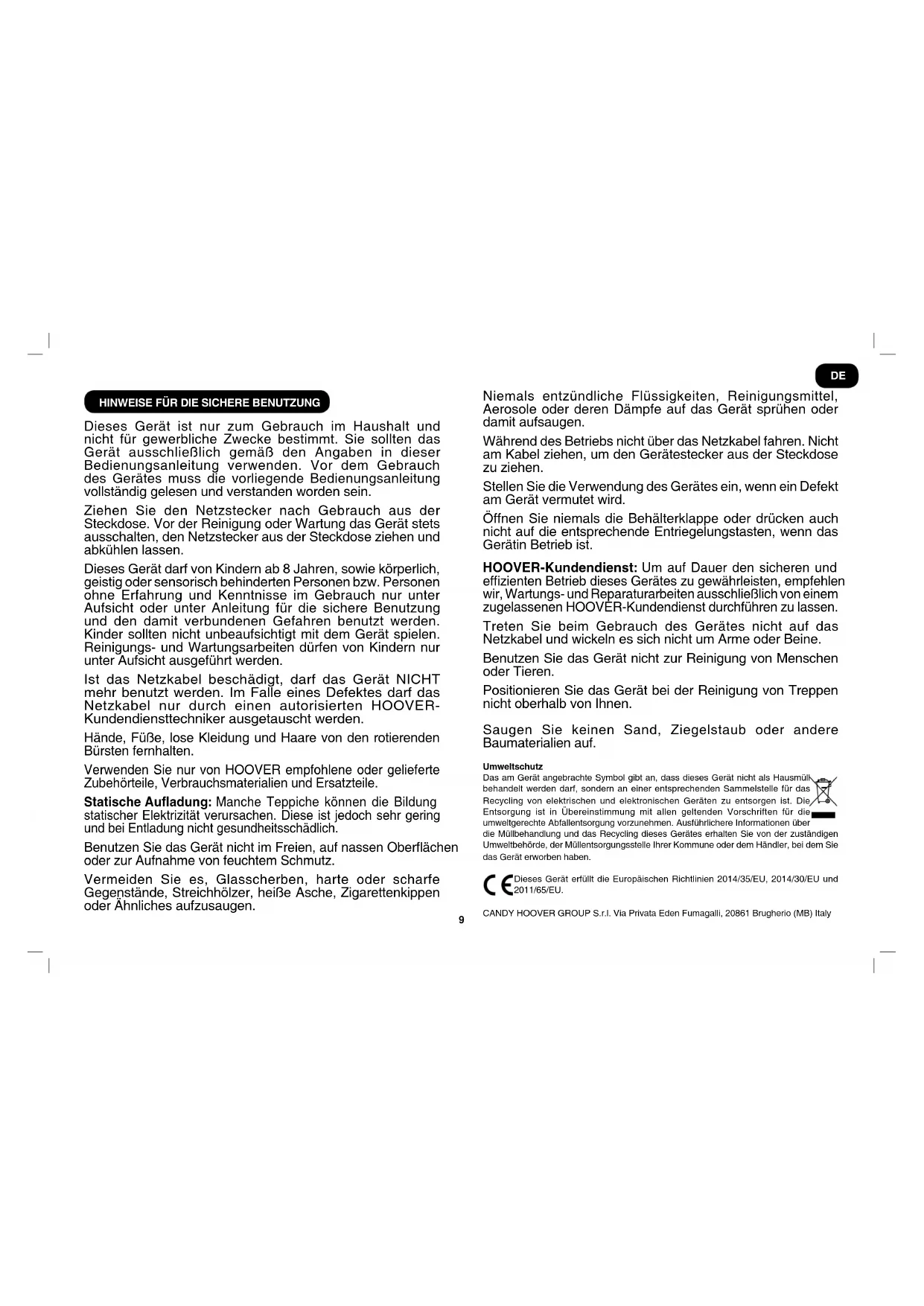 Dieses Gerät ist nur zum Gebrauch im Haushalt und nicht für gewerbliche Zwecke bestimmt. Sie sollten das Gerät ausschließlich gemäß den Angaben in dieser Bedienungsanleitung verwenden. Vor dem Gebrauch des Gerätes muss die vorliegende Bedienungsanleitung vollständig gelesen und verstanden worden sein. Ziehen Sie den Netzstecker nach Gebrauch aus der Steckdose. Vor der Reinigung oder Wartung das Gerät stets ausschalten, den Netzstecker aus der Steckdose ziehen und abkühlen lassen. Dieses Gerät darf von Kindern ab 8 Jahren, sowie körperlich, geistig oder sensorisch behinderten Personen bzw. Personen ohne Erfahrung und Kenntnisse im Gebrauch nur unter Aufsicht oder unter Anleitung für die sichere Benutzung und den damit verbundenen Gefahren benutzt werden. Kinder sollten nicht unbeaufsichtigt mit dem Gerät spielen. Reinigungs- und Wartungsarbeiten dürfen von Kindern nur unter Aufsicht ausgeführt werden. Ist das Netzkabel beschädigt, darf das Gerät NICHT mehr benutzt werden. Im Falle eines Defektes darf das Netzkabel nur durch einen autorisierten HOOVER- Kundendiensttechniker ausgetauscht werden. Hände, Füße, lose Kleidung und Haare von den rotierenden Bürsten fernhalten. Verwenden Sie nur von HOOVER empfohlene oder gelieferte Zubehörteile, Verbrauchsmaterialien und Ersatzteile. StatischeAuadung:Manche Teppiche können die Bildung statischer Elektrizität verursachen. Diese ist jedoch sehr gering und bei Entladung nicht gesundheitsschädlich. Benutzen Sie das Gerät nicht im Freien, auf nassen Oberächen oder zur Aufnahme von feuchtem Schmutz. Vermeiden Sie es, Glasscherben, harte oder scharfe Gegenstände, Streichhölzer, heiße Asche, Zigarettenkippen oder Ähnliches aufzusaugen. Niemals entzündliche Flüssigkeiten, Reinigungsmittel, Aerosole oder deren Dämpfe auf das Gerät sprühen oder damit aufsaugen. Während des Betriebs nicht über das Netzkabel fahren. Nicht am Kabel ziehen, um den Gerätestecker aus der Steckdose zu ziehen. Stellen Sie die Verwendung des Gerätes ein, wenn ein Defekt am Gerät vermutet wird. Öffnen Sie niemals die Behälterklappe oder drücken auch nicht auf die entsprechende Entriegelungstasten, wenn das Gerätin Betrieb ist. HOOVER-Kundendienst: Um auf Dauer den sicheren und efzienten Betrieb dieses Gerätes zu gewährleisten, empfehlen wir, Wartungs- und Reparaturarbeiten ausschließlich von einem zugelassenen HOOVER-Kundendienst durchführen zu lassen. Treten Sie beim Gebrauch des Gerätes nicht auf das Netzkabel und wickeln es sich nicht um Arme oder Beine. Benutzen Sie das Gerät nicht zur Reinigung von Menschen oder Tieren. Positionieren Sie das Gerät bei der Reinigung von Treppen nicht oberhalb von Ihnen. Saugen Sie keinen Sand, Ziegelstaub oder andere Baumaterialien auf. Umweltschutz Das am Gerät angebrachte Symbol gibt an, dass dieses Gerät nicht als Hausmüll behandelt werden darf, sondern an einer entsprechenden Sammelstelle für das Recycling von elektrischen und elektronischen Geräten zu entsorgen ist. Die Entsorgung ist in Übereinstimmung mit allen geltenden Vorschriften für die umweltgerechte Abfallentsorgung vorzunehmen. Ausführlichere Informationen über die Müllbehandlung und das Recycling dieses Gerätes erhalten Sie von der zuständigen Umweltbehörde, der Müllentsorgungsstelle Ihrer Kommune oder dem Händler, bei dem Sie das Gerät erworben haben. Dieses Gerät erfüllt die Europäischen Richtlinien 2014/35/EU, 2014/30/EU und 2011/65/EU. CANDY HOOVER GROUP S.r.l. Via Privata Eden Fumagalli, 20861 Brugherio (MB) Italy DE10 *Geräteausstattung ist modellabhängig **Je nach Modell unterschiedlich A. Staubbehälterklappe B. Staubbehälter C. Gerätechassis D. Schieberegler für elektronische Leistungsregulierung** D1. LED-Display mit berührungsempndlichen Steuerelementen** E. EIN-/AUS-Schalter F. Vormotorlterabdeckung G. Behältertragegriff H. Entriegelungstaste für Behälterklappe