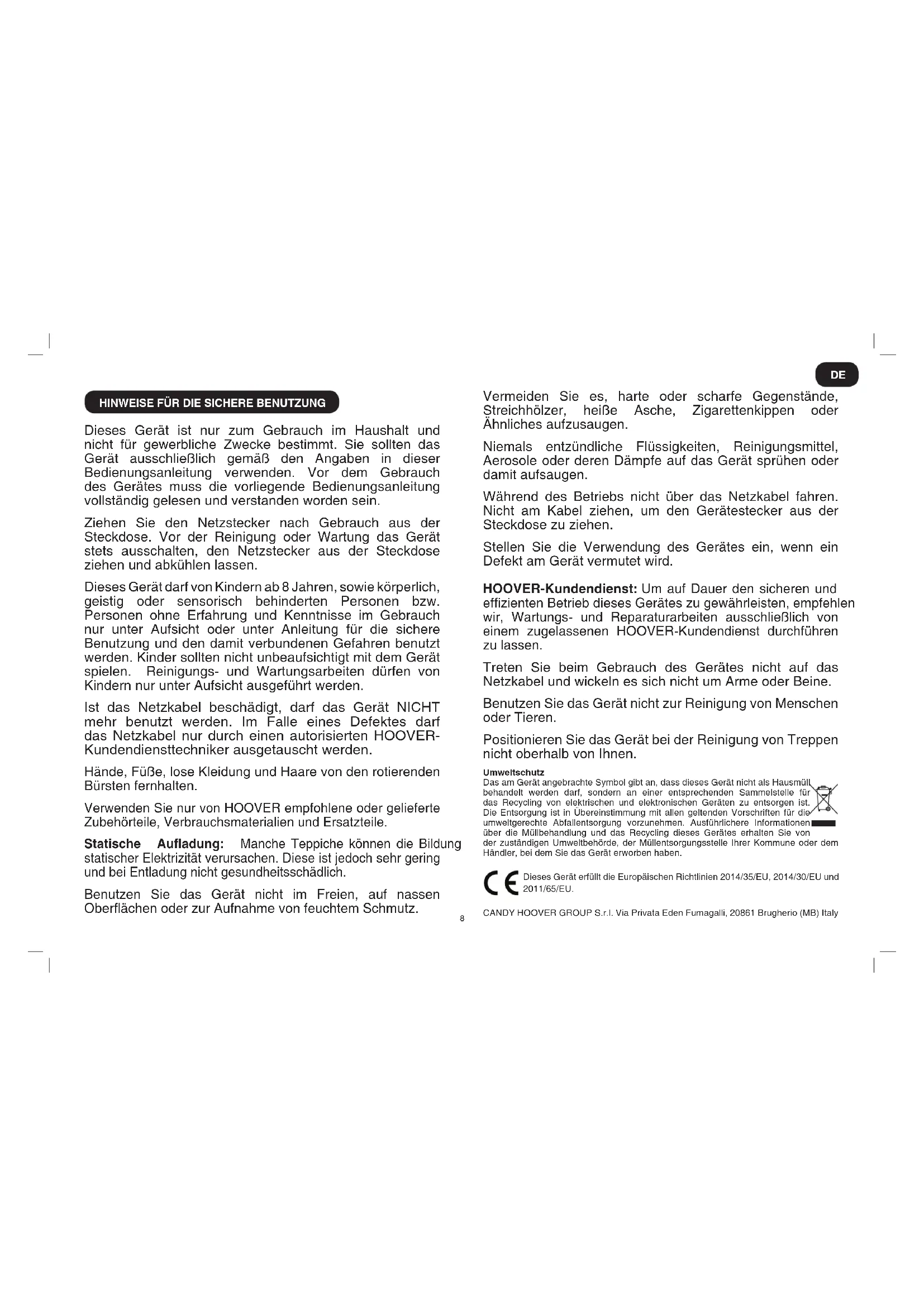 Dieses Gerät ist nur zum Gebrauch im Haushalt und nicht für gewerbliche Zwecke bestimmt. Sie sollten das Gerät ausschließlich gemäß den Angaben in dieser Bedienungsanleitung verwenden. Vor dem Gebrauch des Gerätes muss die vorliegende Bedienungsanleitung vollständig gelesen und verstanden worden sein. Ziehen Sie den Netzstecker nach Gebrauch aus der Steckdose. Vor der Reinigung oder Wartung das Gerät stets ausschalten, den Netzstecker aus der Steckdose ziehen und abkühlen lassen. Dieses Gerät darf von Kindern ab 8 Jahren, sowie körperlich, geistig oder sensorisch behinderten Personen bzw. Personen ohne Erfahrung und Kenntnisse im Gebrauch nur unter Aufsicht oder unter Anleitung für die sichere Benutzung und den damit verbundenen Gefahren benutzt werden. Kinder sollten nicht unbeaufsichtigt mit dem Gerät spielen. Reinigungs- und Wartungsarbeiten dürfen von Kindern nur unter Aufsicht ausgeführt werden. Ist das Netzkabel beschädigt, darf das Gerät NICHT mehr benutzt werden. Im Falle eines Defektes darf das Netzkabel nur durch einen autorisierten HOOVER- Kundendiensttechniker ausgetauscht werden. Hände, Füße, lose Kleidung und Haare von den rotierenden Bürsten fernhalten. Verwenden Sie nur von HOOVER empfohlene oder gelieferte Zubehörteile, Verbrauchsmaterialien und Ersatzteile. Statische Auadung: Manche Teppiche können die Bildung statischer Elektrizität verursachen. Diese ist jedoch sehr gering und bei Entladung nicht gesundheitsschädlich. Benutzen Sie das Gerät nicht im Freien, auf nassen Oberächen oder zur Aufnahme von feuchtem Schmutz. Vermeiden Sie es, harte oder scharfe Gegenstände, Streichhölzer, heiße Asche, Zigarettenkippen oder Ähnliches aufzusaugen. Niemals entzündliche Flüssigkeiten, Reinigungsmittel, Aerosole oder deren Dämpfe auf das Gerät sprühen oder damit aufsaugen. Während des Betriebs nicht über das Netzkabel fahren. Nicht am Kabel ziehen, um den Gerätestecker aus der Steckdose zu ziehen. Stellen Sie die Verwendung des Gerätes ein, wenn ein Defekt am Gerät vermutet wird. HOOVER-Kundendienst: Um auf Dauer den sicheren und efzienten Betrieb dieses Gerätes zu gewährleisten, empfehlen wir, Wartungs- und Reparaturarbeiten ausschließlich von einem zugelassenen HOOVER-Kundendienst durchführen zu lassen. Treten Sie beim Gebrauch des Gerätes nicht auf das Netzkabel und wickeln es sich nicht um Arme oder Beine. Benutzen Sie das Gerät nicht zur Reinigung von Menschen oder Tieren. Positionieren Sie das Gerät bei der Reinigung von Treppen nicht oberhalb von Ihnen. Umweltschutz Das am Gerät angebrachte Symbol gibt an, dass dieses Gerät nicht als Hausmüll behandelt werden darf, sondern an einer entsprechenden Sammelstelle für das Recycling von elektrischen und elektronischen Geräten zu entsorgen ist. Die Entsorgung ist in Übereinstimmung mit allen geltenden Vorschriften für die umweltgerechte Abfallentsorgung vorzunehmen. Ausführlichere Informationen über die Müllbehandlung und das Recycling dieses Gerätes erhalten Sie von der zuständigen Umweltbehörde, der Müllentsorgungsstelle Ihrer Kommune oder dem Händler, bei dem Sie das Gerät erworben haben. Dieses Gerät erfüllt die Europäischen Richtlinien 2014/35/EU, 2014/30/EU und 2011/65/EU. CANDY HOOVER GROUP S.r.l. Via Privata Eden Fumagalli, 20861 Brugherio (MB) Italy DE9 *Geräteausstattung ist modellabhängig ** Je nach Modell unterschiedlich GERÄTEBESCHREIBUNG A. Gerätechassis B. Saugschlauch C. Saugschlauch Handle** D. Nebenluftregelung* E. Rasterteleskoprohr** Ea. Teleskoprohr-Schnappverschluss* Eb. Teleskoprohrlängenverstellung** F. Tragegriff G. Staubbeutelfüllanzeige (LED) H. EIN-/AUS-Schalter