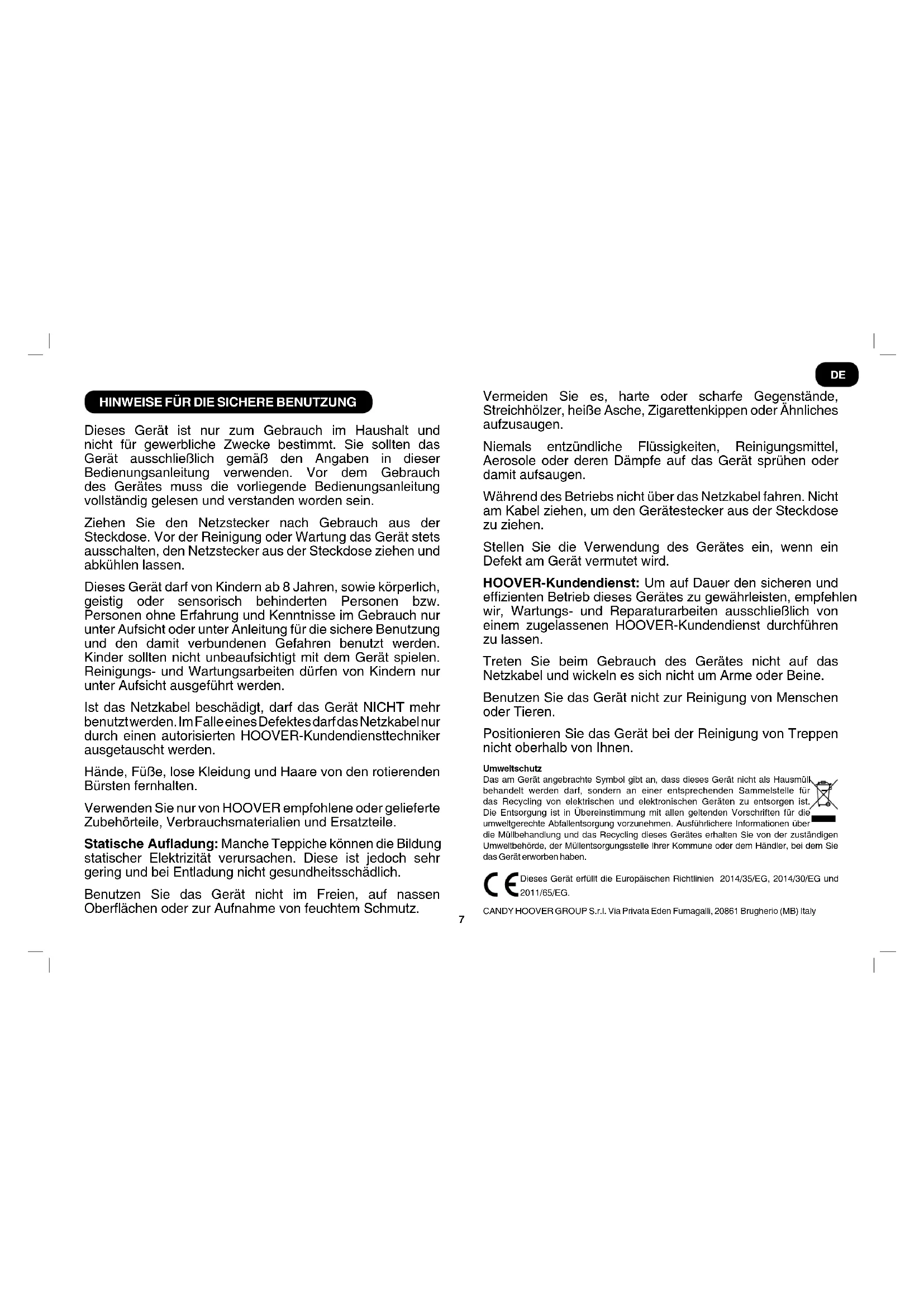 Dieses Gerät ist nur zum Gebrauch im Haushalt und nicht für gewerbliche Zwecke bestimmt. Sie sollten das Gerät ausschließlich gemäß den Angaben in dieser Bedienungsanleitung verwenden. Vor dem Gebrauch des Gerätes muss die vorliegende Bedienungsanleitung vollständig gelesen und verstanden worden sein. Ziehen Sie den Netzstecker nach Gebrauch aus der Steckdose. Vor der Reinigung oder Wartung das Gerät stets ausschalten, den Netzstecker aus der Steckdose ziehen und abkühlen lassen. Dieses Gerät darf von Kindern ab 8 Jahren, sowie körperlich, geistig oder sensorisch behinderten Personen bzw. Personen ohne Erfahrung und Kenntnisse im Gebrauch nur unter Aufsicht oder unter Anleitung für die sichere Benutzung und den damit verbundenen Gefahren benutzt werden. Kinder sollten nicht unbeaufsichtigt mit dem Gerät spielen. Reinigungs- und Wartungsarbeiten dürfen von Kindern nur unter Aufsicht ausgeführt werden. Ist das Netzkabel beschädigt, darf das Gerät NICHT mehr benutzt werden. Im Falle eines Defektes darf das Netzkabel nur durch einen autorisierten HOOVER-Kundendiensttechniker ausgetauscht werden. Hände, Füße, lose Kleidung und Haare von den rotierenden Bürsten fernhalten. Verwenden Sie nur von HOOVER empfohlene oder gelieferte Zubehörteile, Verbrauchsmaterialien und Ersatzteile. Statische Auadung: Manche Teppiche können die Bildung statischer Elektrizität verursachen. Diese ist jedoch sehr gering und bei Entladung nicht gesundheitsschädlich. Benutzen Sie das Gerät nicht im Freien, auf nassen Oberächen oder zur Aufnahme von feuchtem Schmutz. Vermeiden Sie es, harte oder scharfe Gegenstände, Streichhölzer, heiße Asche, Zigarettenkippen oder Ähnliches aufzusaugen. Niemals entzündliche Flüssigkeiten, Reinigungsmittel, Aerosole oder deren Dämpfe auf das Gerät sprühen oder damit aufsaugen. Während des Betriebs nicht über das Netzkabel fahren. Nicht am Kabel ziehen, um den Gerätestecker aus der Steckdose zu ziehen. Stellen Sie die Verwendung des Gerätes ein, wenn ein Defekt am Gerät vermutet wird. HOOVER-Kundendienst: Um auf Dauer den sicheren und efzienten Betrieb dieses Gerätes zu gewährleisten, empfehlen wir, Wartungs- und Reparaturarbeiten ausschließlich von einem zugelassenen HOOVER-Kundendienst durchführen zu lassen. Treten Sie beim Gebrauch des Gerätes nicht auf das Netzkabel und wickeln es sich nicht um Arme oder Beine. Benutzen Sie das Gerät nicht zur Reinigung von Menschen oder Tieren. Positionieren Sie das Gerät bei der Reinigung von Treppen nicht oberhalb von Ihnen. Umweltschutz Das am Gerät angebrachte Symbol gibt an, dass dieses Gerät nicht als Hausmüll behandelt werden darf, sondern an einer entsprechenden Sammelstelle für das Recycling von elektrischen und elektronischen Geräten zu entsorgen ist. Die Entsorgung ist in Übereinstimmung mit allen geltenden Vorschriften für die umweltgerechte Abfallentsorgung vorzunehmen. Ausführlichere Informationen über die Müllbehandlung und das Recycling dieses Gerätes erhalten Sie von der zuständigen Umweltbehörde, der Müllentsorgungsstelle Ihrer Kommune oder dem Händler, bei dem Sie das Gerät erworben haben. Dieses Gerät erfüllt die Europäischen Richtlinien 2014/35/EG, 2014/30/EG und 2011/65/EG. CANDY HOOVER GROUP S.r.l. Via Privata Eden Fumagalli, 20861 Brugherio (MB) Italy