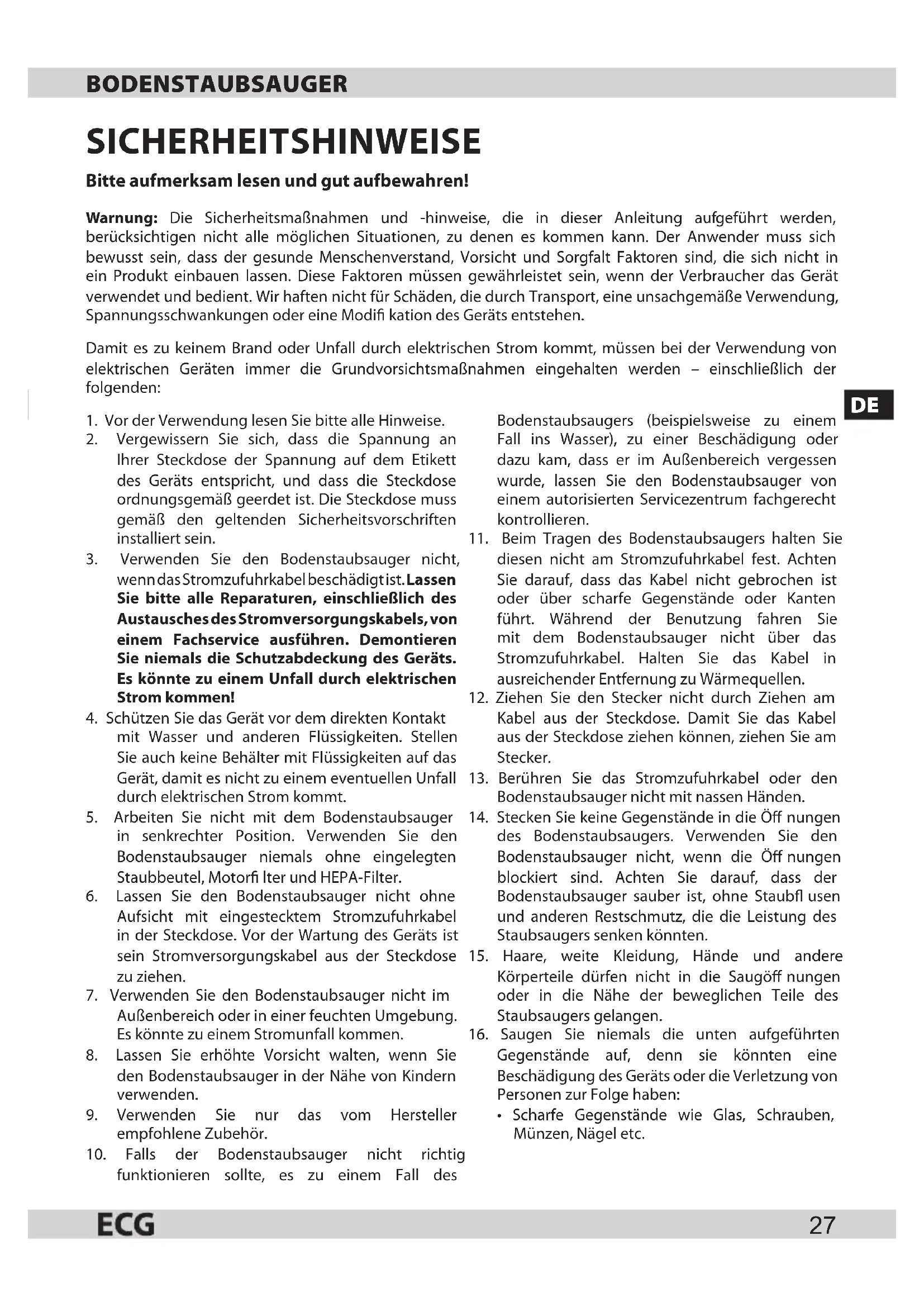 Laden Sie die Anleitung für Ihr Staubsauger kostenlos im PDF-Format! Finden Sie Ihr Handbuch VP 3143 S - ECG und nehmen Sie Ihr elektronisches Gerät wieder in die Hand. Auf dieser Seite sind alle Dokumente veröffentlicht, die für die Verwendung Ihres Geräts notwendig sind. VP 3143 S von der Marke ECG.