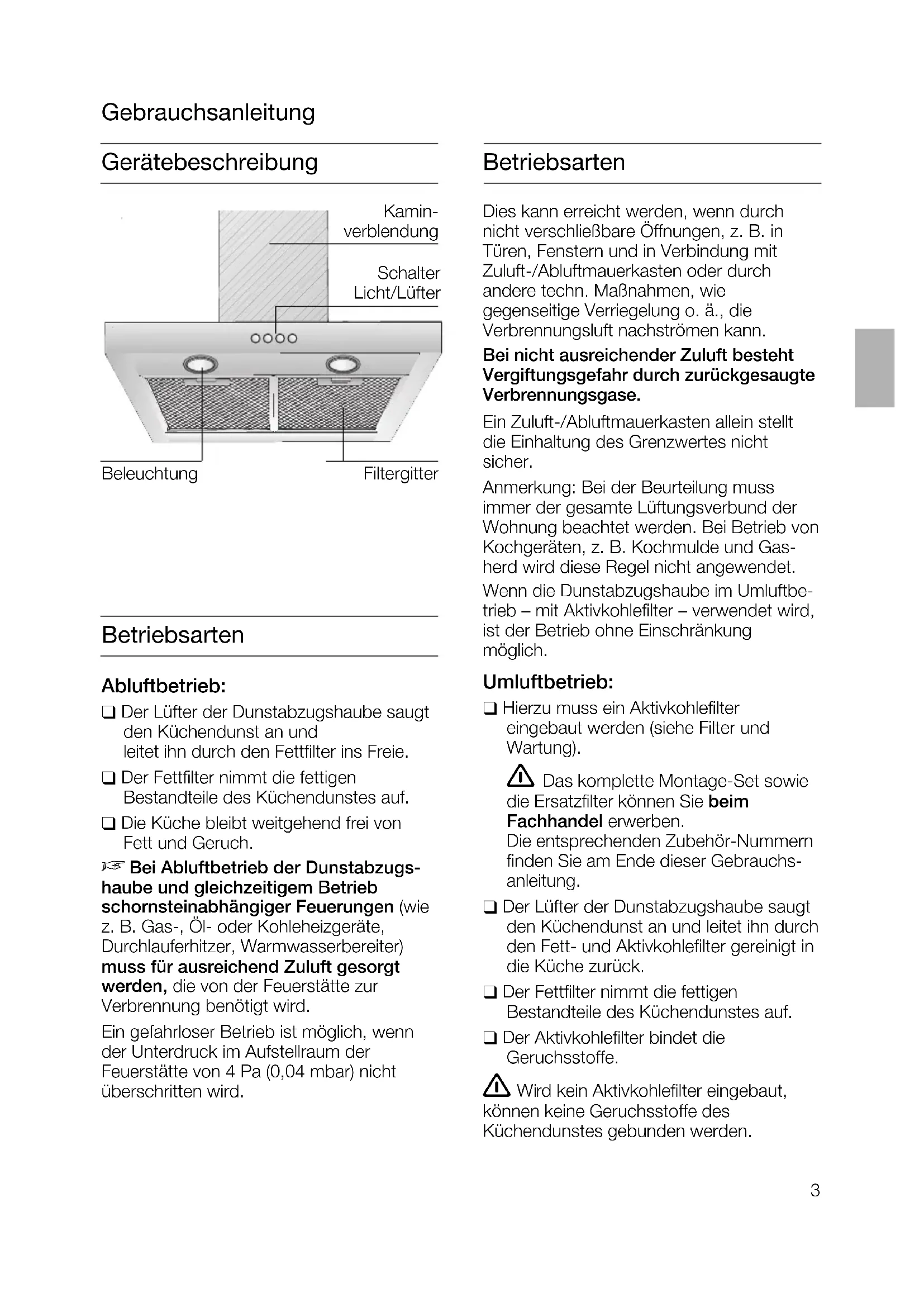 Bei Abluftbetrieb der Dunstabzugs- haube und gleichzeitigem Betrieb schornsteinabhängiger Feuerungen (wie z. B. Gas-, Öl- oder Kohleheizgeräte, Durchlauferhitzer, Warmwasserbereiter) muss für ausreichend Zuluft gesorgt werden, die von der Feuerstätte zur Ver- brennung benötigt wird. Ein gefahrloser Betrieb ist möglich, wenn der Unterdruck im Aufstellraum der Feuerstätte von 4 Pa (0,04 mbar) nicht überschritten wird. Dies kann erreicht werden, wenn durch nicht verschließbare Öffnungen, z. B. in Türen, Fenstern und in Verbindung mit Zuluft-/Abluftmauerkasten oder durch andere techn. Maßnahmen, wie gegenseiti- ge Verriegelung o. ä., die Verbrennungsluft nachströmen kann. Bei nicht ausreichender Zuluft besteht Vergiftungsgefahr durch zurückgesaugte Verbrennungsgase. Ein Zuluft-/Abluftmauerkasten allein stellt die Einhaltung des Grenzwertes nicht sicher. Anmerkung: Bei der Beurteilung muss immer der gesamte Lüftungsverbund der Wohnung beachtet werden. Bei Betrieb von Kochgeräten, z. B. Kochmulde und Gasherd wird diese Regel nicht angewendet. Wenn die Dunstabzugshaube im Umluftbe- trieb – mit Aktivkohlefilter – verwendet wird, ist der Betrieb ohne Einschränkung möglich.