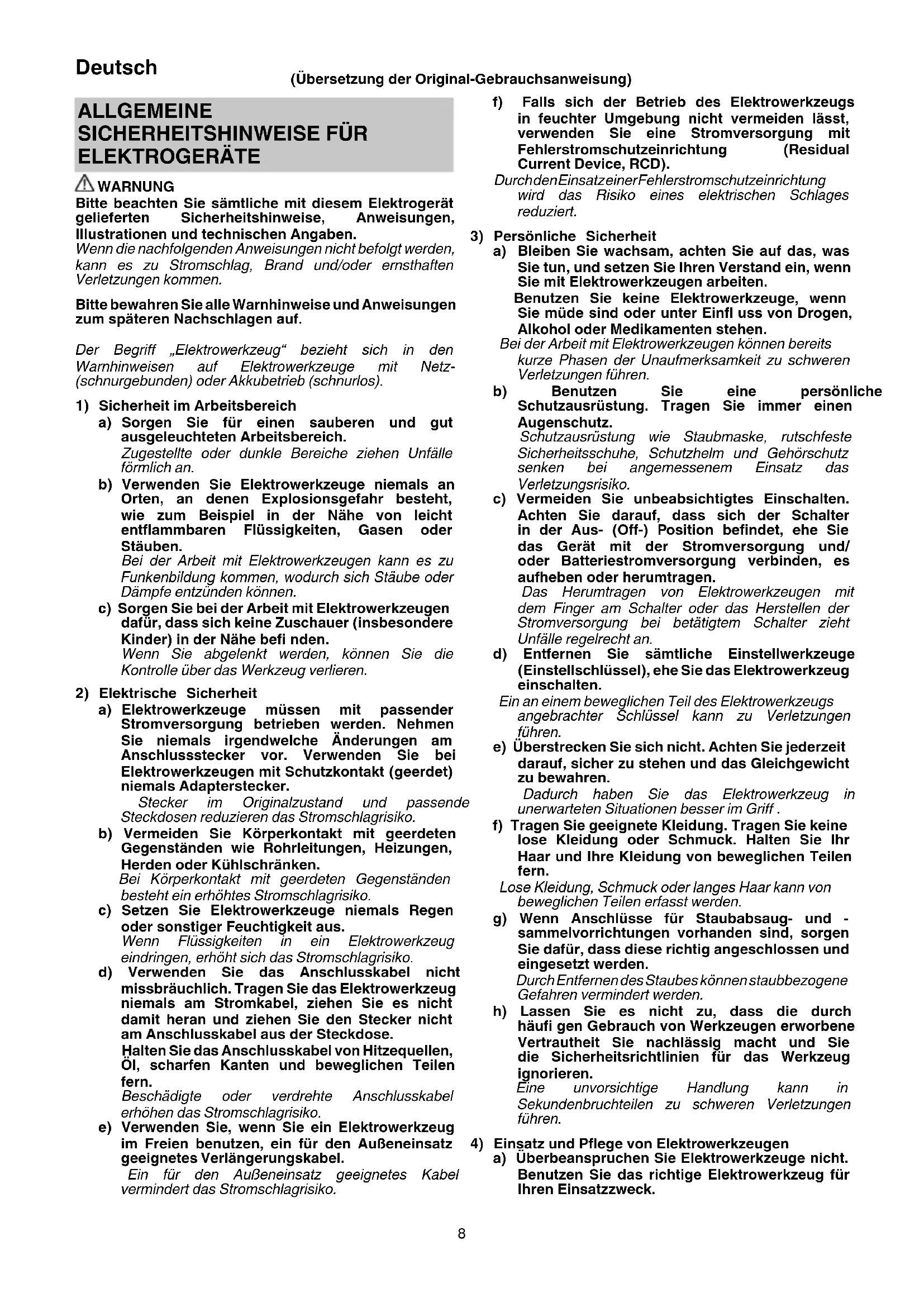 ELEKTROGERÄTE WARNUNG Bitte beachten Sie sämtliche mit diesem Elektrogerät gelieferten Sicherheitshinweise, Anweisungen, Illustrationen und technischen Angaben. Wenn die nachfolgenden Anweisungen nicht befolgt werden, kann es zu Stromschlag, Brand und/oder ernsthaften Verletzungen kommen. Bitte bewahren Sie alle Warnhinweise und Anweisungen zum späteren Nachschlagen auf. Der Begriff „Elektrowerkzeug“ bezieht sich in den Warnhinweisen auf Elektrowerkzeuge mit Netz- (schnurgebunden) oder Akkubetrieb (schnurlos).