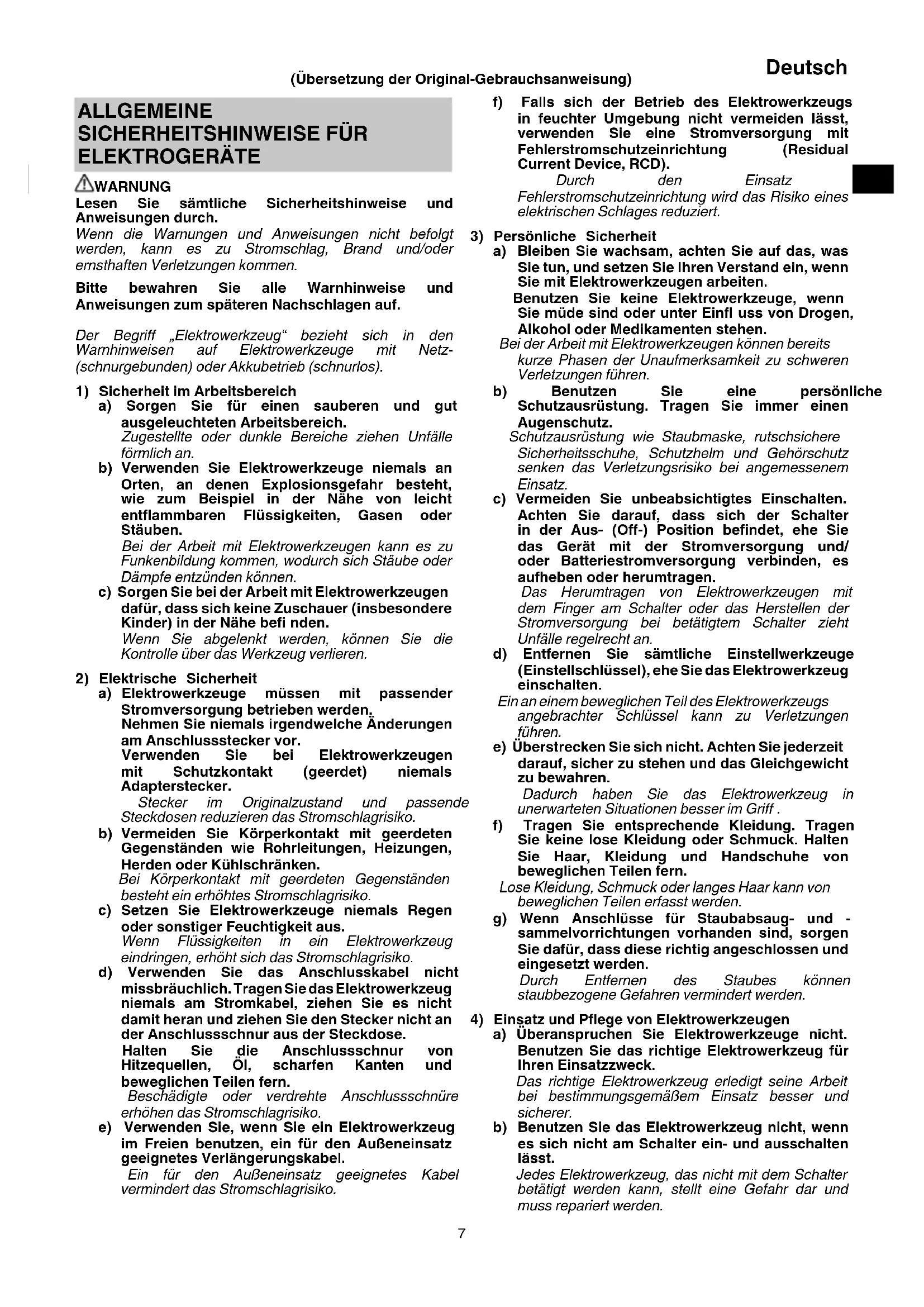 a) Überanspruchen Sie Elektrowerkzeuge nicht. Benutzen Sie das richtige Elektrowerkzeug für Ihren Einsatzzweck. Das richtige Elektrowerkzeug erledigt seine Arbeit bei bestimmungsgemäßem Einsatz besser und sicherer. b) Benutzen Sie das Elektrowerkzeug nicht, wenn es sich nicht am Schalter ein- und ausschalten lässt. Jedes Elektrowerkzeug, das nicht mit dem Schalter betätigt werden kann, stellt eine Gefahr dar und muss repariert werden. ALLGEMEINE
