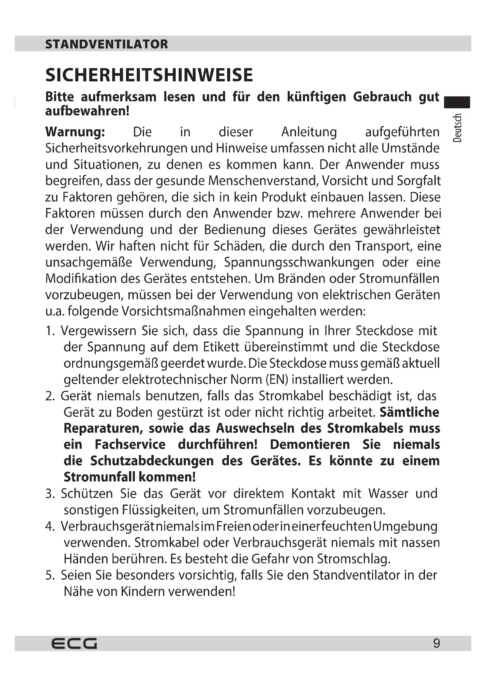 STANDVENTILATOR SICHERHEITSHINWEISE Bitte aufmerksam lesen und für den künftigen Gebrauch gut aufbewahren! Warnung: Die in dieser Anleitung aufgeführten Sicherheitsvorkehrungen und Hinweise umfassen nicht alle Umstände und Situationen, zu denen es kommen kann. Der Anwender muss begreifen, dass der gesunde Menschenverstand, Vorsicht und Sorgfalt zu Faktoren gehören, die sich in kein Produkt einbauen lassen. Diese Faktoren müssen durch den Anwender bzw. mehrere Anwender bei der Verwendung und der Bedienung dieses Gerätes gewährleistet werden. Wir haften nicht für Schäden, die durch den Transport, eine unsachgemäße Verwendung, Spannungsschwankungen oder eine Modikation des Gerätes entstehen. Um Bränden oder Stromunfällen vorzubeugen, müssen bei der Verwendung von elektrischen Geräten u.a. folgende Vorsichtsmaßnahmen eingehalten werden: