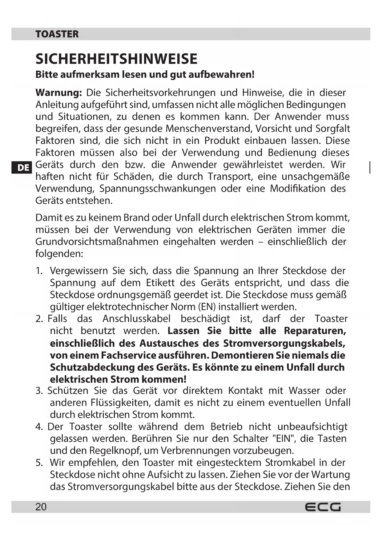 - Verwenden Sie das Gerät nur gemäß den in dieser Anleitung aufgeführten Hinweisen. Diese Toaster ist nur für den privaten nicht-gewerblichen Gebrauch bestimmt. Der Hersteller haftet nicht für Schäden, die durch eine unsachgemäße Verwendung desses Gerätes entwickeln sind.
