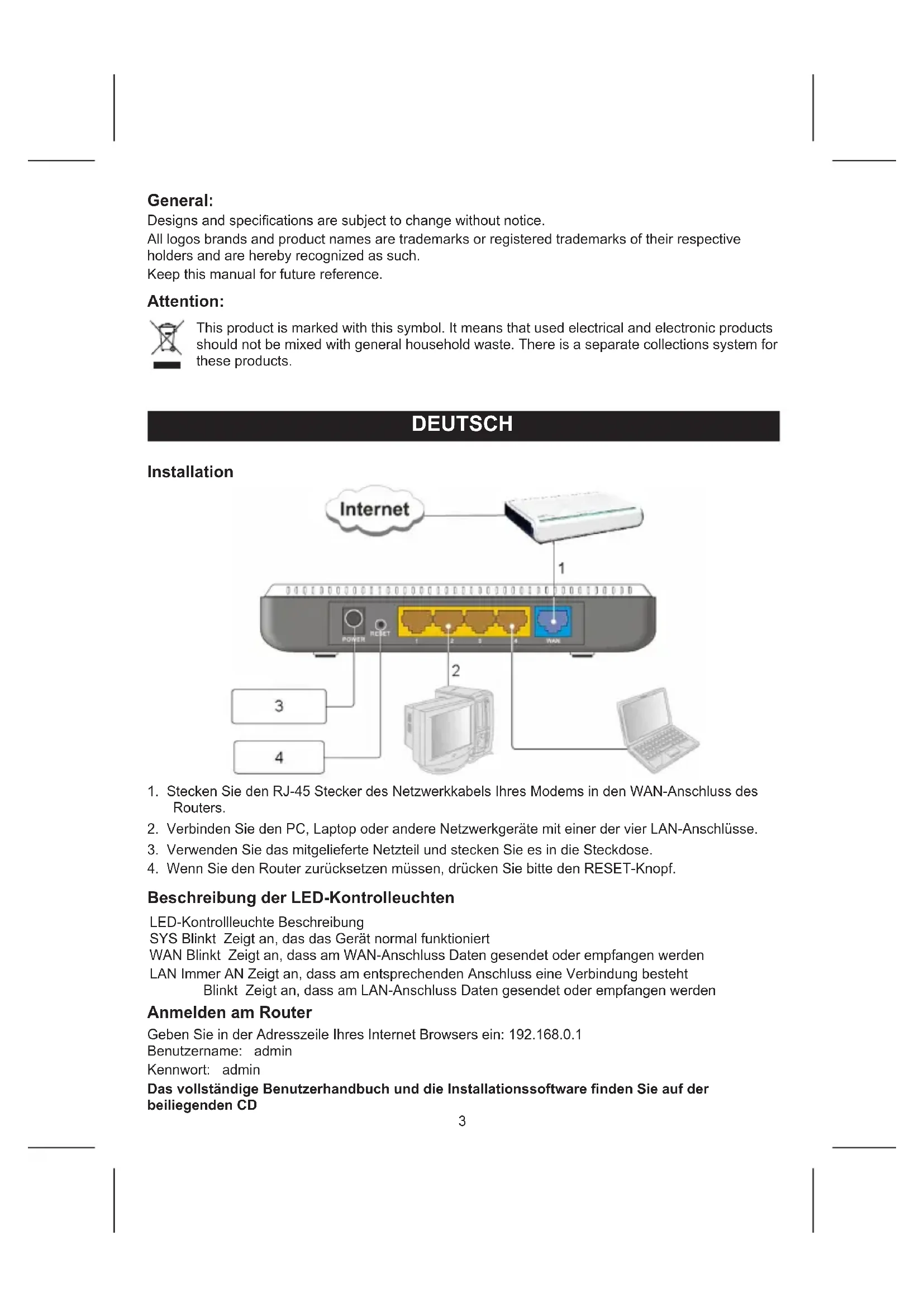 Beschreibung der LED-Kontrolleuchten LED-Kontrollleuchte Beschreibung SYS Blinkt Zeigt an, das das Gerät normal funktioniert WAN Blinkt Zeigt an, dass am WAN-Anschluss Daten gesendet oder empfangen werden LAN Immer AN Zeigt an, dass am entsprechenden Anschluss eine Verbindung besteht Blinkt Zeigt an, dass am LAN-Anschluss Daten gesendet oder empfangen werden Anmelden am Router Geben Sie in der Adresszeile Ihres Internet Browsers ein: 192.168.0.1 Benutzername: admin Kennwort: admin Das vollständige Benutzerhandbuch und die Installationssoftware nden Sie auf der beiliegenden CD4 Sicherheitsvorkehrungen: Um das Risiko eines elektrischen Schlags zu verringern, sollte dieses Produkt AUSSCHLIESSLICH von einem autorisierten Techniker geöffnet werden. Bei Problemen trennen Sie das Gerät bitte von der Spannungsversorgung und von anderen Geräten ab. Stellen Sie sicher, dass das Gerät nicht mit Wasser oder Feuchtigkeit in Berührung kommt. Wartung: Nur mit einem trockenen Tuch säubern. Keine Reinigungs- oder Scheuermittel verwenden. Garantie: Es kann keine Garantie oder Haftung für irgendwelche Änderungen oder Modikationen des Produkts oder für Schäden übernommen werden, die aufgrund einer nicht ordnungsgemäßen Anwendung des Produkts entstanden sind. Allgemeines: Design und technische Daten können ohne vorherige Ankündigung geändert werden. Alle Logos, Marken und Produktnamen sind Marken oder eingetragene Marken ihrer jeweiligen Eigentümer und werden hiermit als solche anerkannt. Bitte bewahren Sie Bedienungsanleitung und Verpackung für spätere Verwendung auf. Achtung: Dieses Produkt ist mit diesem Symbol gekennzeichnet. Es bedeutet, dass die ausgedienten elektrischen und elektronischen Produkte nicht mit dem allgemeinen Haushaltsmüll entsorgt werden dürfen. Für diese Produkte stehen gesonderte Sammelsysteme zur Verfügung. FRANÇAIS Installation