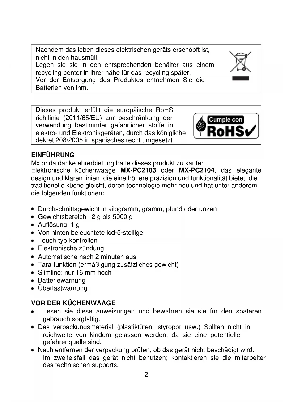 Dieses produkt erfüllt die europäische RoHS- richtlinie (2011/65/EU) zur beschränkung der verwendung bestimmter gefährlicher stoffe in elektro- und Elektronikgeräten, durch das königliche dekret 208/2005 in spanisches recht umgesetzt. EINFÜHRUNG Mx onda danke ehrerbietung hatte dieses produkt zu kaufen. Elektronische küchenwaage MX-PC2103 oder MX-PC2104, das elegante design und klaren linien, die eine höhere präzision und funktionalität bietet, die traditionelle küche gleicht, deren technologie mehr neu und hat unter anderem die folgenden funktionen: Durchschnittsgewicht in kilogramm, gramm, pfund oder unzen Gewichtsbereich : 2 g bis 5000 g Auflösung: 1 g Von hinten beleuchtete lcd-5-stellige Touch-typ-kontrollen Elektronische zündung Automatische nach 2 minuten aus Tara-funktion (ermäßigung zusätzliches gewicht) Slimline: nur 16 mm hoch Batteriewarnung Überlastwarnung