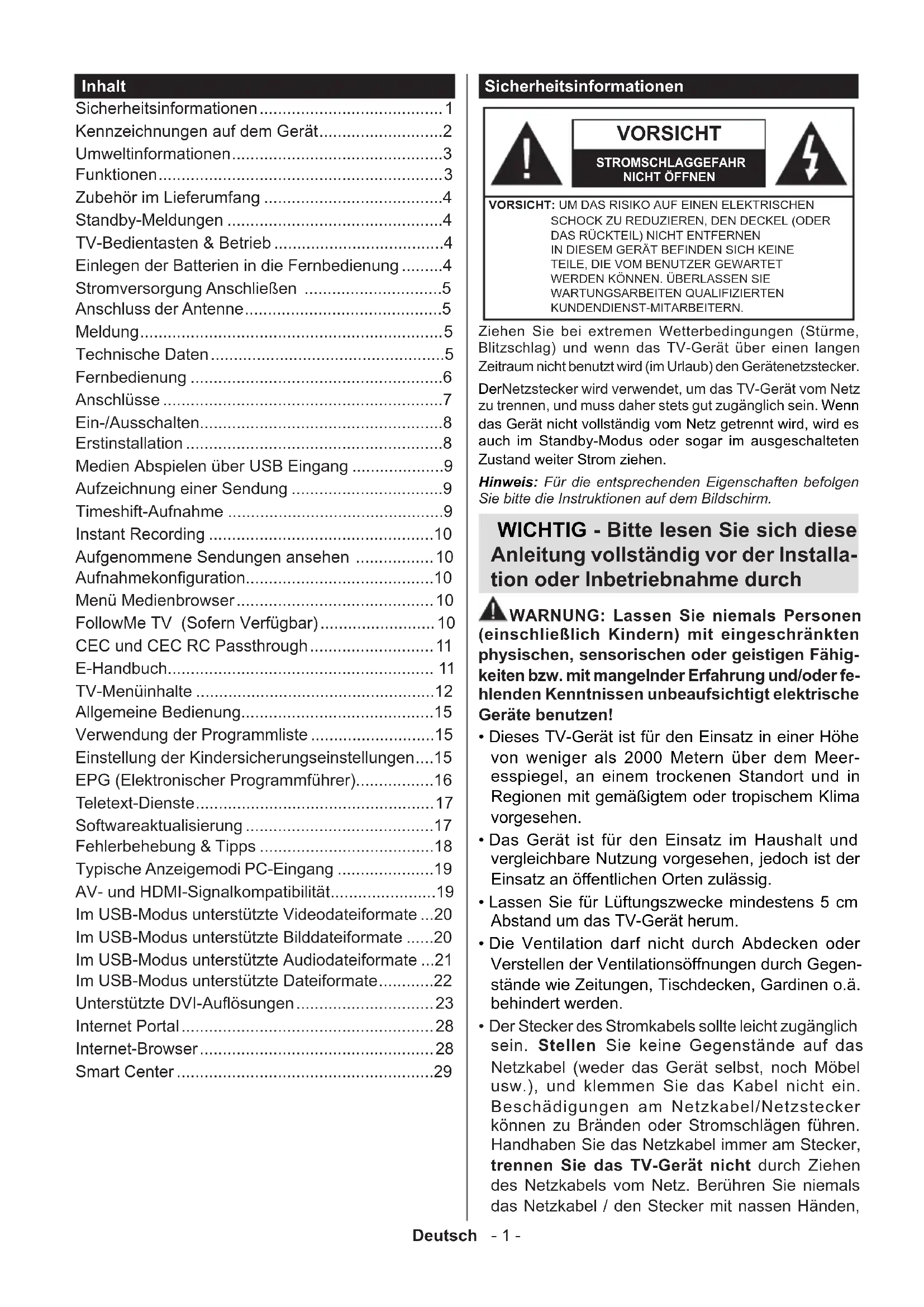 - Der Stecker des Stromkabels sollte leicht zugänglich sein. Stellen Sie keine Gegenstände auf das Netzkabel (weder das Gerät selbst, noch Möbel usw.), und klemmen Sie das Kabel nicht ein. Beschädigungen am Netzkabel/Netzstecker können zu Bränden oder Stromschlägen führen. Handhaben Sie das Netzkabel immer am Stecker, trennen Sie das TV-Gerät nicht durch Ziehen des Netzkabels vom Netz. Berühren Sie niemals das Netzkabel / den Stecker mit nassen Händen, Inhalt Sicherheitsinformationen ........................................ 1 Kennzeichnungen auf dem Gerät ...........................2 Umweltinformationen ..............................................3 Funktionen .............................................................. 3 Zubehör im Lieferumfang .......................................4 Standby-Meldungen ...............................................4 TV-Bedientasten & Betrieb .....................................4 Einlegen der Batterien in die Fernbedienung .........4 Stromversorgung Anschließen ..............................5 Anschluss der Antenne ...........................................5 Meldung .................................................................. 5 Technische Daten ...................................................5 Fernbedienung .......................................................6 Anschlüsse .............................................................7 Ein-/Ausschalten.....................................................8 Erstinstallation ........................................................8 Medien Abspielen über USB Eingang ....................9 Aufzeichnung einer Sendung .................................9 Timeshift-Aufnahme ...............................................9 Instant Recording .................................................10 Aufgenommene Sendungen ansehen ................. 10 Aufnahmekonguration.........................................10 Menü Medienbrowser ........................................... 10 FollowMe TV (Sofern Verfügbar) ......................... 10 CEC und CEC RC Passthrough ........................... 11 E-Handbuch.......................................................... 11 TV-Menüinhalte ....................................................12 Allgemeine Bedienung..........................................15 Verwendung der Programmliste ...........................15 Einstellung der Kindersicherungseinstellungen ....15 EPG (Elektronischer Programmführer).................16 Teletext-Dienste .................................................... 17 Softwareaktualisierung .........................................17 Fehlerbehebung & Tipps ......................................18 Typische Anzeigemodi PC-Eingang .....................19 AV- und HDMI-Signalkompatibilität .......................19 Im USB-Modus unterstützte Videodateiformate ...20 Im USB-Modus unterstützte Bilddateiformate ......20 Im USB-Modus unterstützte Audiodateiformate ...21 Im USB-Modus unterstützte Dateiformate ............22 UnterstützteDVI-Auösungen .............................. 23 Internet Portal ....................................................... 28 Internet-Browser ................................................... 28 Smart Center ........................................................29Deutsch - 2 - da dies einen Kurzschluss oder elektrischen Schlag verursachen kann. Machen Sie niemals Knoten in das Netzkabel, und binden Sie es nie mit anderen Kabeln zusammen. Wenn es bes- chädigt ist, muss das Kabel ersetzt werden. Diese Arbeit darf ausschließlichdurcheine qualizierte Fachkraft ausgeführt werden.
