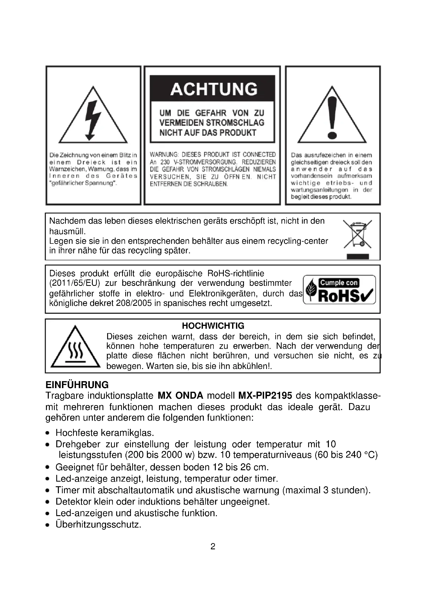 HOCHWICHTIG Dieses zeichen warnt, dass der bereich, in dem sie sich befindet, können hohe temperaturen zu erwerben. Nach der verwendung der platte diese flächen nicht berühren, und versuchen sie nicht, es zu bewegen. Warten sie, bis sie ihn abkühlen!. EINFÜHRUNG Tragbare induktionsplatte MX ONDA modell MX-PIP2195 des kompaktklasse- mit mehreren funktionen machen dieses produkt das ideale gerät. Dazu gehören unter anderem die folgenden funktionen: Hochfeste keramikglas. Drehgeber zur einstellung der leistung oder temperatur mit 10 leistungsstufen (200 bis 2000 w) bzw. 10 temperaturniveaus (60 bis 240 °C) Geeignet für behälter, dessen boden 12 bis 26 cm. Led-anzeige anzeigt, leistung, temperatur oder timer. Timer mit abschaltautomatik und akustische warnung (maximal 3 stunden). Detektor klein oder induktions behälter ungeeignet. Led-anzeigen und akustische funktion. Überhitzungsschutz. Nachdem das leben dieses elektrischen geräts erschöpft ist, nicht in den hausmüll. Legen sie sie in den entsprechenden behälter aus einem recycling-center in ihrer nähe für das recycling später. Dieses produkt erfüllt die europäische RoHS-richtlinie (2011/65/EU) zur beschränkung der verwendung bestimmter gefährlicher stoffe in elektro- und Elektronikgeräten, durch das königliche dekret 208/2005 in spanisches recht umgesetzt.3