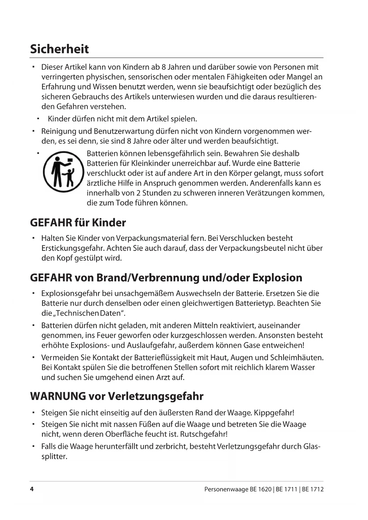 Personenwaage BE 1620 | BE 1711 | BE 1712 Sicherheit Dieser Artikel kann von Kindern ab 8 Jahren und darüber sowie von Personen mit verringerten physischen, sensorischen oder mentalen Fähigkeiten oder Mangel an Erfahrung und Wissen benutzt werden, wenn sie beaufsichtigt oder bezüglich des sicheren Gebrauchs des Artikels unterwiesen wurden und die daraus resultieren- den Gefahren verstehen. Kinder dürfen nicht mit dem Artikel spielen. Reinigung und Benutzerwartung dürfen nicht von Kindern vorgenommen wer- den, es sei denn, sie sind 8 Jahre oder älter und werden beaufsichtigt.