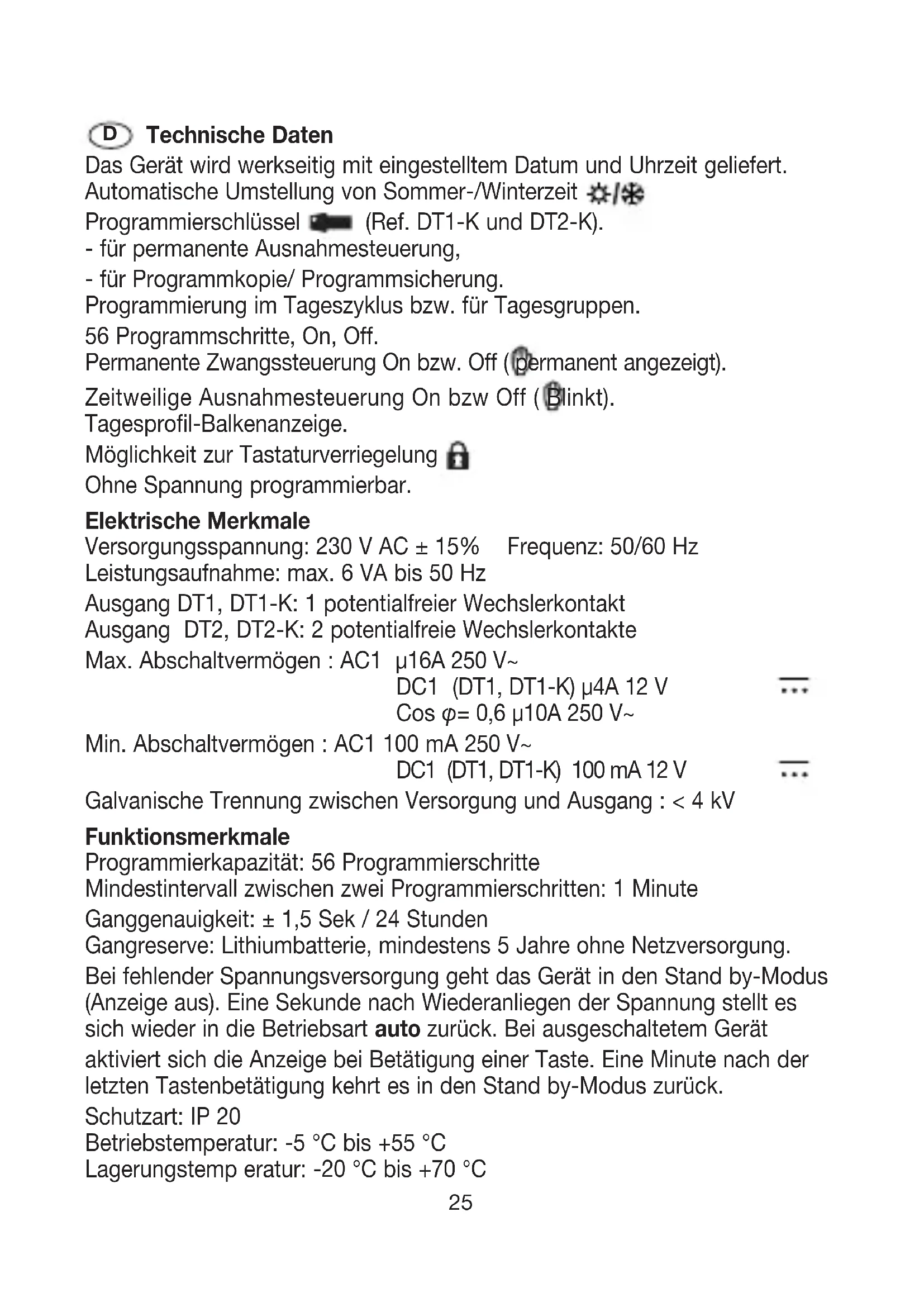 - für permanente Ausnahmesteuerung, - für Programmkopie/ Programmsicherung. Programmierung im Tageszyklus bzw. für Tagesgruppen. 56 Programmschritte, On, Off. Permanente Zwangssteuerung On bzw. Off ( permanent angezeigt). Zeitweilige Ausnahmesteuerung On bzw Off ( Blinkt). Tagesprofil-Balkenanzeige. Möglichkeit zur Tastaturverriegelung . Ohne Spannung programmierbar. Elektrische Merkmale Versorgungsspannung: 230 V AC ± 15% Frequenz: 50/60 Hz Leistungsaufnahme: max. 6 VA bis 50 Hz Ausgang DT1, DT1-K: 1 potentialfreier Wechslerkontakt Ausgang DT2, DT2-K: 2 potentialfreie Wechslerkontakte Max. Abschaltvermögen : AC1 µ16A 250 V~ DC1 (DT1, DT1-K) µ4A 12 V Cos φ = 0,6 µ10A 250 V~ Min. Abschaltvermögen : AC1 100 mA 250 V~ DC1 (DT1, DT1-K) 100 mA 12 V Galvanische Trennung zwischen Versorgung und Ausgang : < 4 kV Funktionsmerkmale Programmierkapazität: 56 Programmierschritte Mindestintervall zwischen zwei Programmierschritten: 1 Minute Ganggenauigkeit: ± 1,5 Sek / 24 Stunden Gangreserve: Lithiumbatterie, mindestens 5 Jahre ohne Netzversorgung. Bei fehlender Spannungsversorgung geht das Gerät in den Stand by-Modus (Anzeige aus). Eine Sekunde nach Wiederanliegen der Spannung stellt es sich wieder in die Betriebsart auto zurück. Bei ausgeschaltetem Gerät aktiviert sich die Anzeige bei Betätigung einer Taste. Eine Minute nach der letzten Tastenbetätigung kehrt es in den Stand by-Modus zurück. Schutzart: IP 20 Betriebstemperatur: -5 °C bis +55 °C Lagerungstemp eratur: -20 °C bis +70 °C D26 230 V 2300 W 2300 W 500 W mit Vorschalt- gerät // (max. 45 µF) 400 W ohne Vorschaltgerät mit Vorschaltgerät in Serienschaltung 1000 W