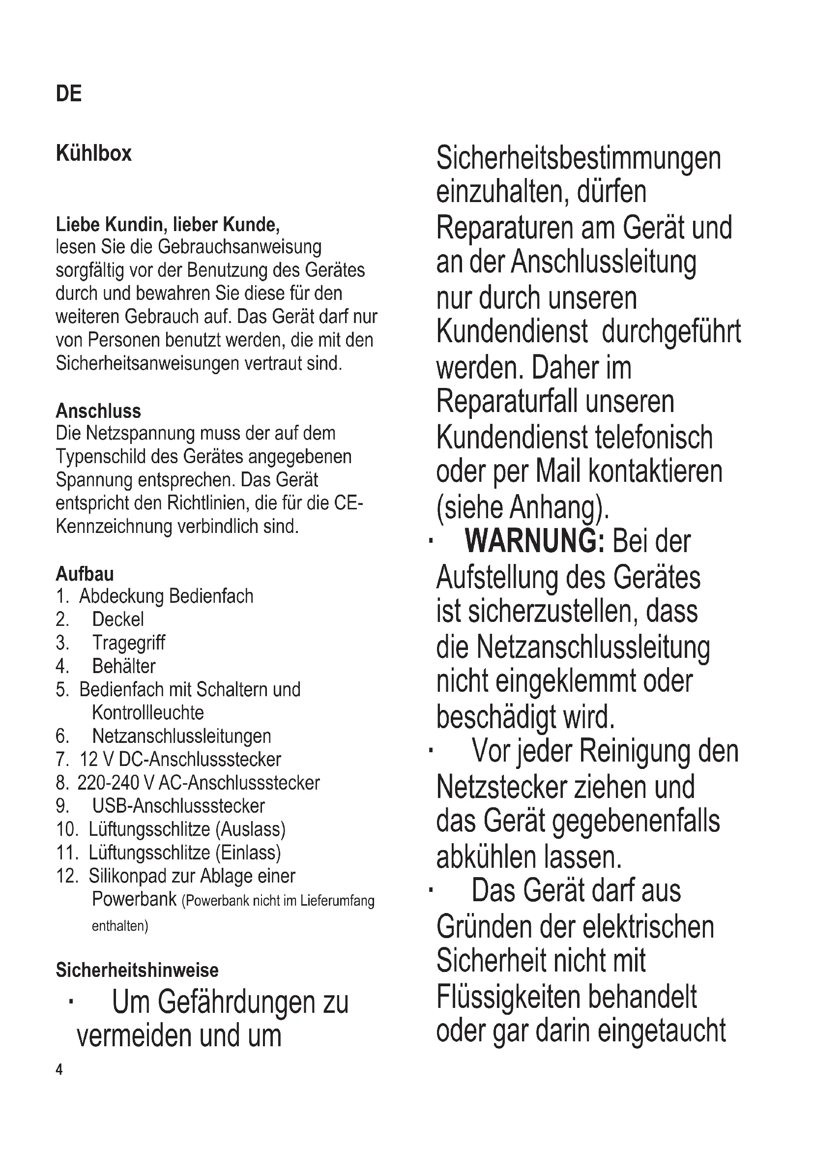 104 x 142 mm Kühlbox Liebe Kundin, lieber Kunde, lesen Sie die Gebrauchsanweisung sorgfältig vor der Benutzung des Gerätes durch und bewahren Sie diese für den weiteren Gebrauch auf. Das Gerät darf nur von Personen benutzt werden, die mit den Sicherheitsanweisungen vertraut sind. Anschluss Die Netzspannung muss der auf dem Typenschild des Gerätes angegebenen Spannung entsprechen. Das Gerät entspricht den Richtlinien, die für die CE- Kennzeichnung verbindlich sind. Aufbau