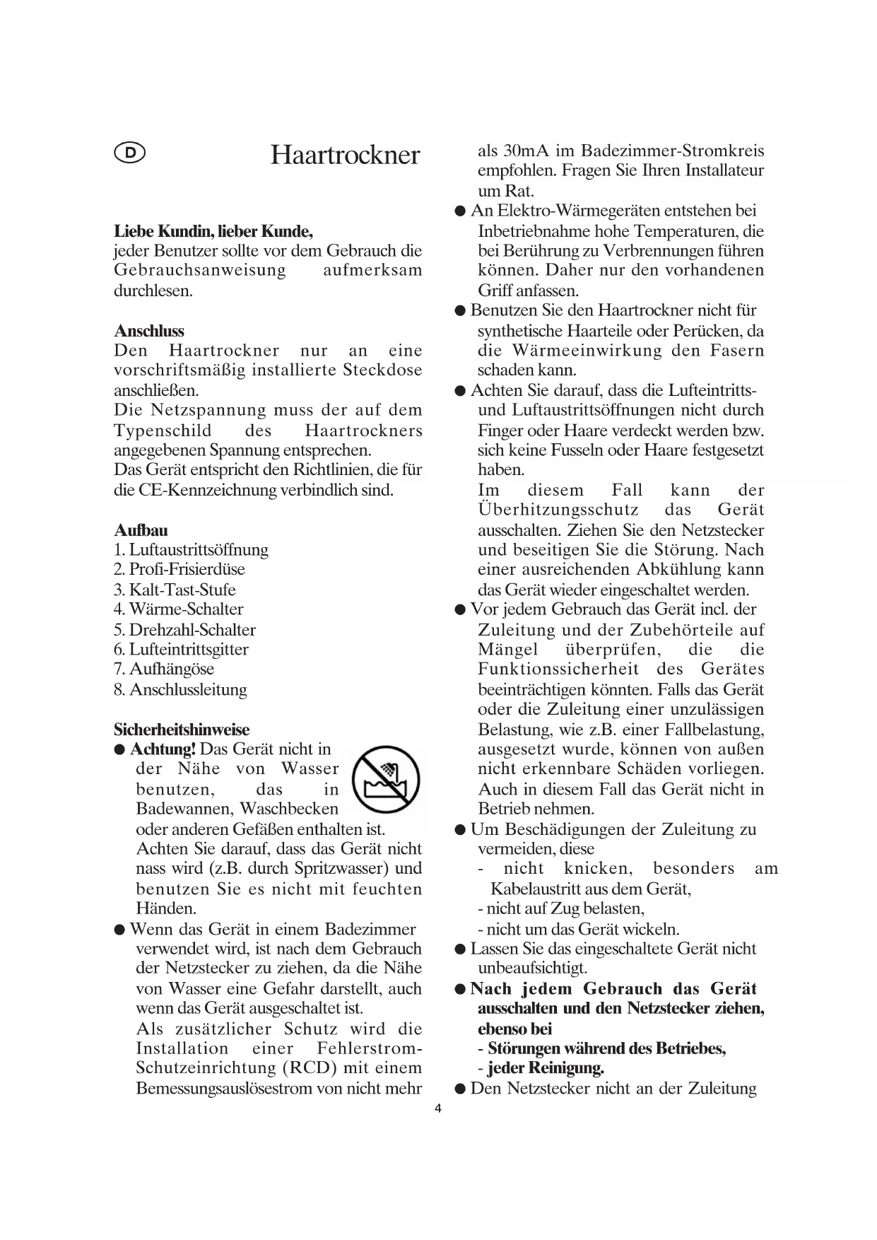 5Liebe Kundin, lieber Kunde, jeder Benutzer sollte vor dem Gebrauch die Gebrauchsanweisung aufmerksam durchlesen. Anschluss Den Haartrockner nur an eine vorschriftsmäßig installierte Steckdose anschließen. Die Netzspannung muss der auf dem Typenschild des Haartrockners angegebenen Spannung entsprechen. Das Gerät entspricht den Richtlinien, die für die CE-Kennzeichnung verbindlich sind. Aufbau