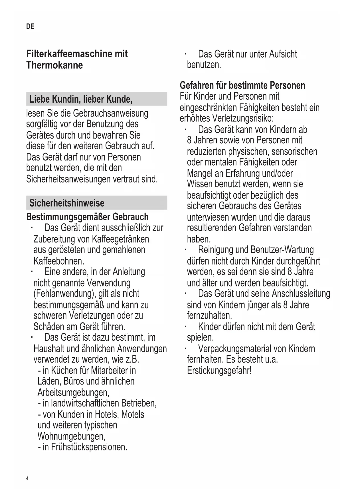 142 x 208 mm Filterkaffeemaschine mit Thermokanne Liebe Kundin, lieber Kunde, lesen Sie die Gebrauchsanweisung sorgfältig vor der Benutzung des Gerätes durch und bewahren Sie diese für den weiteren Gebrauch auf. Das Gerät darf nur von Personen benutzt werden, die mit den Sicherheitsanweisungen vertraut sind. Sicherheitshinweise Bestimmungsgemäßer Gebrauch ∙ Das Gerät dient ausschließlich zur Zubereitung von Kaffeegetränken aus gerösteten und gemahlenen Kaffeebohnen. ∙ Eine andere, in der Anleitung nicht genannte Verwendung (Fehlanwendung), gilt als nicht bestimmungsgemäß und kann zu schweren Verletzungen oder zu Schäden am Gerät führen. ∙ Das Gerät ist dazu bestimmt, im Haushalt und ähnlichen Anwendungen verwendet zu werden, wie z.B. - in Küchen für Mitarbeiter in Läden, Büros und ähnlichen Arbeitsumgebungen, - in landwirtschaftlichen Betrieben, - von Kunden in Hotels, Motels und weiteren typischen Wohnumgebungen, - in Frühstückspensionen. ∙ Das Gerät nur unter Aufsicht benutzen. Gefahren für bestimmte Personen Für Kinder und Personen mit eingeschränkten Fähigkeiten besteht ein erhöhtes Verletzungsrisiko: ∙ Das Gerät kann von Kindern ab 8 Jahren sowie von Personen mit reduzierten physischen, sensorischen oder mentalen Fähigkeiten oder Mangel an Erfahrung und/oder Wissen benutzt werden, wenn sie beaufsichtigt oder bezüglich des sicheren Gebrauchs des Gerätes unterwiesen wurden und die daraus resultierenden Gefahren verstanden haben. ∙ Reinigung und Benutzer-Wartung dürfen nicht durch Kinder durchgeführt werden, es sei denn sie sind 8 Jahre und älter und werden beaufsichtigt. ∙ Das Gerät und seine Anschlussleitung sind von Kindern jünger als 8 Jahre fernzuhalten. ∙ Kinder dürfen nicht mit dem Gerät spielen. ∙ Verpackungsmaterial von Kindern fernhalten. Es besteht u.a. Erstickungsgefahr! DE5 142 x 208 mm Gefahren durch Stromschlag Da das Gerät mit elektrischem Strom betrieben wird, müssen die nachstehenden Hinweise beachtet werden, um einen Stromschlag zu vermeiden: ∙ Vor der Inbetriebnahme das komplette Gerät inkl. Anschlussleitung und eventueller Zubehörteile auf Mängel und Beschädigungen überprüfen, die die Funktionssicherheit des Gerätes beeinträchtigen könnten. Falls das Gerät z.B. zu Boden gefallen ist oder an der Anschlussleitung gezogen wurde, können von außen nicht erkennbare Schäden vorliegen. In diesen Fällen das Gerät nicht in Betrieb nehmen. ∙ Das Gerät nur an eine vorschriftsmäßig installierte Schutzkontaktsteckdose anschließen. Die Netzspannung muss der auf dem Typenschild des Gerätes angegebenen Spannung entsprechen. ∙ Den Netzstecker ziehen - nach jedem Gebrauch, - bei Störungen während des Betriebes, - vor jeder Reinigung. ∙ Den Netzstecker nicht an der Anschlussleitung aus der Steckdose ziehen, sondern den Netzstecker anfassen. ∙ Den Netzstecker nicht mit nassen Händen anfassen.