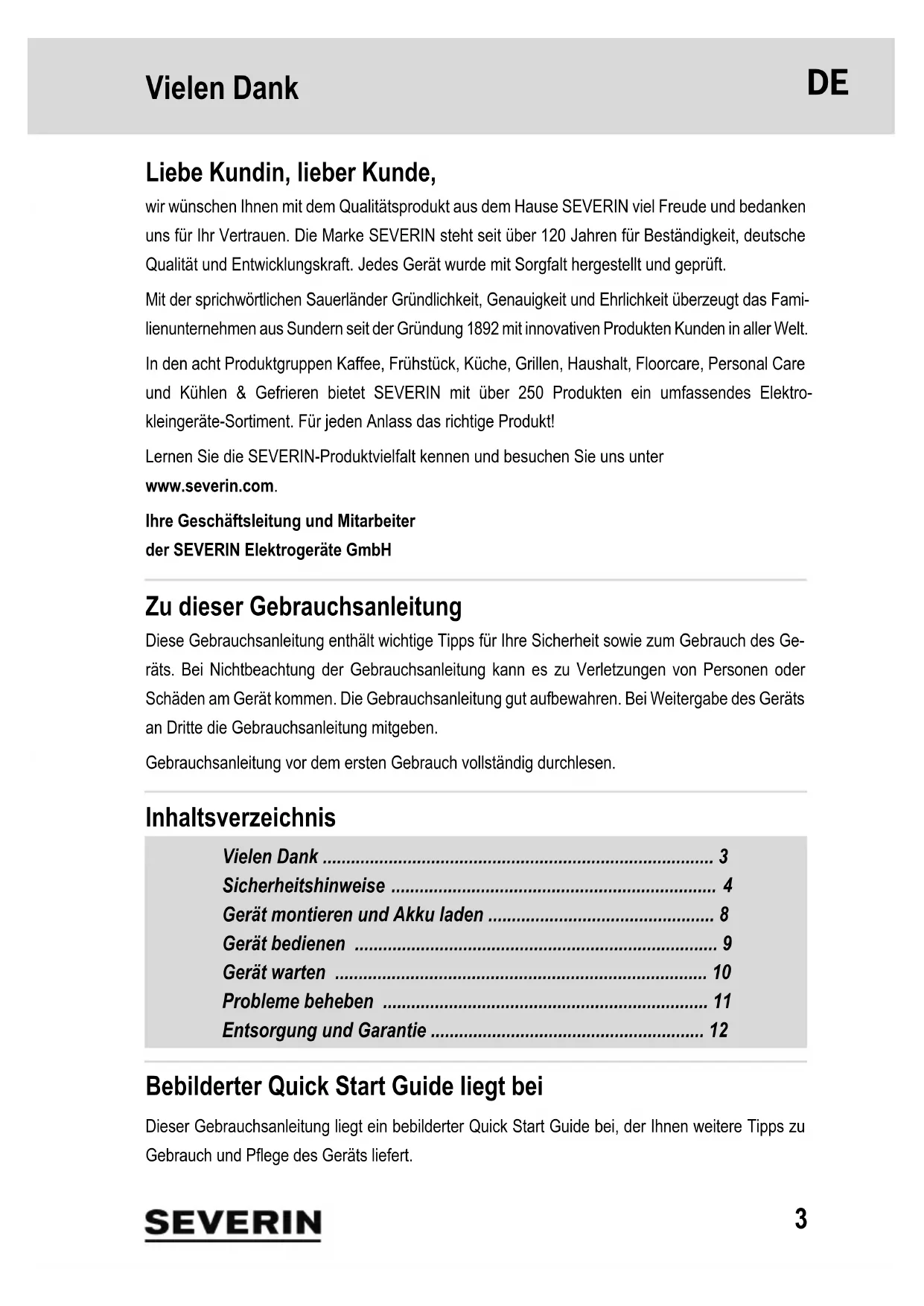 Für weitere Informationen siehe bebilderter Quick Start Guide.11 Probleme beheben 6 Probleme be heben Probleme selbst beheben Damit möglichst gar keine Probleme auftreten, ist es wichtig, den Staubbehälter rechtzeitig zu lee- ren sowie bei dieser Gelegenheit den Motorschutzfilter zu kontrollieren und zu reinigen. Servicehotline Falls Sie das Problem anhand der Tabelle nicht beheben können, rufen Sie unsere Servicehotline an (siehe Kontaktdaten im Anhang dieser Gebrauchsanleitung). Ersatzteile bestellen Ersatzteile oder Zubehör können Sie im Internet unter https://shop.severin.com/shop/search oder über unseren Kundendienst bequem bestellen. Problem mögliche Ursache / Lösung Gerät lässt sich nicht einschalten. Sicherstellen, dass länger als 1 Sekunde gedrückt wurde, um das Gerät einzuschalten. Akku ist völlig leer. Gerät ausschalten und Akku laden, Kapitel „Akku la- den“. Gerät lässt sich nicht laden (LEDs blinken nicht). Netzteil ist nicht korrekt eingesteckt. Prüfen, ob Netzteilstecker bzw. Netz- teiladapter korrekt in ihren Buchsen sitzen, Kapitel „Akku laden“. Akku ist nicht korrekt in das Gerät eingesetzt. Netzteil trennen. Akku erneut in das Gerät einsetzen. Netzteil erneut anschließen. Gerät nimmt kaum Schmutz auf. Staubbehälter muss geleert oder Motorschutzfilter und Zykloneneinheit muss gereinigt werden, Kapitel „Gerät warten“. Betriebsdauer ver- kürzt sich zuneh- mend. Bürstwalze ist verschmutzt und muss gereinigt werden, Kapitel „Bürst- walze reinigen“. Bürstwalze dreht sich langsam oder unregelmäßig. Bürstwalze ist verschmutzt und muss gereinigt werden, Kapitel „Bürst- walze reinigen“. Artikelnummer Beschreibung 106-048 Motorschutzfilter 3567-048 Bürstwalze 5424-048 Akku 22,2 V12 Entsorgung und Garantie 7 Entsorgung und Garanti e Akku ausbauen