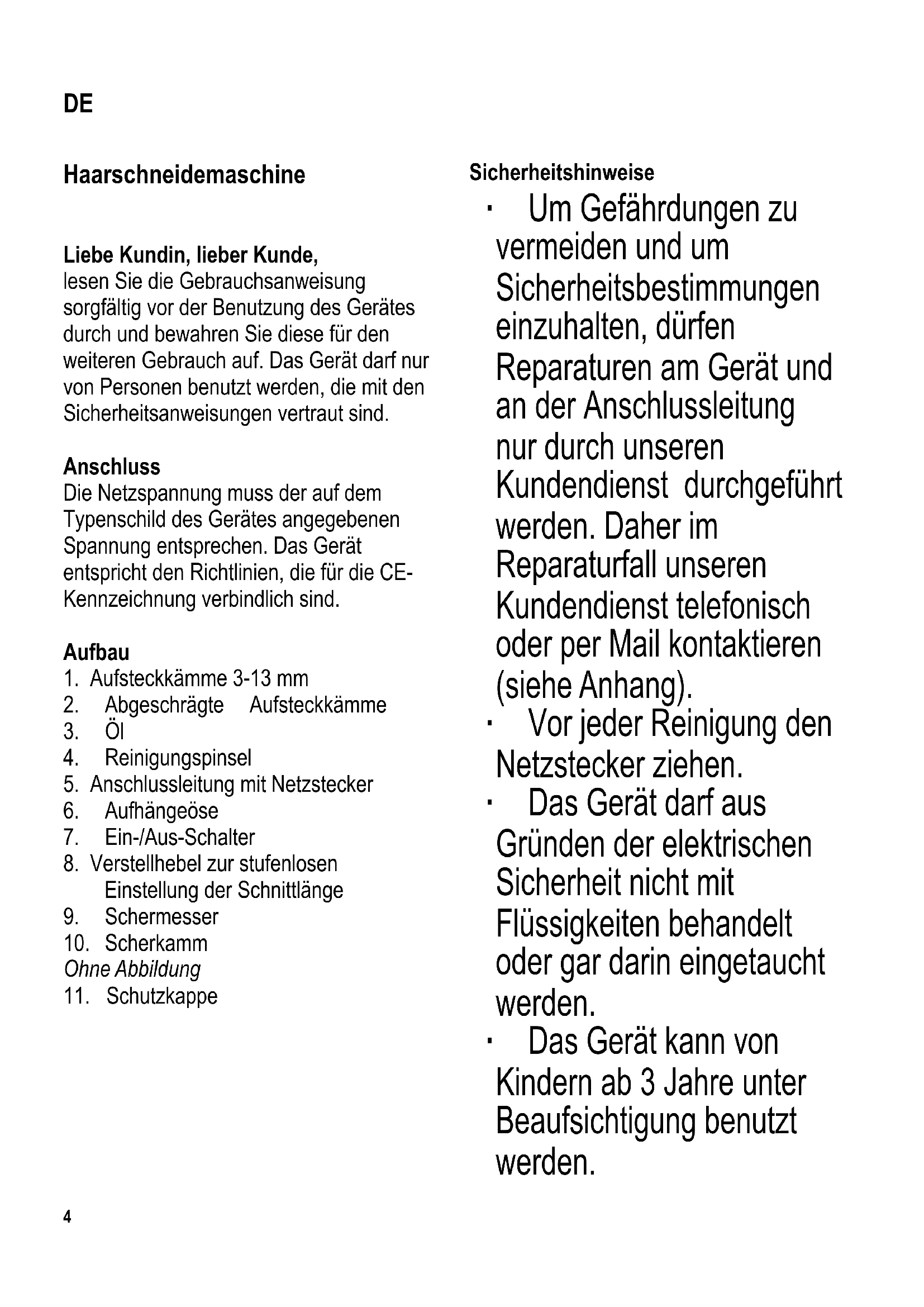 Haarschneidemaschine Liebe Kundin, lieber Kunde, lesen Sie die Gebrauchsanweisung sorgfältig vor der Benutzung des Gerätes durch und bewahren Sie diese für den weiteren Gebrauch auf. Das Gerät darf nur von Personen benutzt werden, die mit den Sicherheitsanweisungen vertraut sind. Anschluss Die Netzspannung muss der auf dem Typenschild des Gerätes angegebenen Spannung entsprechen. Das Gerät entspricht den Richtlinien, die für die CE- Kennzeichnung verbindlich sind. Aufbau