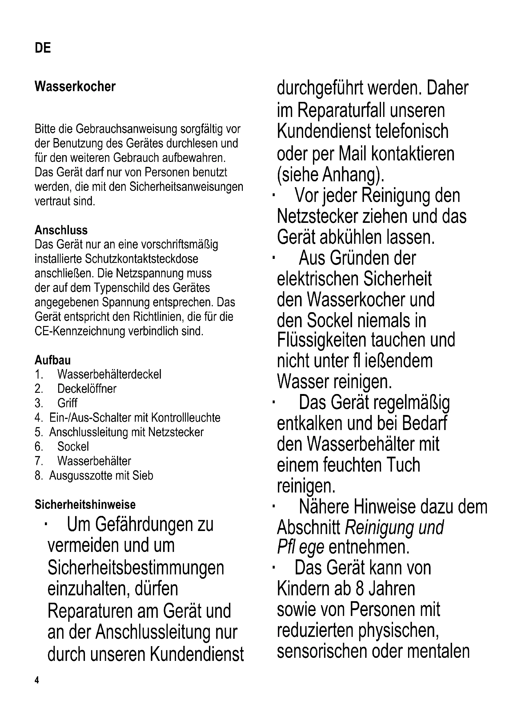 Sicherheitshinweise ∙ Um Gefährdungen zu vermeiden und um Sicherheitsbestimmungen einzuhalten, dürfen Reparaturen am Gerät und an der Anschlussleitung nur durch unseren Kundendienst durchgeführt werden. Daher im Reparaturfall unseren Kundendienst telefonisch oder per Mail kontaktieren (siehe Anhang). ∙ Vor jeder Reinigung den Netzstecker ziehen und das Gerät abkühlen lassen. ∙ Aus Gründen der elektrischen Sicherheit den Wasserkocher und den Sockel niemals in Flüssigkeiten tauchen und nicht unter fl ießendem Wasser reinigen. ∙ Das Gerät regelmäßig entkalken und bei Bedarf den Wasserbehälter mit einem feuchten Tuch reinigen. ∙ Nähere Hinweise dazu dem Abschnitt Reinigung und Pfl ege entnehmen. ∙ Das Gerät kann von Kindern ab 8 Jahren sowie von Personen mit reduzierten physischen, sensorischen oder mentalen DE5 Fähigkeiten oder Mangel an Erfahrung und/oder Wissen benutzt werden, wenn sie beaufsichtigt oder bezüglich des sicheren Gebrauchs des Gerätes unterwiesen wurden und die daraus resultierenden Gefahren verstanden haben. ∙ Kinder dürfen nicht mit dem Gerät spielen. ∙ Reinigung und Benutzer- Wartung dürfen nicht durch Kinder durchgeführt werden, es sei denn sie sind 8 Jahre oder älter und werden beaufsichtigt. ∙ Kinder jünger als 8 Jahre sind vom Gerät und der Anschlussleitung fernzuhalten. ∙ Das Gerät ist dazu bestimmt, im Haushalt und ähnlichen Anwendungen verwendet zu werden, wie z.B. - in Küchen für Mitarbeiter, in Läden, Büros und ähnlichen Arbeitsumgebungen, - in landwirtschaftlichen Betrieben, - von Kunden in Hotels, Motels und weiteren typischen Wohnumgebungen, - in Frühstückspensionen. ∙ Die Gehäuseoberfl ächen sind bei und nach dem Betrieb heiß. ∙ Den Wasserkocher nur unter Aufsicht mit reinem Wasser betreiben. Bitte die Min- (0,5 l) und Max- Markierungen (1,0 l) für die Füllmenge beachten. Bei Überfüllung kann kochendes Wasser herausspritzen. ∙ Auch auf austretenden Dampf im Deckelbereich achten (Verbrühungsgefahr!). Deshalb den Wasserkocher bei Betrieb nur im Griffbereich berühren. ∙ Achtung! Der Deckel muss beim Kochvorgang und beim Ausschütten geschlossen6 bleiben. ∙ Der Wasserbehälter darf nur mit dem vorgesehenen Sockel betrieben werden. ∙ Den Wasserbehälter nur vom Sockel abnehmen oder aufsetzen, wenn das Gerät ausgeschaltet ist. ∙ Der elektrische Kontakt am Sockel muss vor Spritzwasser geschützt werden. ∙ Vorsicht! Missbrauch des Gerätes kann zu Verletzungen führen. ∙ Kinder von Verpackungsmaterial fernhalten. Es besteht u.a. Erstickungsgefahr! ∙ Vor der Inbetriebnahme das komplette Gerät inkl. Anschlussleitung und eventueller Zubehörteile auf Mängel und Beschädigungen überprüfen, die die Funktionssicherheit des Gerätes beeinträchtigen könnten. Falls das Gerät z.B. zu Boden gefallen ist oder an der Anschlussleitung gezogen wurde, können von außen nicht erkennbare Schäden vorliegen. In diesen Fällen das Gerät nicht in Betrieb nehmen. ∙ Das Gerät auf eine wärmebeständige ebene Fläche stellen. ∙ Das Gerät darf während der Inbetriebnahme nicht unter Hängeschränken stehen, da der Dampf sich darunter stauen kann. ∙ Weder das Gerät noch die Anschlussleitung dürfen einer heißen Kochplatte oder offenem Feuer zu nahe kommen. ∙ Die Anschlussleitung nicht herunterhängen lassen und von heißen Geräteteilen fernhalten. ∙ Den Netzstecker ziehen, - bei Störungen während des Betriebes, - nach jedem Gebrauch, - vor jeder Reinigung. ∙ Wird das Gerät falsch bedient, oder zweckentfremdet verwendet, kann keine Haftung für evtl. auftretende Schäden übernommen werden. Überhitzungsschutz Der fest eingestellte Temperaturregler schützt den Heizkörper vor Überhitzung, falls das Gerät versehentlich ohne Wasser eingeschaltet wurde oder die Heizplatte verkalkt ist. Hat der Temperaturregler einmal abgeschaltet, den Wasserkocher erst abkühlen lassen und evtl. entkalken, bevor er erneut betrieben wird. Vor der ersten Inbetriebnahme Aus hygienischen Gründen die erste Kochfüllung des neuen Wasserkochers wegschütten. Kochvorgang ∙ Den Wasserbehälter vom Sockel nehmen. ∙ Den Deckelöffner am Griff drücken, der Deckel klappt auf und die gewünschte Wassermenge kann eingefüllt werden. Bitte die Min- (0,5 l) und Max- Markierungen (1,0 l) für die Füllmenge beachten. ∙ Den Deckel schließen und den Wasserbehälter wieder auf den Sockel7 setzen. ∙ Netzstecker einstecken und den Wasserkocher mit dem Ein-/Ausschalter einschalten, die Kontrollleuchte leuchtet auf. ∙ Der Kochvorgang beginnt und die Dampfstoppautomatik schaltet den Wasserkocher nach Erreichen des Siedepunktes automatisch ab. Die Kontrollleuchte erlischt. ∙ Soll der Kochvorgang vorher beendet werden, den Wasserkocher mit dem Ein-/ Ausschalter ausschalten. ∙ Zum Ausgießen den Wasserbehälter vom Sockel nehmen. ∙ Der Deckel muss beim Ausgießen geschlossen bleiben, damit kein heißer Dampf austritt. ∙ Nach dem Gebrauch den Netzstecker aus der Steckdose ziehen. ∙ Kein Restwasser im Wasserbehälter lassen. Kabelaufwicklung Auf der Unterseite des Sockels befi ndet sich eine Kabelaufwicklung. Die Kabelaufwicklung dient zur Aufbewahrung oder Begrenzung der Kabellänge. Entkalken ∙ Je nach Kalkgehalt des Wassers bilden sich Kalkrückstände auf der Heizplatte. Aus diesem Grund den Wasserkocher regelmäßig entkalken. ∙ Der Garantieanspruch erlischt bei Geräten, die aufgrund mangelnder Entkalkung nicht einwandfrei funktionieren. ∙ Zum Entkalken eignet sich eine Mischung aus einem halben Liter Wasser und 40 ml Essigessenz. ∙ Die Entkalkerlösung einfüllen, ∙ wie gewohnt aufkochen, ∙ kurz einwirken lassen. ∙ Zur Reinigung den Wasserbehälter mit klarem Wasser ausspülen. ∙ Dabei für eine ausreichende Lüftung sorgen und den Essigdampf nicht einatmen. ∙ Entkalkungsmittel nicht in emaillierte Abfl ussbecken gießen. Sieb Bei starker Verschmutzung kann das Sieb in der Ausgusszo