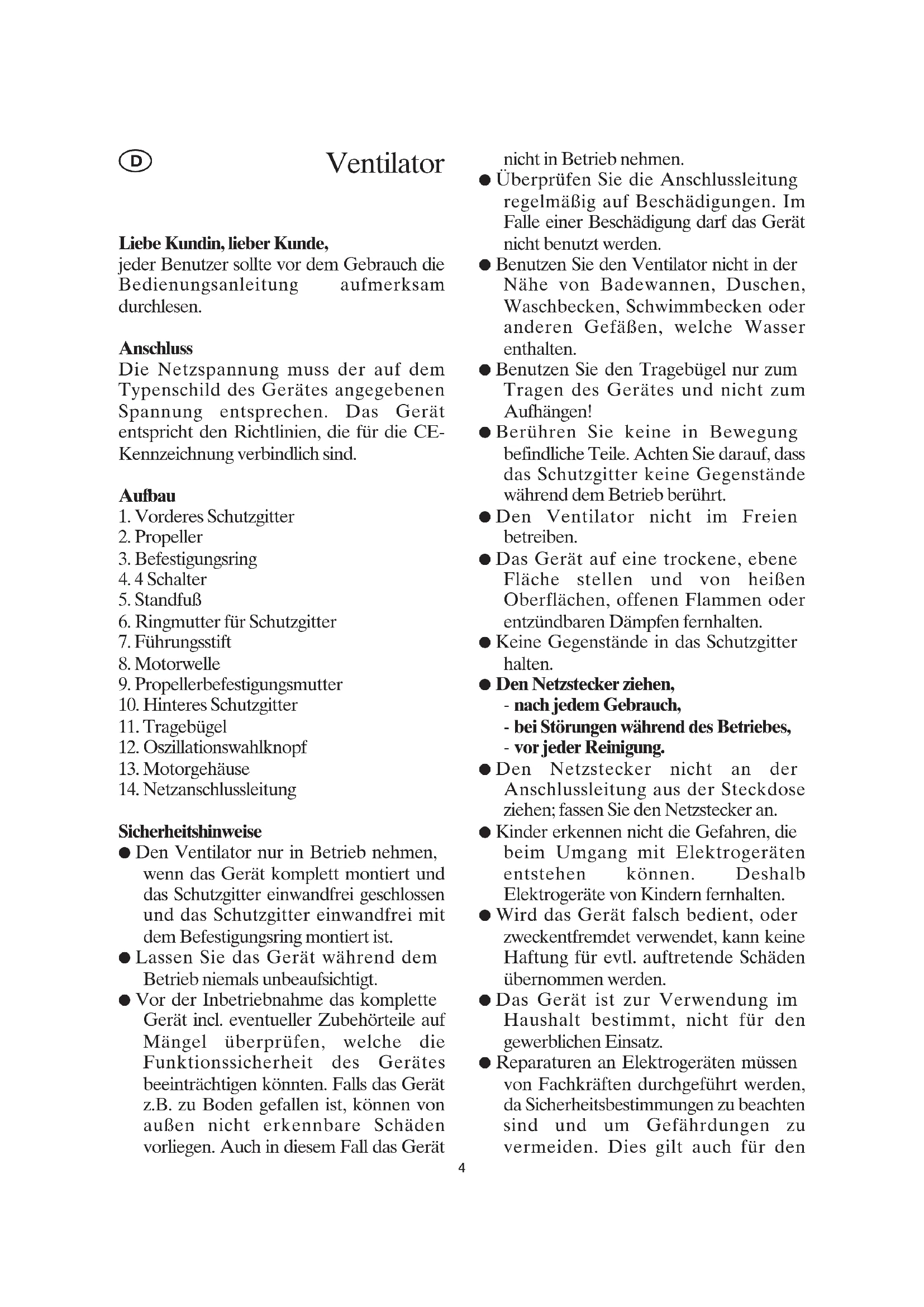 - Den Ventilator nur in Betriebnehmen, wenn das Gerät komplett montiert und das Schutzgitter einwandfrei geschlossen und das Schutzgitter einwandfrei mit dem Befestigungsring montiert ist.
