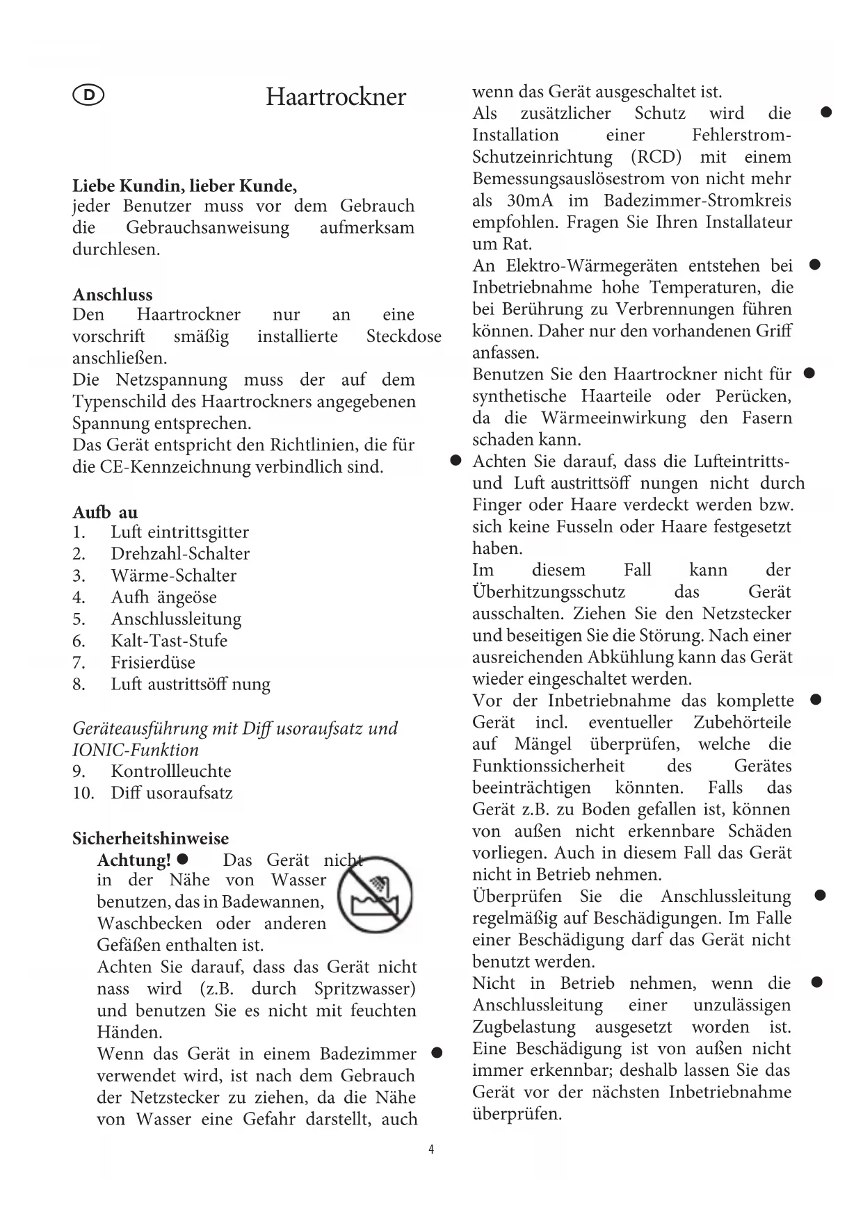 6Haartrockner Liebe Kundin, lieber Kunde, jeder Benutzer muss vor dem Gebrauch die Gebrauchsanweisung aufmerksam durchlesen. Anschluss Den Haartrockner nur an eine vorschri smäßig installierte Steckdose anschließen. Die Netzspannung muss der auf dem Typenschild des Haartrockners angegebenen Spannung entsprechen. Das Gerät entspricht den Richtlinien, die für die CE-Kennzeichnung verbindlich sind. Au au