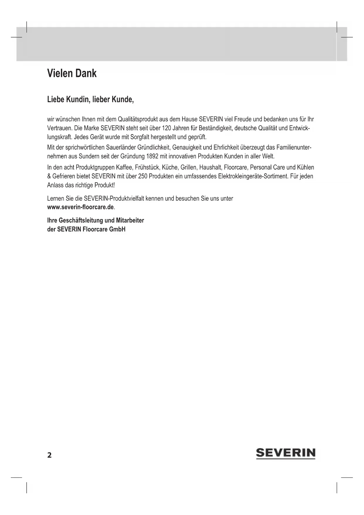 - Das abgekühlte Gerät kann wieder eingeschaltet werden. Gerät nimmt kaum Schmutz auf- oder Saugleistung lässt merklich nach Der Staubbeutel muss gewechselt werden („Staubbeutel wechseln“ auf Seite 9). Es empehlt sich, bei dieser Gelegenheit die Filter gleich mit zu reinigen („Motorlter reinigen“ auf Seite 10, „Ausblaslter reinigen“ auf Seite 10). Die eingestellte Saugleistung ist möglicherweise dem Bodenbelag nicht angemessen. Korrekte Saugleistung einstellen („Saugleistung einstellen“ auf Seite 9).13 enTsorgen Problem Ursache/Behebung Gerät nimmt kaum Schmutz auf oder Saugleistung lässt merklich nach Die aufgesteckte Düse ist möglicherweise dem Bodenbelag nicht angemessen. Korrekte Düse auswählen und aufstecken. Bei aufgesteckter Bodendüse steht der Umschalter „Teppich/Hartbo- den“ in einer dem Belag nicht angemessenen Stellung. Korrekte Schalterstellung wählen. Deckel des Geräts lässt sich nicht schließen Der Staubbeutel steht über und verhindert das vollständige Schließen des Deckels. In diesem Fall den Beutel vollständig im Gerät verstauen. Wenn Ihnen diese Tabelle nicht weiterhilft, wenden Sie sich an unseren Kundendienst. Die Kontaktdaten nden Sie im Anhang dieser Gebrauchsanleitung oder auf www.severin.de. 7 Entsorgen Geräte, die mit diesem Symbol gekennzeichnet sind, müssen getrennt vom Hausmüll entsorgt werden. Diese Geräte enthalten wertvolle Rohstoffe, die wiederverwertet werden können. Eine ordnungsgemäße Entsorgung schützt die Umwelt und die Gesundheit Ihrer Mitmenschen. Ihre Gemeindeverwaltung oder Ihr Fachhändler gibt Auskunft zur ordnungsgemäßen Entsorgung. 8 Garantie Von den nachfolgenden Garantiebedingungen bleiben die gesetzlichen Gewährleistungsrechte gegenüber dem Verkäufer und eventuelle Verkäufergarantien unberührt. Sollte eine Reparatur erforderlich werden, setzen Sie sich telefonisch oder per E-Mail mit unserem Kundendienst in Verbindung. Die Kontaktdaten nden Sie im Anhang dieser Gebrauchsanleitung. Wenden Sie sich im Garantiefall alternativ auch direkt an den Händler. Zusätzlich gewährt SEVERIN eine Herstellergarantie von zwei Jahren ab Kaufdatum. In diesem Zeitraum beseitigen wir kostenlos alle Mängel, die nachweislich auf Material- oder Fertigungsfehlern beruhen und die Funktion wesentlich beeinträchtigen. Weitere Ansprüche sind ausgeschlossen. Von der Garantie ausgenommen sind: Schäden, die auf Nichtbeachtung der Gebrauchsanleitung, unsachge- mäße Behandlung oder normalen Verschleiß zurückzuführen sind, ebenso leicht zerbrechliche Teile wie z. B. Glas, Kunststoff oder Glühlampen. Die Garantie erlischt bei Eingriff nicht von SEVERIN autorisierter Stellen.14 Thank you! Dear Customers, We hope you will enjoy your high-quality SEVERIN product and thank you for placing your trust in us. Get to know the wide range of SEVERIN products; visit us at www.severin-oorcare.com. Management and employees of SEVERIN Floorcare GmbH15 About this instruction manual This instruction manual includes important tips for your safety and the use of the device. Failure to observe the instruction manual can result in personal injuries or damage to the device. Keep the instruction manual in a safe place. When passing the device on to a third party, also include the instruction manual. Read the instruc- tion manual completely before initial use of the device. Illustrated Quick Start Guide included This instruction manual comes with an Quick Start Guide that provides you with additional tips for the use and care of the device. If needed, this instruction manual and the Quick Start Guide can be downloaded online free of charge at www.severin.com. Contents 1 Technical data p. 16