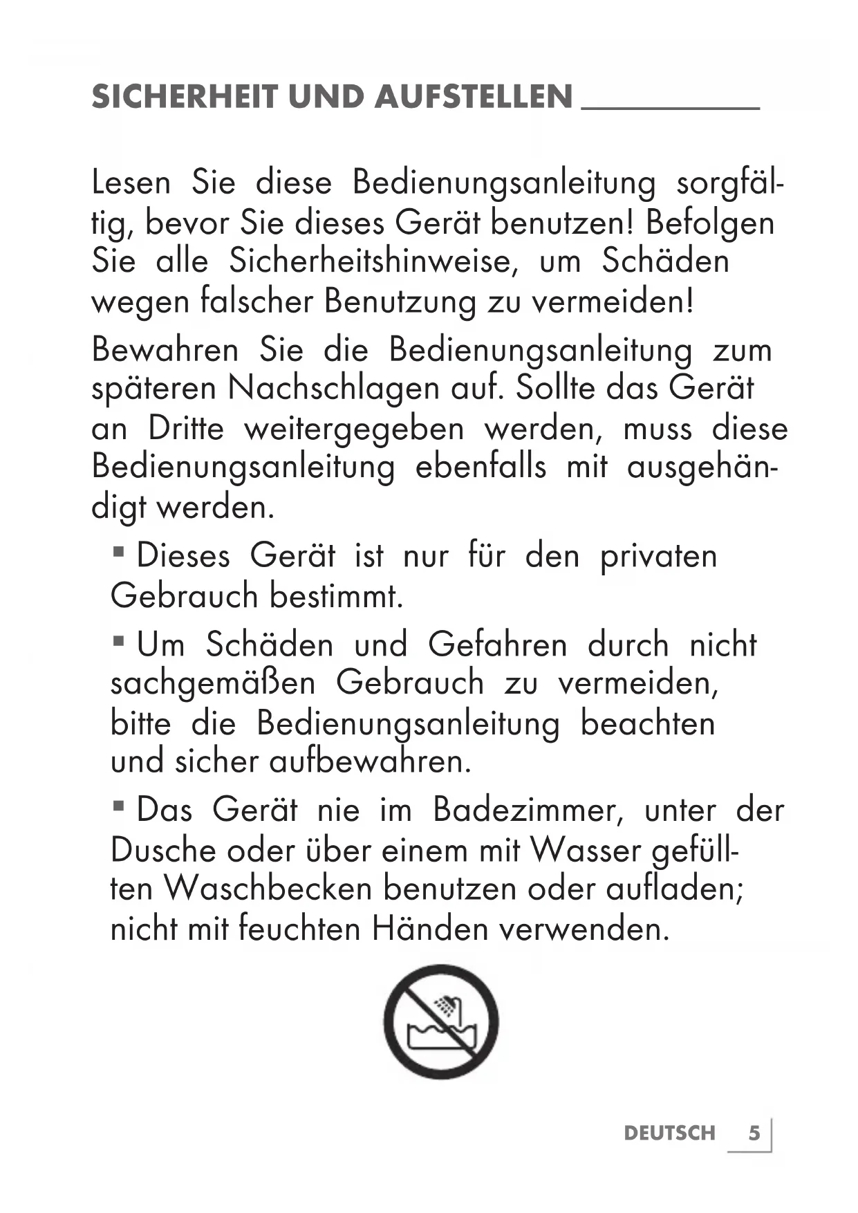 - Das Gerät nie im Badezimmer, unter der Dusche oder über einem mit Wasser gefüll- ten Waschbecken benutzen oder aufladen; nicht mit feuchten Händen verwenden.6 DEUTSCH