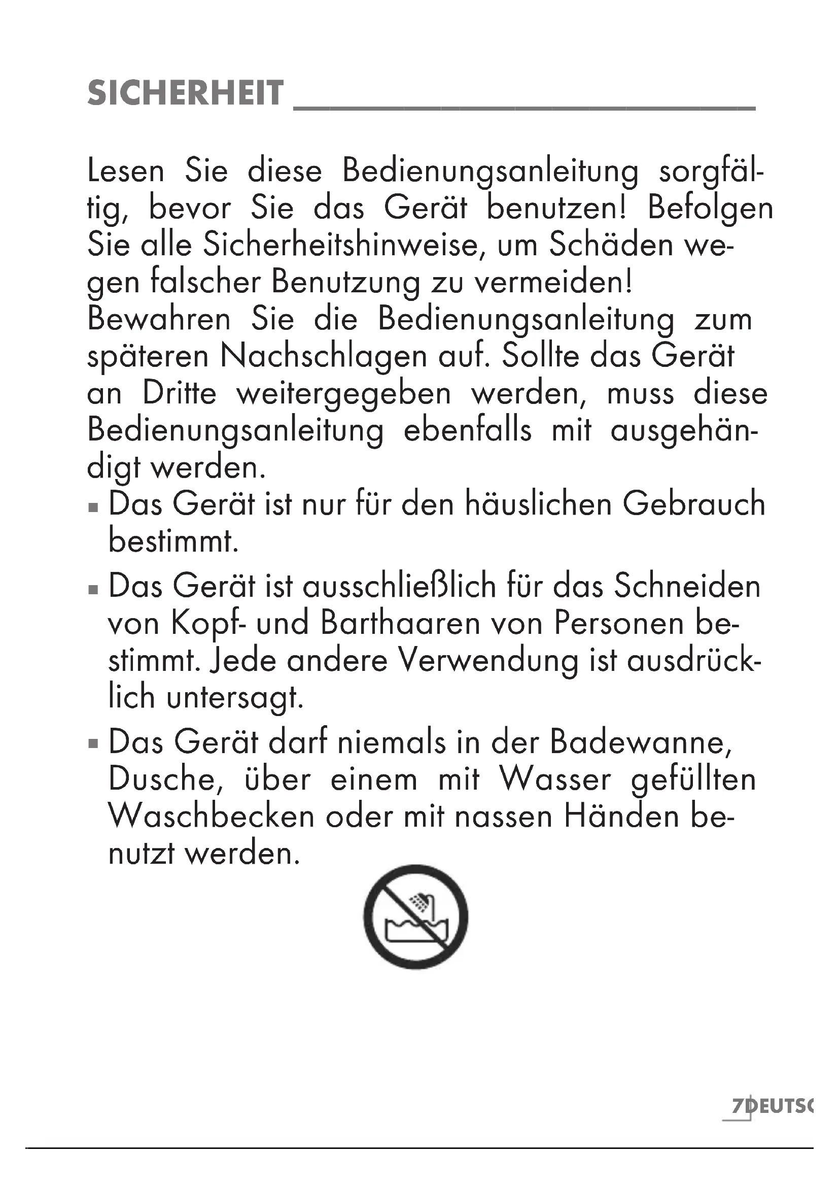 Das Gerät ist ausschließlich für das Schneiden von Kopf- und Barthaaren von Personen bestimmt. jeder andere Verwendung ist ausdrücklich untersagt.