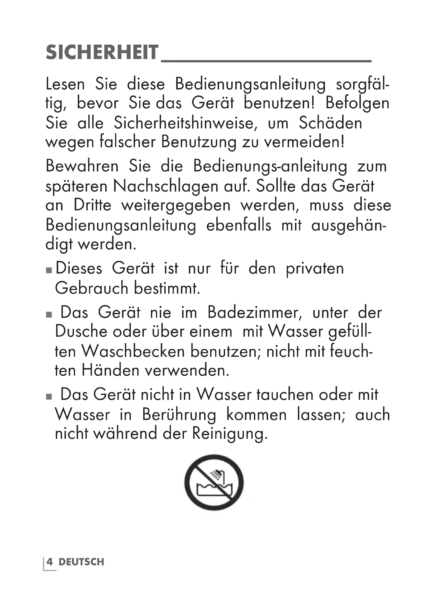 Das Gerät nicht in Wasser tauchen oder mit Wasser in Berührung kommen lassen; auch nicht während der Reinigung. 4DEUTSCH SICHERHEIT ___________________________