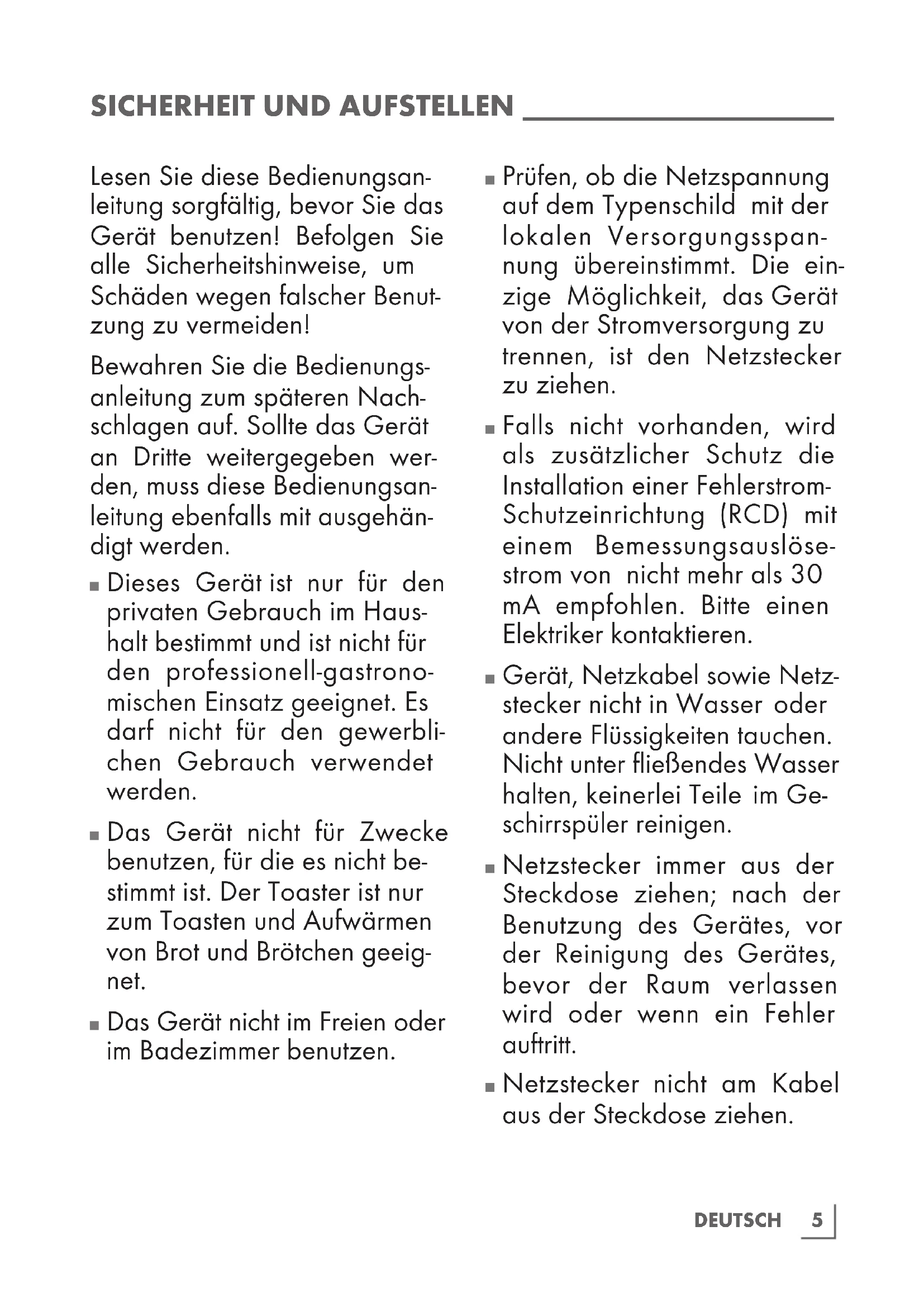 Das Gerät nicht für Zwecke benutzen, für die es nicht be- stimmt ist. Der Toaster ist nur zum Toasten und Aufwärmen von Brot und Brötchen geeig- net.