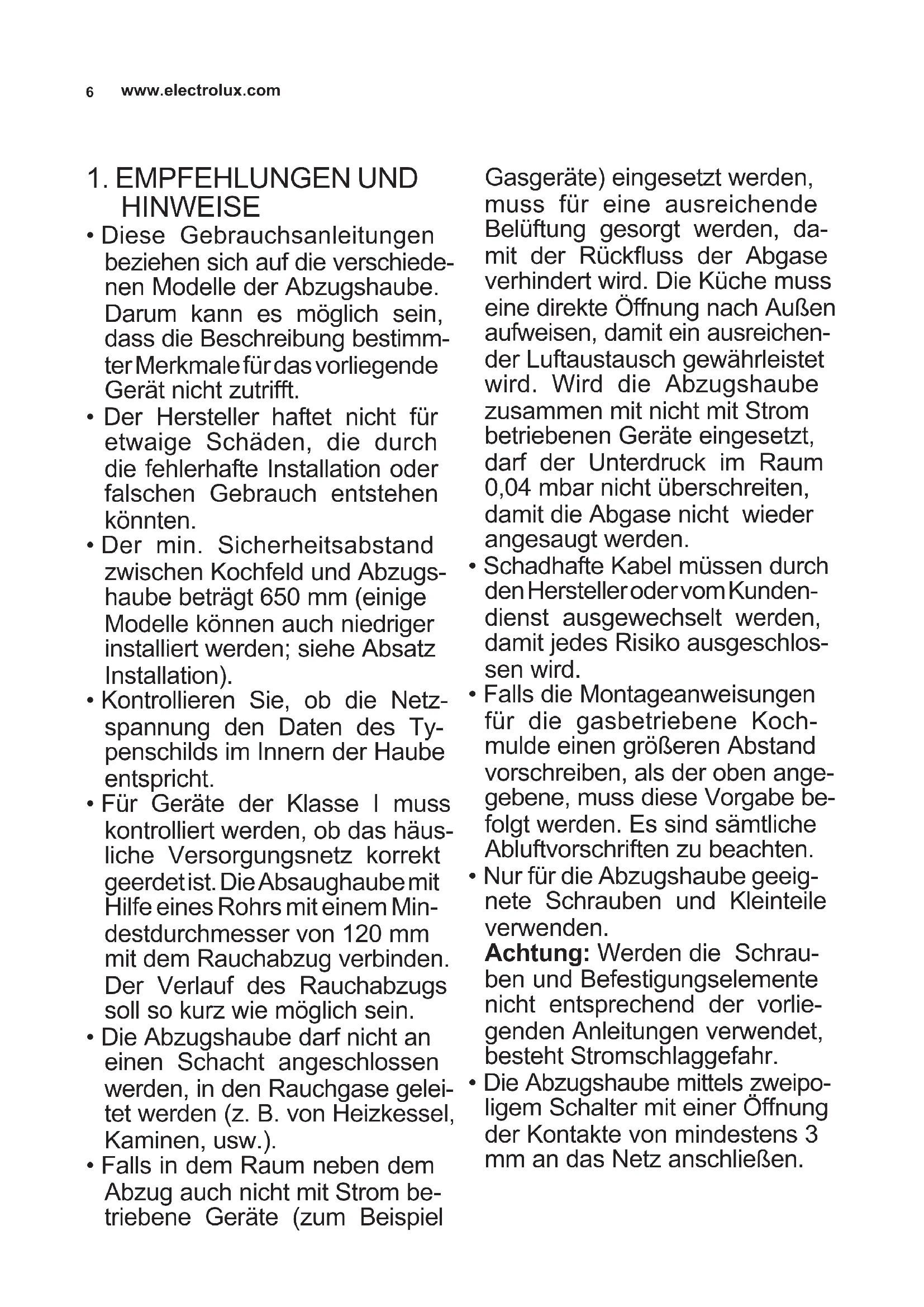 - Die Filter stets nach den angege- benen Intervallen reinigen oder auswechseln (Brandgefahr). - Der Aktivkohlelter ist weder waschbar, noch regenerier- bar und muss bei normalem Betrieb zirka alle 4 Monate oder auch öfter ausgewechselt werden, je nach Intensität des Gebrauchs (W).8 www.electrolux.com