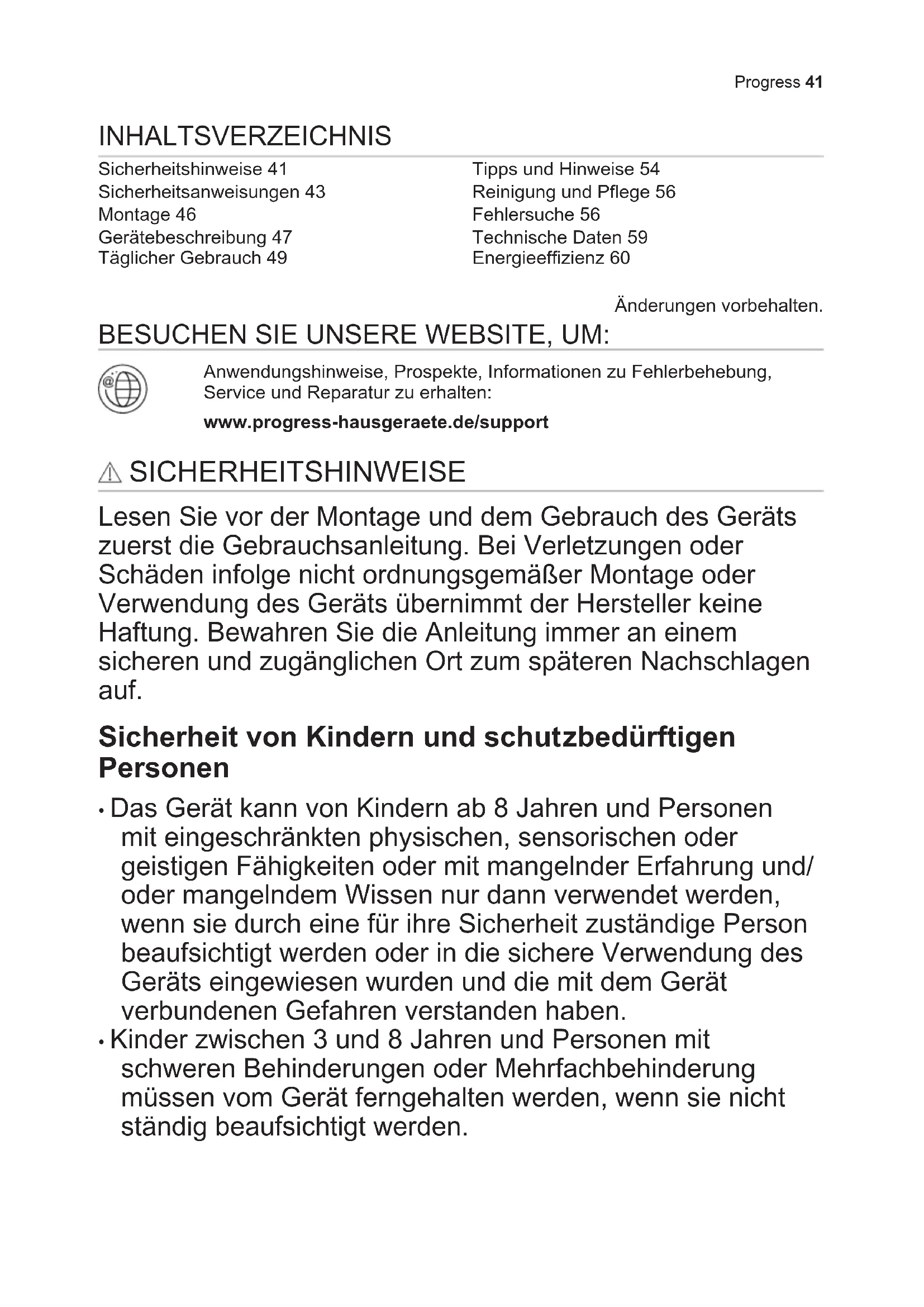 - Vous pouvez utiliser la chaleur résiduelle pour conserver les aliments au chaud ou pour faire fondre. EN MATIÈRE DE PROTECTION DE L'ENVIRONNEMENT Recyclez les matériaux portant le symbole . Déposez les emballages dans les conteneurs prévus à cet effet. Contribuez à la protection de l'environnement et à votre sécurité, recyclez vos produits électriques et électroniques. Ne jetez pas les appareils portant le symbole avec les ordures ménagères. Emmenez un tel produit dans votre centre local de Progress 39recyclage ou contactez vos services municipaux. 40 ProgressINHALTSVERZEICHNIS Sicherheitshinweise 41 Sicherheitsanweisungen 43 Montage 46 Gerätebeschreibung 47 Täglicher Gebrauch 49 Tipps und Hinweise 54 Reinigung und Pflege 56 Fehlersuche 56 Technische Daten 59 Energieeffizienz 60 Änderungen vorbehalten. BESUCHEN SIE UNSERE WEBSITE, UM: Anwendungshinweise, Prospekte, Informationen zu Fehlerbehebung, Service und Reparatur zu erhalten: www.progress-hausgeraete.de/support SICHERHEITSHINWEISE Lesen Sie vor der Montage und dem Gebrauch des Geräts zuerst die Gebrauchsanleitung. Bei Verletzungen oder Schäden infolge nicht ordnungsgemäßer Montage oder Verwendung des Geräts übernimmt der Hersteller keine Haftung. Bewahren Sie die Anleitung immer an einem sicheren und zugänglichen Ort zum späteren Nachschlagen auf. Sicherheit von Kindern und schutzbedürftigen Personen