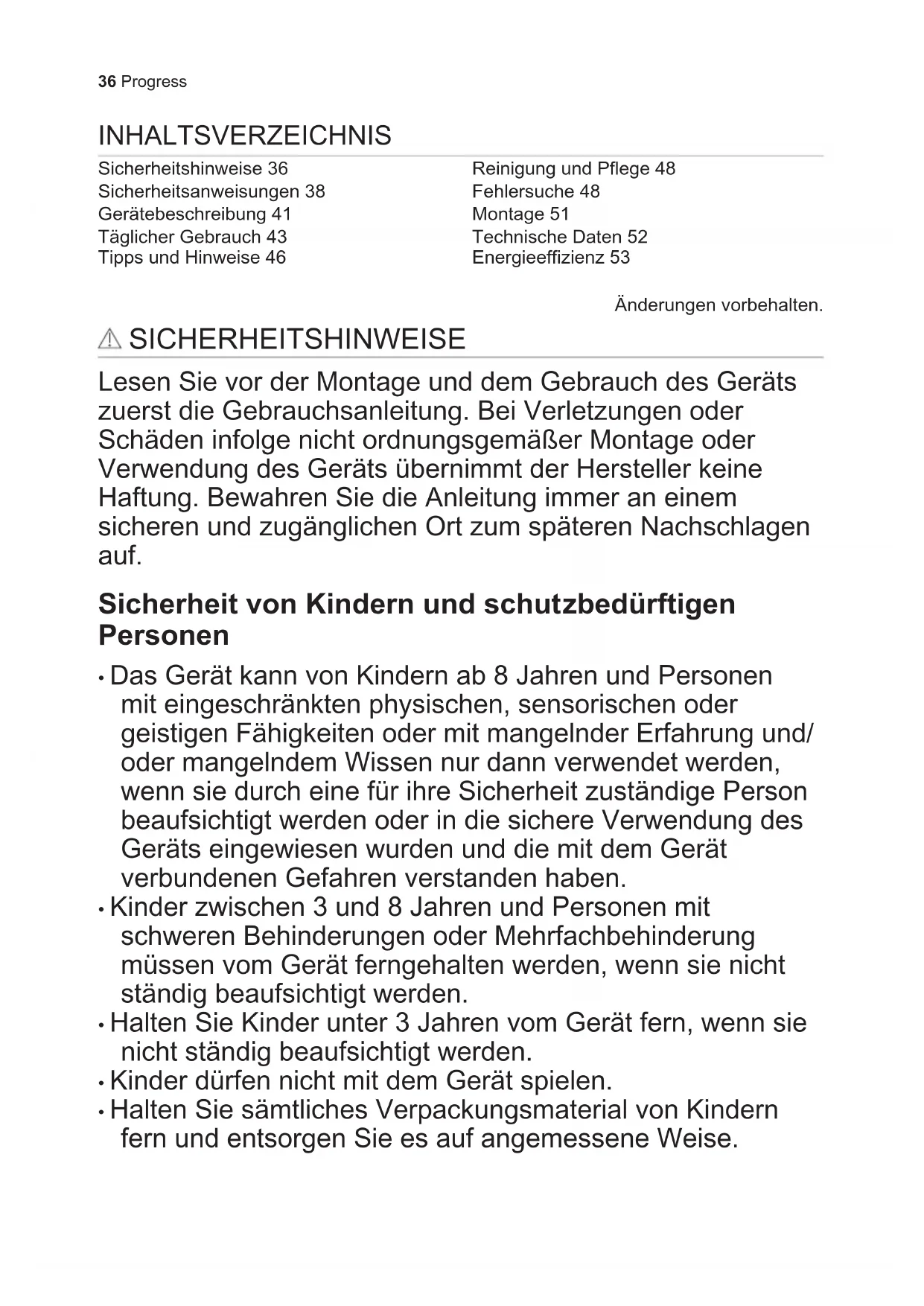 - Vous pouvez utiliser la chaleur résiduelle pour conserver les aliments au chaud ou pour faire fondre. EN MATIÈRE DE PROTECTION DE L'ENVIRONNEMENT Recyclez les matériaux portant le symbole . Déposez les emballages dans les conteneurs prévus à cet effet. Contribuez à la protection de l'environnement et à votre sécurité, recyclez vos produits électriques et électroniques. Ne jetez pas les appareils portant le symbole avec les ordures ménagères. Emmenez un tel produit dans votre centre local de recyclage ou contactez vos services municipaux. Progress 35INHALTSVERZEICHNIS Sicherheitshinweise 36 Sicherheitsanweisungen 38 Gerätebeschreibung 41 Täglicher Gebrauch 43 Tipps und Hinweise 46 Reinigung und Pflege 48 Fehlersuche 48 Montage 51 Technische Daten 52 Energieeffizienz 53 Änderungen vorbehalten. SICHERHEITSHINWEISE Lesen Sie vor der Montage und dem Gebrauch des Geräts zuerst die Gebrauchsanleitung. Bei Verletzungen oder Schäden infolge nicht ordnungsgemäßer Montage oder Verwendung des Geräts übernimmt der Hersteller keine Haftung. Bewahren Sie die Anleitung immer an einem sicheren und zugänglichen Ort zum späteren Nachschlagen auf. Sicherheit von Kindern und schutzbedürftigen Personen