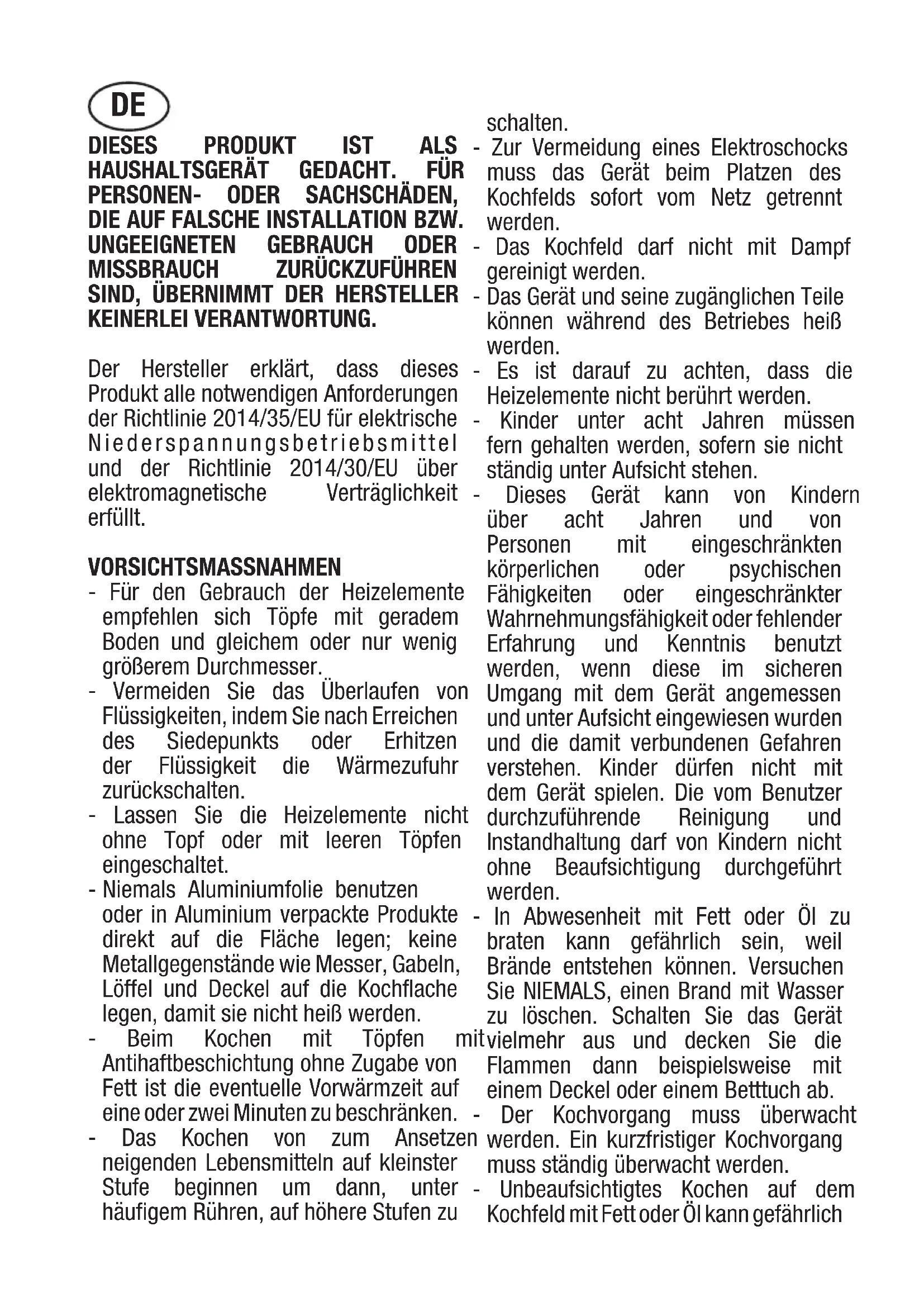 KEINERLEI VERANTWORTUNG. Der Hersteller erklärt, dass dieses Produkt alle notwendigen Anforderungen der Richtlinie 2014/35/EU für elektrische Niederspannungsbetriebsmittel und der Richtlinie 2014/30/EU über elektromagnetische Verträglichkeit erfüllt. VORSICHTSMASSNAHMEN - Für den Gebrauch der Heizelemente empfehlen sich Töpfe mit geradem Boden und gleichem oder nur wenig größerem Durchmesser. - Vermeiden Sie das Überlaufen von Flüssigkeiten, indem Sie nach Erreichen des Siedepunkts oder Erhitzen der Flüssigkeit die Wärmezufuhr zurückschalten. - Lassen Sie die Heizelemente nicht ohne Topf oder mit leeren Töpfen eingeschaltet. - Niemals Aluminiumfolie benutzen oder in Aluminium verpackte Produkte direkt auf die Fläche legen; keine Metallgegenstände wie Messer, Gabeln, Löffel und Deckel auf die Kochflache legen, damit sie nicht heiß werden. - Beim Kochen mit Töpfen mit Antihaftbeschichtung ohne Zugabe von Fett ist die eventuelle Vorwärmzeit auf eine oder zwei Minuten zu beschränken. - Das Kochen von zum Ansetzen neigenden Lebensmitteln auf kleinster Stufe beginnen um dann, unter häufigem Rühren, auf höhere Stufen zu schalten. - Zur Vermeidung eines Elektroschocks muss das Gerät beim Platzen des Kochfelds sofort vom Netz getrennt werden. - Das Kochfeld darf nicht mit Dampf gereinigt werden. - Das Gerät und seine zugänglichen Teile können während des Betriebes heiß werden. - Es ist darauf zu achten, dass die Heizelemente nicht berührt werden. - Kinder unter acht Jahren müssen fern gehalten werden, sofern sie nicht ständig unter Aufsicht stehen. - Dieses Gerät kann von Kindern über acht Jahren und von Personen mit eingeschränkten körperlichen oder psychischen Fähigkeiten oder eingeschränkter Wahrnehmungsfähigkeit oder fehlender Erfahrung und Kenntnis benutzt werden, wenn diese im sicheren Umgang mit dem Gerät angemessen und unter Aufsicht eingewiesen wurden und die damit verbundenen Gefahren verstehen. Kinder dürfen nicht mit dem Gerät spielen. Die vom Benutzer durchzuführende Reinigung und Instandhaltung darf von Kindern nicht ohne Beaufsichtigung durchgeführt werden. - In Abwesenheit mit Fett oder Öl zu braten kann gefährlich sein, weil Brände entstehen können. Versuchen Sie NIEMALS, einen Brand mit Wasser zu löschen. Schalten Sie das Gerät vielmehr aus und decken Sie die Flammen dann beispielsweise mit einem Deckel oder einem Betttuch ab. - Der Kochvorgang muss überwacht werden. Ein kurzfristiger Kochvorgang muss ständig überwacht werden. - Unbeaufsichtigtes Kochen auf dem Kochfeld mit Fett oder Öl kann gefährlich DEsein und zu einem Brand führen. - Brandgefahr: auf den Kochfeldern keine Elemente lagern. - Nur vom Hersteller des Kochgerätes entwickelte oder vom Hersteller in der Gebrauchsanleitung als geeignet bezeichnete Kochfeldschützer oder mit dem Gerät gelieferte Kochfeldschützer verwenden. Die Verwendung ungeeigneter Schützer kann zu Unfällen führen. Installieren Sie in der festen Verkabelung eine Abschaltvorrichtung mit omnipolarem Trennschalter, der im Falle einer Überspannung der Kategorie III eine vollständige Abschaltung vom Netz nach den gültigen Verkabelungsvorschriften erlaubt. Die Steckdose oder der allpolige Schalter müssen bei dem installierten Apparat leicht zu erreichen sein. Dieses Gerät ist nicht für den Gebrauch mit einer externen Zeitschaltuhr oder einem gesonderten Fernbedienungssystem vorgesehen. Der Hersteller lehnt jede Verantwortung ab falls oben genannte Ausführungen und die üblichen Unfallnormen nicht eingehalten werden. Falls das Netzkabel beschädigt ist, muss es durch den Hersteller oder seinen technischen Kundendienst oder in jedem Fall durch eine entsprechend qualifizierte Fachkraft ersetzt werden, um jedes Risiko auszuschließen. Anweisungen für den Benutzer Installation Alle Operationen hinsichtlich der Installation (elektrischer Anschluß) müssen vom zugelassenen Fachpersonal gemäß den geltenden Bestimmungen ausgeführt werden. Für die spezifischen Anweisungen siehe die dem Installateur vorbehaltene Seite. Anwendung HEIZELEMENTETOUCH CONTROL Berührungstasten Alle Funktionen können über Berührungstasten (kapazitive Sensoren) auf der Frontpartie der Bedienungsblende eingeschaltet werden; jeder Taste entspricht eine Anzeige. Jede Betätigung wird von einem Signalton quittiert. Ein- und Ausschalten TOUCH CONTROL (Abb. 1) 1 Ein / Aus Taste 2 Kochzone 3 Anzeige eingestellter Wert 4 Minus 5 Plus 6 Doppelter Heizkreis 7 Timer 8 Anzeige Timer 9 Sperre 10 Warnleuchte doppelter Heizkreis 11 Timer-Warnleuchten 12 Warnleuchte Sperre 13 Dezimalpunkt EIN/AUS-Schalten der Touch Control Nach Anlegen der Netzspannung initialisiert sich die Steuerung für ca. 1 Sekunde bevor sie betriebsbereit ist. Nach einem Reset leuchten für 1 Sekunde alle Anzeigen und LED´s. Nach Ablauf dieser Zeit werden alle Anzeigen und LED´s wieder ausgeschaltet, und die Steuerung befindet sich im Stand-by Zustand. Die Steuerung kann nun durch Betätigen der EIN/AUS-Taste in den Ein-Zustand geschaltet werden. Auf den Kochstellenanzeigen erscheint statisch die “0“. Sollte eine Kochstelle den Status “Heiss“ besitzen, wird an Stelle der “0“ ein statisches “H“ angezeigt. Der Punkt rechts unten blinkt auf allen Kochstellenanzeigen in einem 1- Sekunden-Takt zum Anzeigen, dass momentan keine Kochstelle selektiert ist. Die Elektronik bleibt nach dem Einschalten für 10 Sekunden aktiviert. Findet innerhalb dieser Zeit keine Kochstellen- oder Timeranwahl statt, geht die Elektronik selbständig wieder in den Stand-by ustand. Die Steuerung läßt sich nur dann in den Ein-Zustand einschalten, wenn lediglich die EIN/AUS-Taste (1) von der Elektronik als betätigt erkannt wurde. Sollte eine beliebige weitere Taste ebenfalls als betätigt erkannt werden, bleibt die Steuerung im Stand by-Zustand. Sollte zum Zeitpunkt des Einschaltens die Kindersicherung noch aktiv sein, wird auf allen Kochstellen ein “L“ wie LOC
