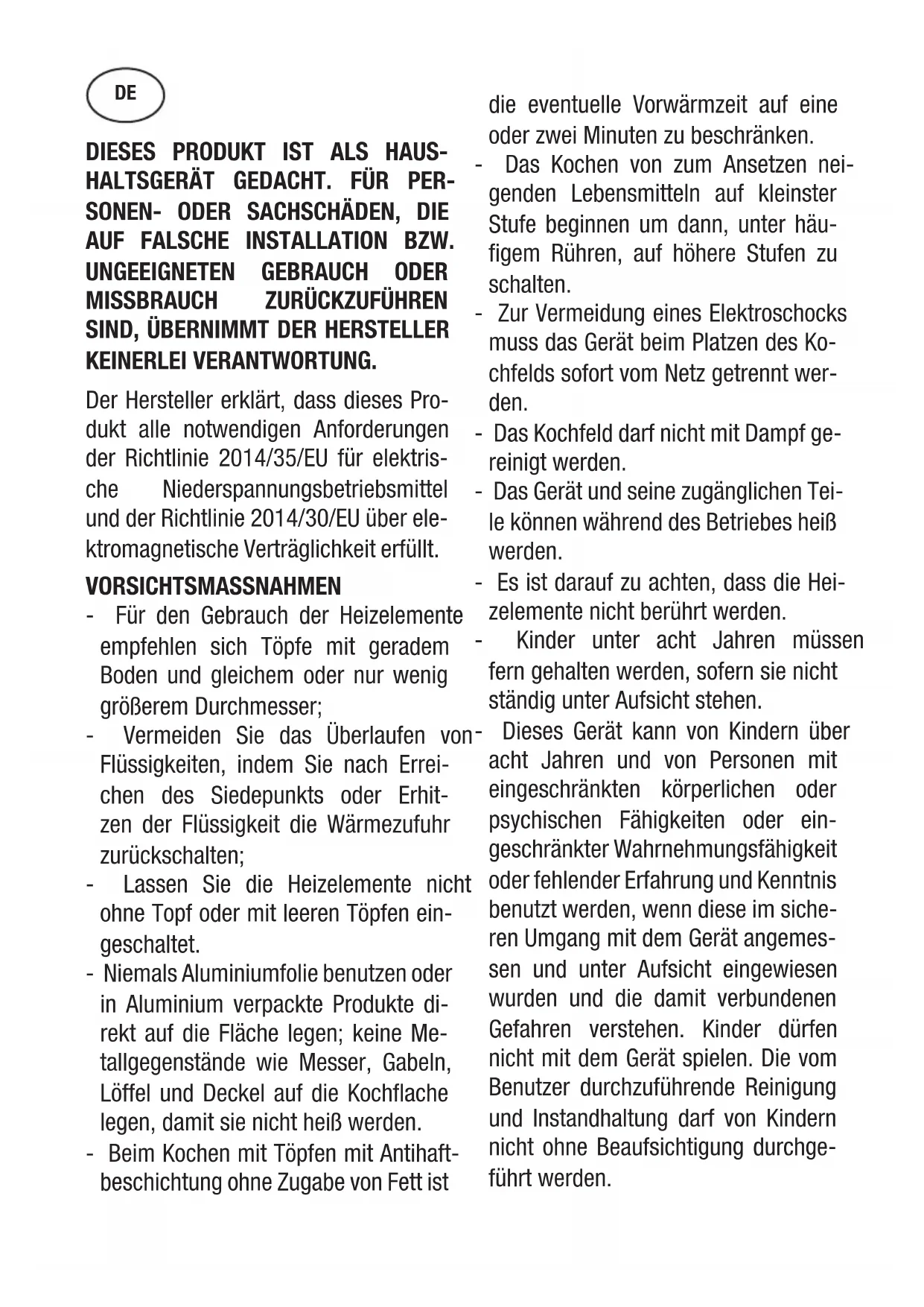 KEINERLEI VERANTWORTUNG. Der Hersteller erklärt, dass dieses Pro- dukt alle notwendigen Anforderungen der Richtlinie 2014/35/EU für elektris- che Niederspannungsbetriebsmittel und der Richtlinie 2014/30/EU über ele- ktromagnetische Verträglichkeit erfüllt. VORSICHTSMASSNAHMEN - Für den Gebrauch der Heizelemente empfehlen sich Töpfe mit geradem Boden und gleichem oder nur wenig größerem Durchmesser; - Vermeiden Sie das Überlaufen von Flüssigkeiten, indem Sie nach Errei- chen des Siedepunkts oder Erhit- zen der Flüssigkeit die Wärmezufuhr zurückschalten; - Lassen Sie die Heizelemente nicht ohne Topf oder mit leeren Töpfen ein- geschaltet. - Niemals Aluminiumfolie benutzen oder in Aluminium verpackte Produkte di- rekt auf die Fläche legen; keine Me- tallgegenstände wie Messer, Gabeln, Löffel und Deckel auf die Kochflache legen, damit sie nicht heiß werden. - Beim Kochen mit Töpfen mit Antihaft- beschichtung ohne Zugabe von Fett ist die eventuelle Vorwärmzeit auf eine oder zwei Minuten zu beschränken. - Das Kochen von zum Ansetzen nei- genden Lebensmitteln auf kleinster Stufe beginnen um dann, unter häu- figem Rühren, auf höhere Stufen zu schalten. - Zur Vermeidung eines Elektroschocks muss das Gerät beim Platzen des Ko- chfelds sofort vom Netz getrennt wer- den. - Das Kochfeld darf nicht mit Dampf ge- reinigt werden. - Das Gerät und seine zugänglichen Tei- le können während des Betriebes heiß werden. - Es ist darauf zu achten, dass die Hei- zelemente nicht berührt werden. - Kinder unter acht Jahren müssen fern gehalten werden, sofern sie nicht ständig unter Aufsicht stehen. - Dieses Gerät kann von Kindern über acht Jahren und von Personen mit eingeschränkten körperlichen oder psychischen Fähigkeiten oder ein- geschränkter Wahrnehmungsfähigkeit oder fehlender Erfahrung und Kenntnis benutzt werden, wenn diese im siche- ren Umgang mit dem Gerät angemes- sen und unter Aufsicht eingewiesen wurden und die damit verbundenen Gefahren verstehen. Kinder dürfen nicht mit dem Gerät spielen. Die vom Benutzer durchzuführende Reinigung und Instandhaltung darf von Kindern nicht ohne Beaufsichtigung durchge- führt werden. DE- In Abwesenheit mit Fett oder Öl zu bra- ten kann gefährlich sein, weil Brände entstehen können. Versuchen Sie NIE- MALS, einen Brand mit Wasser zu lös- chen. Schalten Sie das Gerät vielme- hr aus und decken Sie die Flammen dann beispielsweise mit einem Deckel oder einem Betttuch ab. - Der Kochvorgang muss überwacht werden. Ein kurzfristiger Kochvorgang muss ständig überwacht werden. - Unbeaufsichtigtes Kochen auf dem Kochfeld mit Fett oder Öl kann gefähr- lich sein und zu einem Brand führen. - Brandgefahr: auf den Kochfeldern kei- ne Elemente lagern.