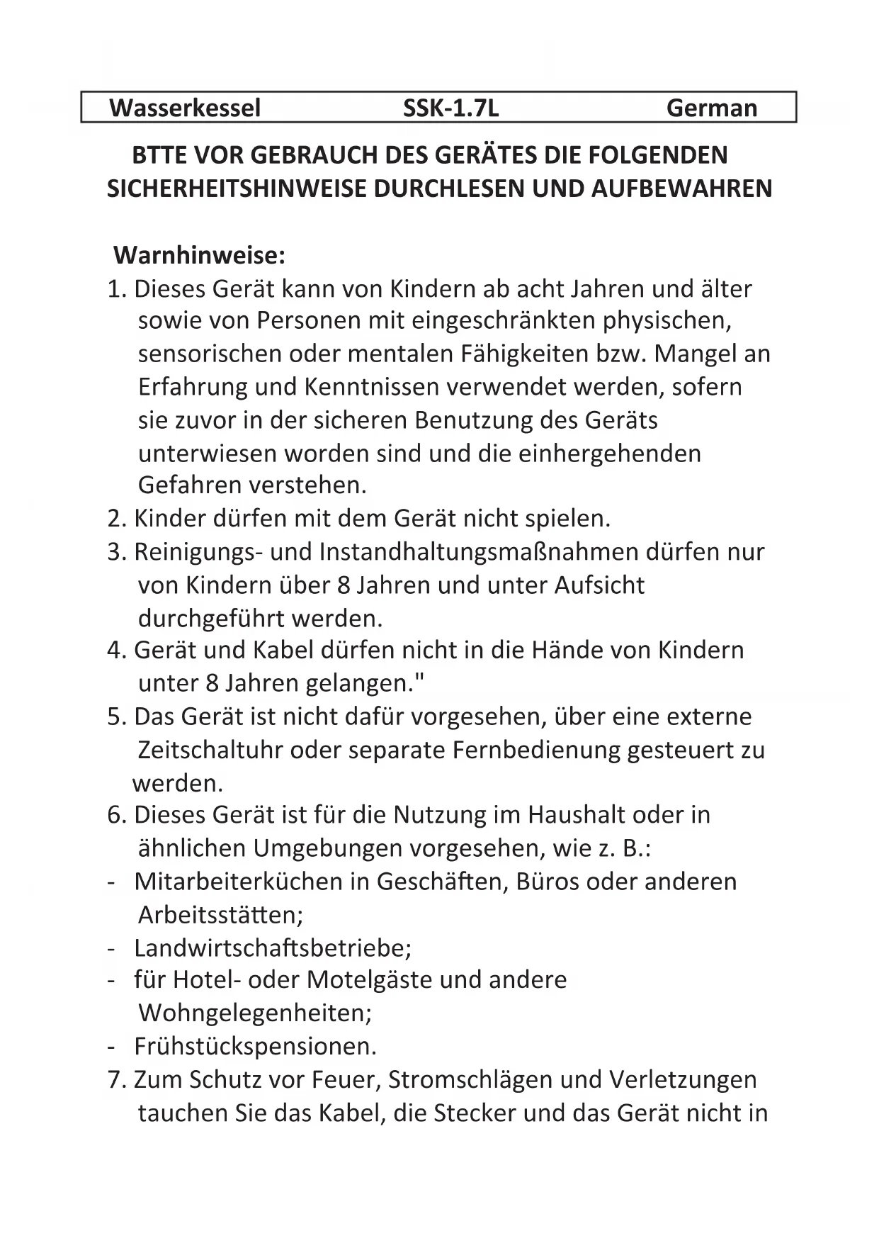 Behörden. Technische Spezifikaonen Netzspannung: 220-240V ~ 50/60Hz Leistung: 1500 W Fassungsvermögen: 1.8LWater Kele SSK-1.7L English READ BEFORE USAGE AND SAVE THESE INSTRUCTIONS Warnings: