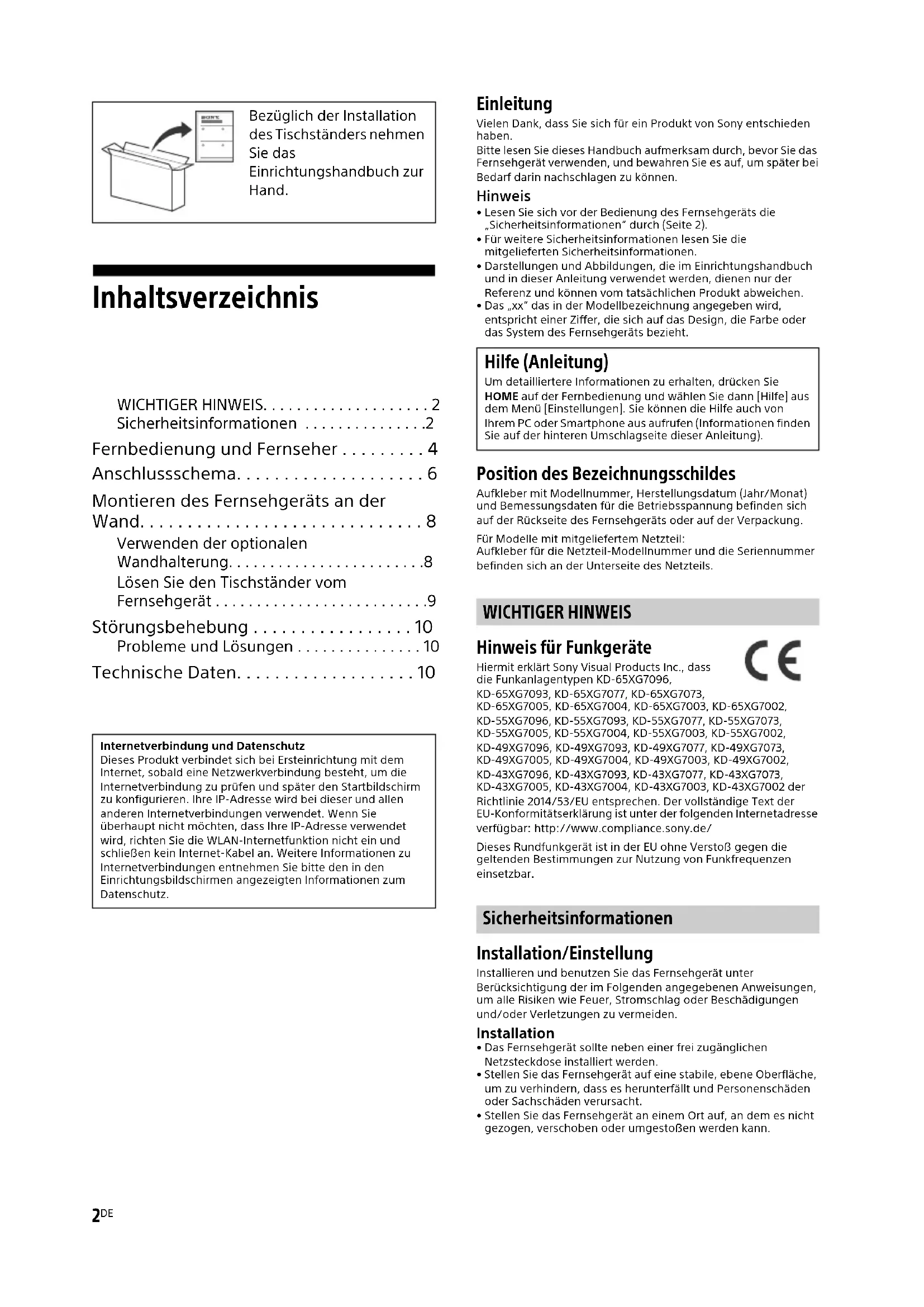 - Lesen Sie sich vor der Bedienung des Fernsehgeräts die „Sicherheitsinformationen“ durch (Seite 2).• Für weitere Sicherheitsinformationen lesen Sie die mitgelieferten Sicherheitsinformationen.• Darstellungen und Abbildungen, die im Einrichtungshandbuch und in dieser Anleitung verwendet werden, dienen nur der Referenz und können vom tatsächlichen Produkt abweichen.• Das „xx“ das in der Modellbezeichnung angegeben wird, entspricht einer Ziffer, die sich auf das Design, die Farbe oder das System des Fernsehgeräts bezieht. Position des Bezeichnungsschildes Aufkleber mit Modellnummer, Herstellungsdatum (Jahr/Monat) und Bemessungsdaten für die Betriebsspannung befinden sich auf der Rückseite des Fernsehgeräts oder auf der Verpackung.Für Modelle mit mitgeliefertem Netzteil:Aufkleber für die Netzteil-Modellnummer und die Seriennummer befinden sich an der Unterseite des Netzteils. WICHTIGER HINWEIS Hinweis für Funkgeräte Hiermit erklärt Sony Visual Products Inc., dass die Funkanlagentypen KD-65XG7096, KD-65XG7093, KD-65XG7077, KD-65XG7073, KD-65XG7005, KD-65XG7004, KD-65XG7003, KD-65XG7002, KD-55XG7096, KD-55XG7093, KD-55XG7077, KD-55XG7073, KD-55XG7005, KD-55XG7004, KD-55XG7003, KD-55XG7002, KD-49XG7096, KD-49XG7093, KD-49XG7077, KD-49XG7073, KD-49XG7005, KD-49XG7004, KD-49XG7003, KD-49XG7002, KD-43XG7096, KD-43XG7093, KD-43XG7077, KD-43XG7073, KD-43XG7005, KD-43XG7004, KD-43XG7003, KD-43XG7002 der Richtlinie 2014/53/EU entsprechen. Der vollständige Text der EU-Konformitätserklärung ist unter der folgenden Internetadresse verfügbar: http://www.compliance.sony.de/Dieses Rundfunkgerät ist in der EU ohne Verstoß gegen die geltenden Bestimmungen zur Nutzung von Funkfrequenzen einsetzbar. Sicherheitsinformationen Installation/Einstellung Installieren und benutzen Sie das Fernsehgerät unter Berücksichtigung der im Folgenden angegebenen Anweisungen, um alle Risiken wie Feuer, Stromschlag oder Beschädigungen und/oder Verletzungen zu vermeiden. Installation