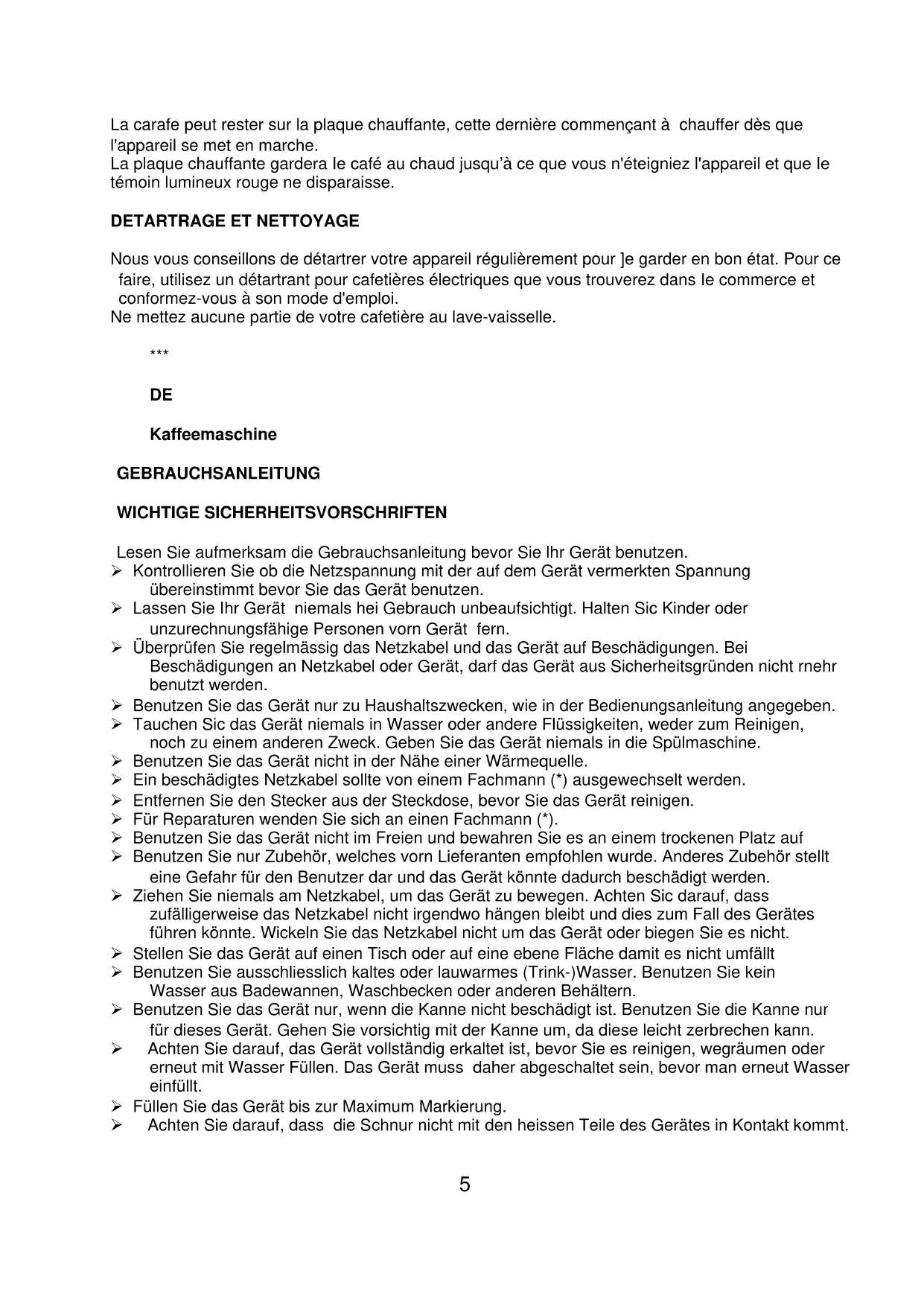 Kaffeemaschine GEBRAUCHSANLEITUNG WICHTIGE SICHERHEITSVORSCHRIFTEN Lesen Sie aufmerksam die Gebrauchsanleitung bevor Sie lhr Gerät benutzen. Kontrollieren Sie ob die Netzspannung mit der auf dem Gerät vermerkten Spannung übereinstimmt bevor Sie das Gerät benutzen. Lassen Sie Ihr Gerät niemals hei Gebrauch unbeaufsichtigt. Halten Sic Kinder oder unzurechnungsfähige Personen vorn Gerät fern. Überprüfen Sie regelmässig das Netzkabel und das Gerät auf Beschädigungen. Bei Beschädigungen an Netzkabel oder Gerät, darf das Gerät aus Sicherheitsgründen nicht rnehr benutzt werden. Benutzen Sie das Gerät nur zu Haushaltszwecken, wie in der Bedienungsanleitung angegeben. Tauchen Sic das Gerät niemals in Wasser oder andere Flüssigkeiten, weder zum Reinigen, noch zu einem anderen Zweck. Geben Sie das Gerät niemals in die Spülmaschine. Benutzen Sie das Gerät nicht in der Nähe einer Wärmequelle. Ein beschädigtes Netzkabel sollte von einem Fachmann (*) ausgewechselt werden. Entfernen Sie den Stecker aus der Steckdose, bevor Sie das Gerät reinigen. Für Reparaturen wenden Sie sich an einen Fachmann (*). Benutzen Sie das Gerät nicht im Freien und bewahren Sie es an einem trockenen Platz auf Benutzen Sie nur Zubehör, welches vorn Lieferanten empfohlen wurde. Anderes Zubehör stellt eine Gefahr für den Benutzer dar und das Gerät könnte dadurch beschädigt werden. Ziehen Sie niemals am Netzkabel, um das Gerät zu bewegen. Achten Sic darauf, dass zufälligerweise das Netzkabel nicht irgendwo hängen bleibt und dies zum Fall des Gerätes führen könnte. Wickeln Sie das Netzkabel nicht um das Gerät oder biegen Sie es nicht. Stellen Sie das Gerät auf einen Tisch oder auf eine ebene Fläche damit es nicht umfällt Benutzen Sie ausschliesslich kaltes oder lauwarmes (Trink-)Wasser. Benutzen Sie kein Wasser aus Badewannen, Waschbecken oder anderen Behältern. Benutzen Sie das Gerät nur, wenn die Kanne nicht beschädigt ist. Benutzen Sie die Kanne nur für dieses Gerät. Gehen Sie vorsichtig mit der Kanne um, da diese leicht zerbrechen kann. Achten Sie darauf, das Gerät vollständig erkaltet ist, bevor Sie es reinigen, wegräumen oder erneut mit Wasser Füllen. Das Gerät muss daher abgeschaltet sein, bevor man erneut Wasser einfüllt. Füllen Sie das Gerät bis zur Maximum Markierung. Achten Sie darauf, dass die Schnur nicht mit den heissen Teile des Gerätes in Kontakt kommt.6 Berühren Sie nicht die heissen Teile des Gerätes (Achtung: Die Warmhalteplatte ist ebenfalls heiss !) Fassen Sie nur die Plastikteile an oder heben Sie die Kanne mit Hilfe des Griffes hoch Achten Sie darauf, dass Sie sich nicht verbrühen, da beim Kochvorgang Dampf aus dem Kaffeefilter austritt. Benutzen Sie zum Entkalken ausschliesslich Essig oder hierfür vorgesehene Produkte. Benutzen Sie niemals Ammoniak oder andere Produkte, die Ihrer Gesundheit schaden könnten. Geben Sie ausschliesslich gemahlenen Kaffee in den Filter. Schalten Sie Ihren Kaffeeautomaten nicht an ohne Wasser eingefüllt zu haben. (*) Fachmann: anerkannter Kundendienst des Lieferanten oder des Importeurs, der für derartige Reparaturen zuständig ist. Für eventuelle Reparaturen wenden Sie sich bitte an diesen Kundendienst. ERSTE INBETRIEBNAHME Vor der ersten Kaffeezubereitung führen Sie bitte 2-3 Kochvorgänge mit frischem Wasser durch (ohne Kaffeepulver). Ist das Wasser durchgelaufen, schalten Sie das Gerät ab und wiederholen Sie den Vorgang nach ca. 5 Minuten mit frischem Wasser. KAFFEEMASCHINE HANDGEBRAUCH Den Tank mit der gewünschten Menge Wasser auffüllen. Man kann die Menge der erhaltbarenTassen durch das Niveaufenster sehen. Ein Papierfilter einfügen (oder den beigefügten permanenten Filter benutzen) und mit der gewünschten Kaffeemenge auffühlen. Den Filterträger wieder in seine Stellung stellen. Zum Einschalten auf die Taste START drücken. Das rote Lichtsignal wird angehen und anzeigen dass die Kaffeemaschine funktioniert. Vergewissern Sie Sich, dass der Glaskrug die richtige Stellung auf der Platte hat. Sobald man den Glaskrug von der Platte wegnimmt, schliesst sich automatisch ein Ventil, das vermeidet, dass Tropfen auf die Platte herunterfallen Abwarten, bis der Kaffee vollkommen durchgelaufen und der Filter leer ist. Um die Maschine zu stoppen, nochmals auf die Taste START drücken. Das rote Lichtsignal wird dann ausgehen und somit anzeigen, dass die Kaffeemaschine nicht mehr an ist. , Wenn die Kaffeemaschine gestoppt wird, ist automatisch die Weise Standby gewählt.