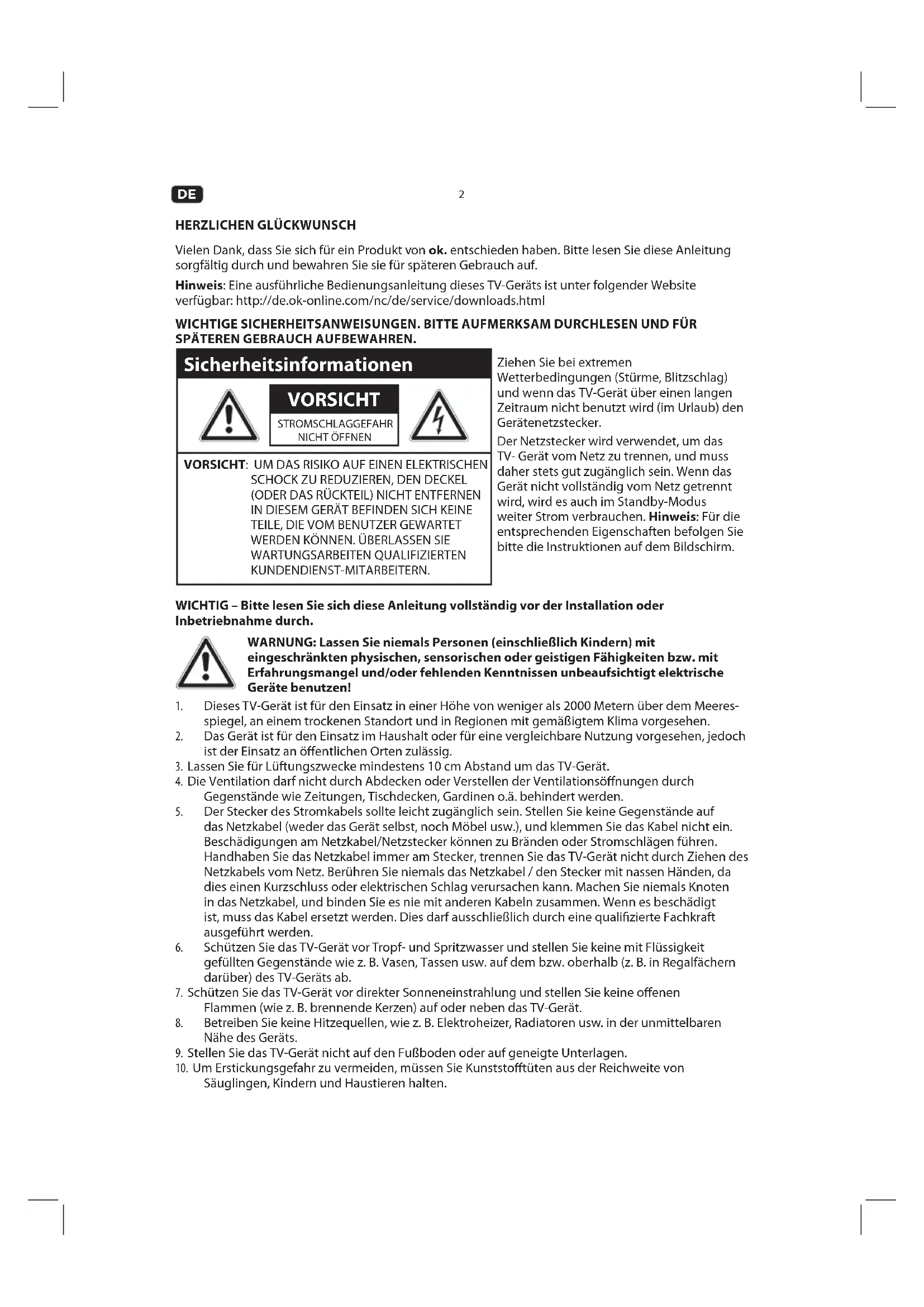 Vielen Dank, dass Sie sich für ein Produkt von ok. entschieden haben. Bitte lesen Sie diese Anleitung sorgfältig durch und bewahren Sie sie für späteren Gebrauch auf. Hinweis: Eine ausführliche Bedienungsanleitung dieses TV-Geräts ist unter folgender Website verfügbar: http://de.ok-online.com/nc/de/service/downloads.html WICHTIGE SICHERHEITSANWEISUNGEN. BITTE AUFMERKSAM DURCHLESEN UND FÜR SPÄTEREN GEBRAUCH AUFBEWAHREN. Sicherheitsinformationen Ziehen Sie bei extremen Wetterbedingungen (Stürme, Blitzschlag) und wenn das TV-Gerät über einen langen Zeitraum nicht benutzt wird (im Urlaub) den Gerätenetzstecker. Der Netzstecker wird verwendet, um das TV- Gerät vom Netz zu trennen, und muss daher stets gut zugänglich sein. Wenn das Gerät nicht vollständig vom Netz getrennt wird, wird es auch im Standby-Modus weiter Strom verbrauchen. Hinweis: Für die entsprechenden Eigenschaften befolgen Sie bitte die Instruktionen auf dem Bildschirm. VORSICHT STROMSCHLAGGEFAHR NICHT ÖFFNEN VORSICHT: UM DAS RISIKO AUF EINEN ELEKTRISCHEN