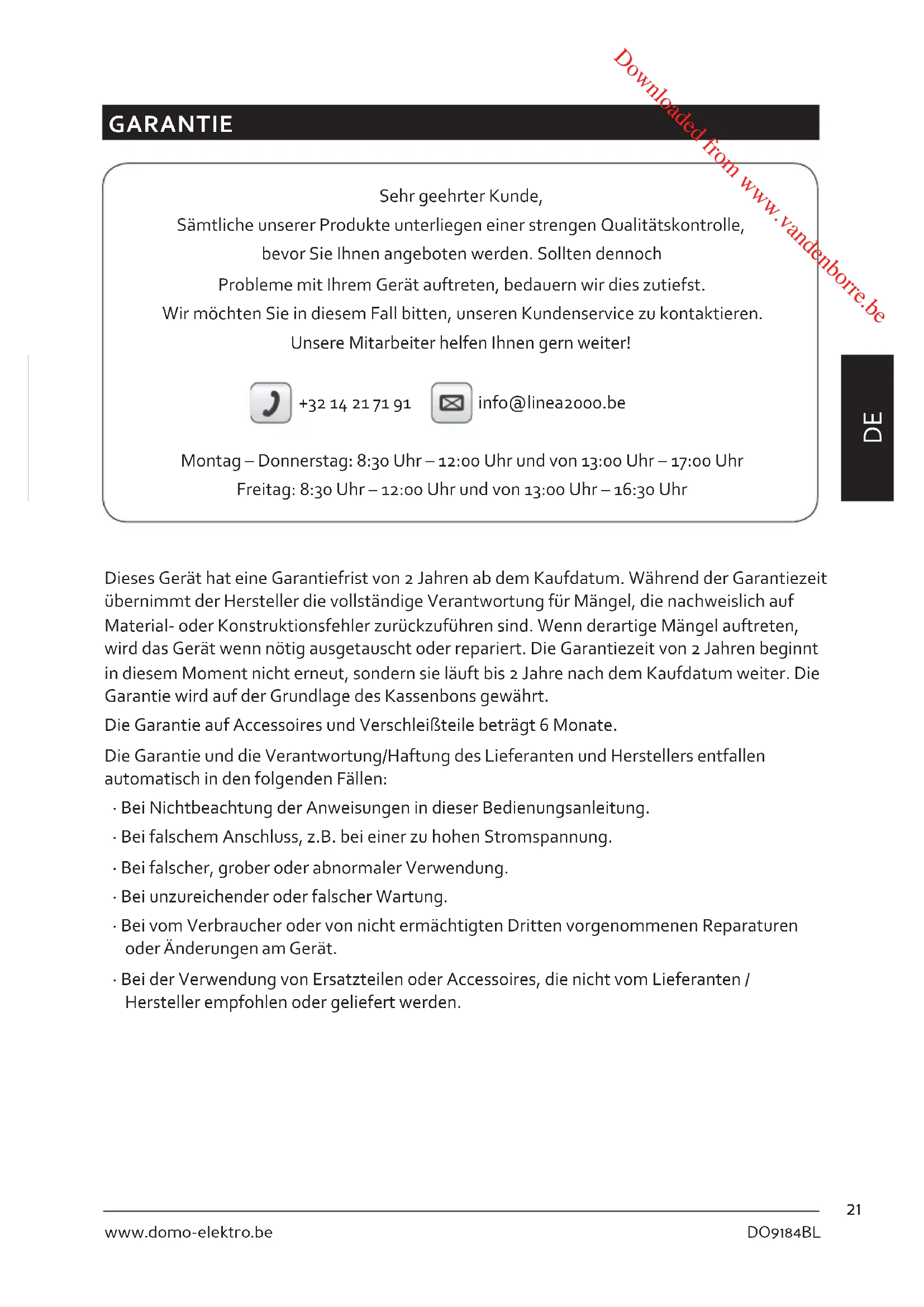- Bei der Verwendung von Ersatzteilen oder Accessoires, die nicht vom Lieferanten / Hersteller empfohlen oder geliefert werden. Downloaded from www.vandenborre.be22 DO9184BL