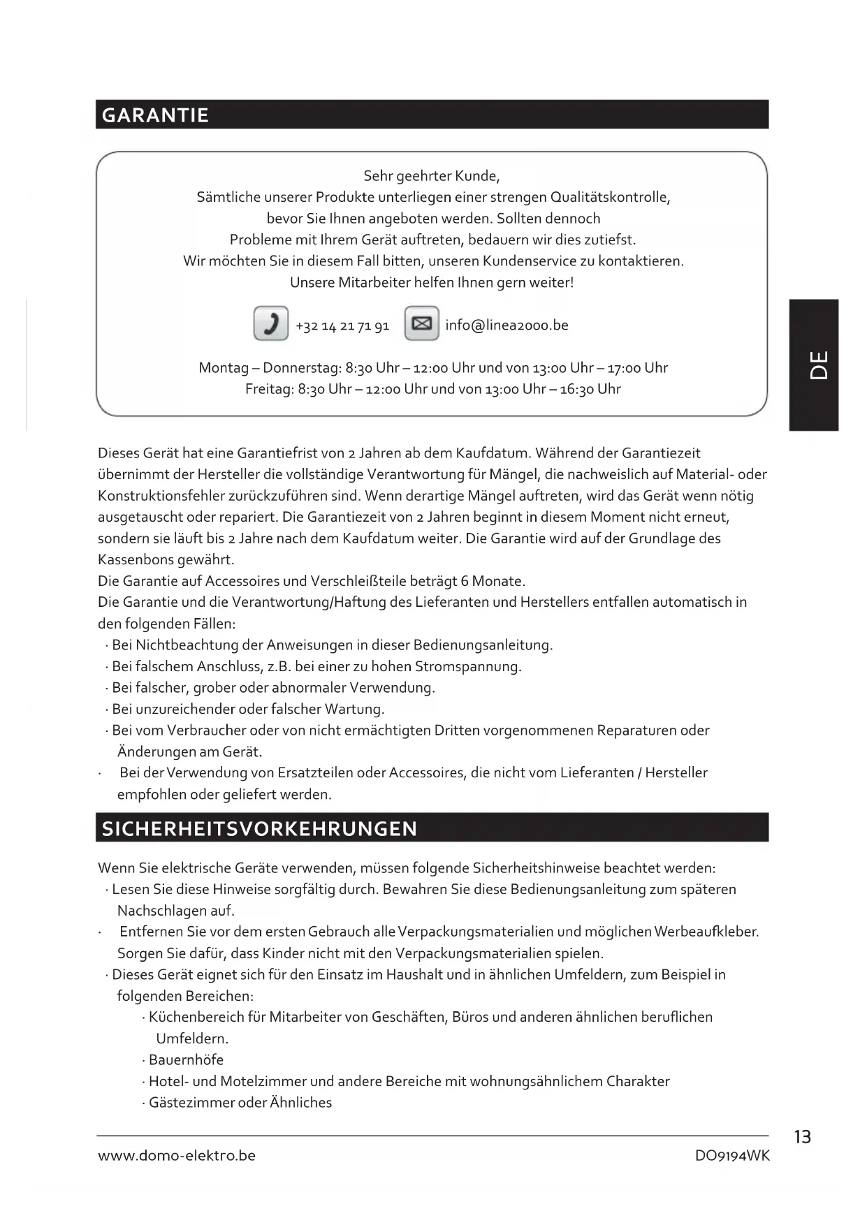 GARANTIE Sehr geehrter Kunde, Sämtliche unserer Produkte unterliegen einer strengen Qualitätskontrolle, bevor Sie Ihnen angeboten werden. Sollten dennoch Probleme mit Ihrem Gerät auftreten, bedauern wir dies zutiefst. Wir möchten Sie in diesem Fall bitten, unseren Kundenservice zu kontaktieren. Unsere Mitarbeiter helfen Ihnen gern weiter! +32 14 21 71 91 info@linea2000.be Montag – Donnerstag: 8:30 Uhr – 12:00 Uhr und von 13:00 Uhr – 17:00 Uhr Freitag: 8:30 Uhr – 12:00 Uhr und von 13:00 Uhr – 16:30 Uhr Dieses Gerät hat eine Garantiefrist von 2 Jahren ab dem Kaufdatum. Während der Garantiezeit übernimmt der Hersteller die vollständige Verantwortung für Mängel, die nachweislich auf Material- oder Konstruktionsfehler zurückzuführen sind. Wenn derartige Mängel auftreten, wird das Gerät wenn nötig ausgetauscht oder repariert. Die Garantiezeit von 2 Jahren beginnt in diesem Moment nicht erneut, sondern sie läuft bis 2 Jahre nach dem Kaufdatum weiter. Die Garantie wird auf der Grundlage des Kassenbons gewährt. Die Garantie auf Accessoires und Verschleißteile beträgt 6 Monate. Die Garantie und die Verantwortung/Haftung des Lieferanten und Herstellers entfallen automatisch in den folgenden Fällen: