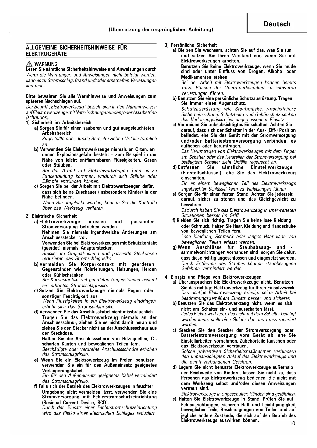 ELEKTROGERÄTE WARNUNG Lesen Sie sämtliche Sicherheitshinweise und Anweisungen durch Wenn die Warnungen und Anweisungen nicht befolgt werden, kann es zu Stromschlag, Brand und/oder ernsthaften Verletzungen kommen. Bitte bewahren Sie alle Warnhinweise und Anweisungen zum späteren Nachschlagen auf. Der Begriff „Elektrowerkzeug“ bezieht sich in den Warnhinweisen auf Elektrowerkzeuge mit Netz- (schnurgebunden) oder Akkubetrieb (schnurlos).