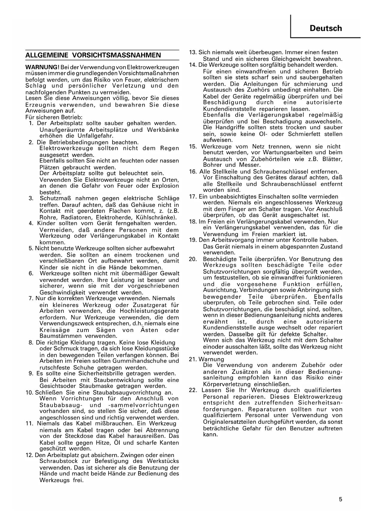 Deutsch ALLGEMEINE VORSICHTSMASSNAHMEN WARNUNG! Bei der Verwendung von Elektrowerkzeugen müssen immer die grundlegenden Vorsichtsmaßnahmen befolgt werden, um das Risiko von Feuer, elektrischem Schlag und persönlicher Verletzung und den nachfolgenden Punkten zu vermeiden. Lesen Sie diese Anweisungen völlig, bevor Sie dieses Erzeugnis verwenden, und bewahren Sie diese Anweisungen auf. Für sicheren Betrieb: