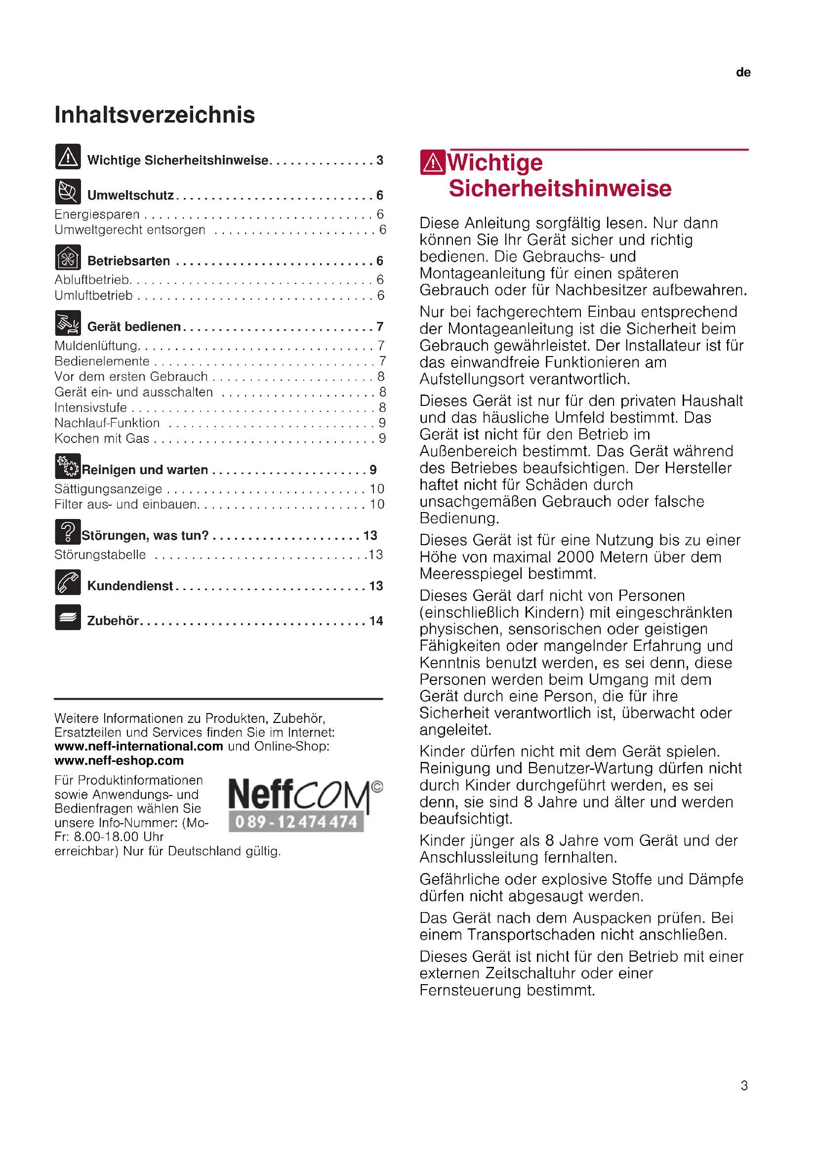 - _ Zubehör Produktinfo Weitere Informationen zu Produkten, Zubehör, Ersatzteilen und Services finden Sie im Internet: www.neff-international.com und Online-Shop: www.neff-eshop.com Für Produktinformationen sowie Anwendungs- und Bedienfragen wählen Sie unsere Info-Nummer: (Mo- Fr: 8.00-18.00 Uhr erreichbar) Nur für Deutschland gültig. (Wichtige Sicherheitshinweise Wichtige Sicherheitshinweise Diese Anleitung sorgfältig lesen. Nur dann können Sie Ihr Gerät sicher und richtig bedienen. Die Gebrauchs- und Montageanleitung für einen späteren Gebrauch oder für Nachbesitzer aufbewahren. Nur bei fachgerechtem Einbau entsprechend der Montageanleitung ist die Sicherheit beim Gebrauch gewährleistet. Der Installateur ist für das einwandfreie Funktionieren am Aufstellungsort verantwortlich. Dieses Gerät ist nur für den privaten Haushalt und das häusliche Umfeld bestimmt. Das Gerät ist nicht für den Betrieb im Außenbereich bestimmt. Das Gerät während des Betriebes beaufsichtigen. Der Hersteller haftet nicht für Schäden durch unsachgemäßen Gebrauch oder falsche Bedienung. Dieses Gerät ist für eine Nutzung bis zu einer Höhe von maximal 2000 Metern über dem Meeresspiegel bestimmt. Dieses Gerät darf nicht von Personen (einschließlich Kindern) mit eingeschränkten physischen, sensorischen oder geistigen Fähigkeiten oder mangelnder Erfahrung und Kenntnis benutzt werden, es sei denn, diese Personen werden beim Umgang mit dem Gerät durch eine Person, die für ihre Sicherheit verantwortlich ist, überwacht oder angeleitet. Kinder dürfen nicht mit dem Gerät spielen. Reinigung und Benutzer-Wartung dürfen nicht durch Kinder durchgeführt werden, es sei denn, sie sind 8 Jahre und älter und werden beaufsichtigt. Kinder jünger als 8 Jahre vom Gerät und der Anschlussleitung fernhalten. Gefährliche oder explosive Stoffe und Dämpfe dürfen nicht abgesaugt werden. Das Gerät nach dem Auspacken prüfen. Bei einem Transportschaden nicht anschließen. Dieses Gerät ist nicht für den Betrieb mit einer externen Zeitschaltuhr oder einer Fernsteuerung bestimmt.de Wichtige Sicherheitshinweise p. 14