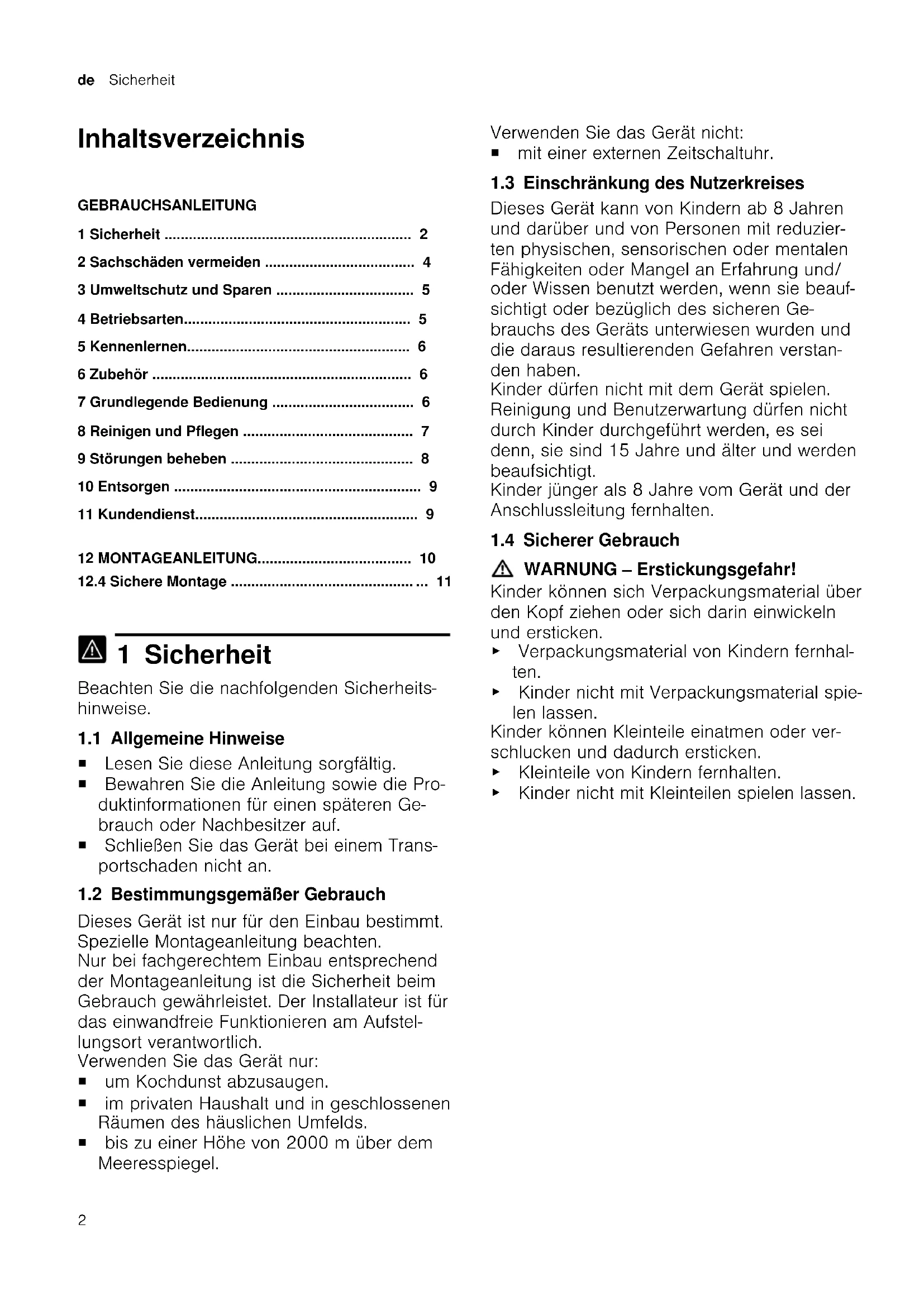1 Sicherheit Beachten Sie die nachfolgenden Sicherheits- hinweise. 1.1 Allgemeine Hinweise ¡ Lesen Sie diese Anleitung sorgfältig. ¡ Bewahren Sie die Anleitung sowie die Pro- duktinformationen für einen späteren Ge- brauch oder Nachbesitzer auf. ¡ Schließen Sie das Gerät bei einem Trans- portschaden nicht an. 1.2 Bestimmungsgemäßer Gebrauch Dieses Gerät ist nur für den Einbau bestimmt. Spezielle Montageanleitung beachten. Nur bei fachgerechtem Einbau entsprechend der Montageanleitung ist die Sicherheit beim Gebrauch gewährleistet. Der Installateur ist für das einwandfreie Funktionieren am Aufstel- lungsort verantwortlich. Verwenden Sie das Gerät nur: ¡ um Kochdunst abzusaugen. ¡ im privaten Haushalt und in geschlossenen Räumen des häuslichen Umfelds. ¡ bis zu einer Höhe von 2000m über dem Meeresspiegel. Verwenden Sie das Gerät nicht: ¡ mit einer externen Zeitschaltuhr. 1.3 Einschränkung des Nutzerkreises Dieses Gerät kann von Kindern ab 8 Jahren und darüber und von Personen mit reduzier- ten physischen, sensorischen oder mentalen Fähigkeiten oder Mangel an Erfahrung und/ oder Wissen benutzt werden, wenn sie beauf- sichtigt oder bezüglich des sicheren Ge- brauchs des Geräts unterwiesen wurden und die daraus resultierenden Gefahren verstan- den haben. Kinder dürfen nicht mit dem Gerät spielen. Reinigung und Benutzerwartung dürfen nicht durch Kinder durchgeführt werden, es sei denn, sie sind 15 Jahre und älter und werden beaufsichtigt. Kinder jünger als 8 Jahre vom Gerät und der Anschlussleitung fernhalten. 1.4 Sicherer Gebrauch WARNUNG‒Erstickungsgefahr! Kinder können sich Verpackungsmaterial über den Kopf ziehen oder sich darin einwickeln und ersticken. ▶ Verpackungsmaterial von Kindern fernhal- ten. ▶ Kinder nicht mit Verpackungsmaterial spie- len lassen. Kinder können Kleinteile einatmen oder ver- schlucken und dadurch ersticken. ▶ Kleinteile von Kindern fernhalten. ▶ Kinder nicht mit Kleinteilen spielen lassen.Sicherheit de