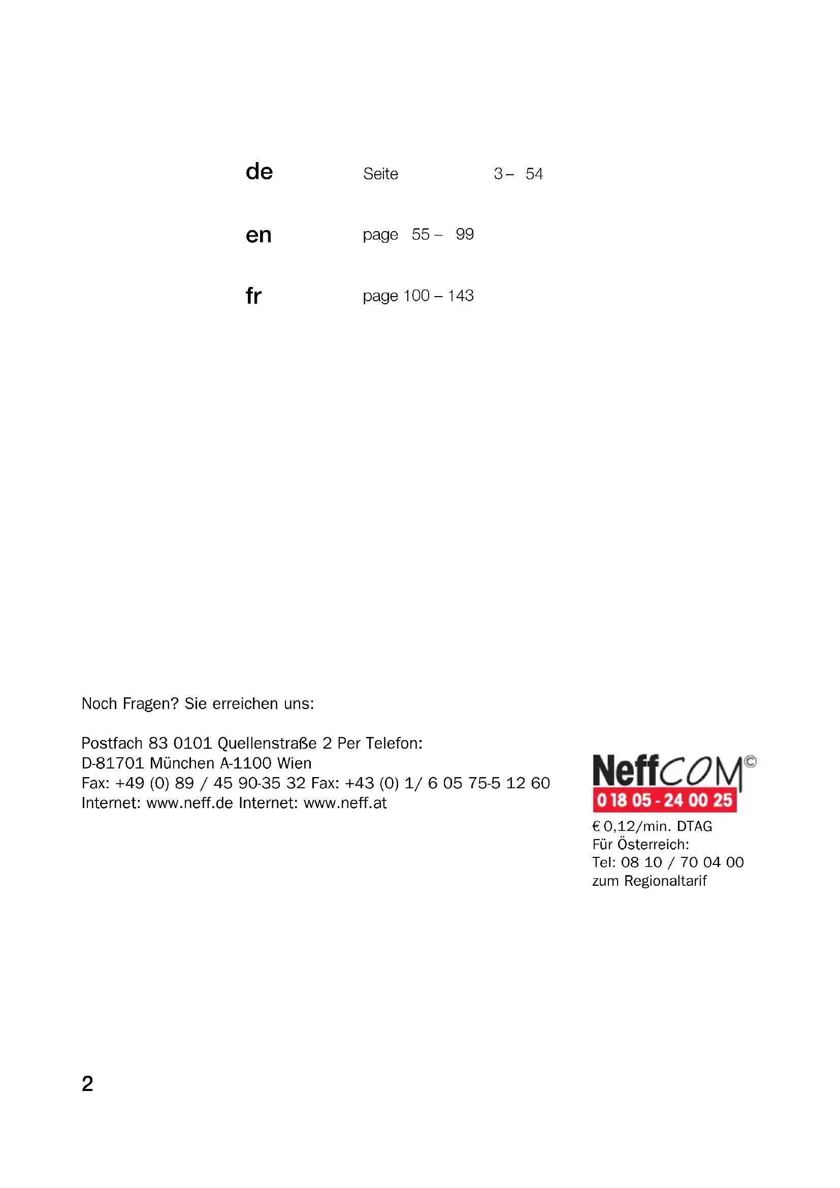 - page 100 – 143 Noch Fragen? Sie erreichen uns: Postfach 83 0101 Quellenstraße 2 Per Telefon: D-81701 München A-1100 Wien Fax: +49 (0) 89 / 45 90-35 32 Fax: +43 (0) 1/ 6 05 75-5 12 60 Internet: www.neff.de Internet: www.neff.at € 0,12/min. DTAG Für Österreich: Tel: 08 10 / 70 04 00 zum Regionaltarif3 Inhaltsverzeichnis Worauf Sie achten müssen p. 4