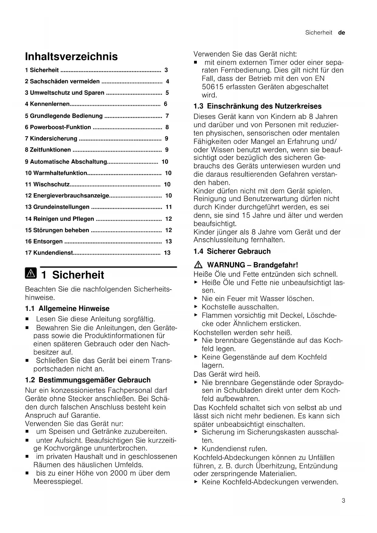 - 17 Kundendienst 1 Sicherheit Beachten Sie die nachfolgenden Sicherheits- hinweise. 1.1 Allgemeine Hinweise ¡ Lesen Sie diese Anleitung sorgfältig. ¡ Bewahren Sie die Anleitungen, den Geräte- pass sowie die Produktinformationen für einen späteren Gebrauch oder den Nach- besitzer auf. ¡ Schließen Sie das Gerät bei einem Trans- portschaden nicht an. 1.2 Bestimmungsgemäßer Gebrauch Nur ein konzessioniertes Fachpersonal darf Geräte ohne Stecker anschließen. Bei Schä- den durch falschen Anschluss besteht kein Anspruch auf Garantie. Verwenden Sie das Gerät nur: ¡ um Speisen und Getränke zuzubereiten. ¡ unter Aufsicht. Beaufsichtigen Sie kurzzeiti- ge Kochvorgänge ununterbrochen. ¡ im privaten Haushalt und in geschlossenen Räumen des häuslichen Umfelds. ¡ bis zu einer Höhe von 2000m über dem Meeresspiegel. Verwenden Sie das Gerät nicht: ¡ mit einem externen Timer oder einer sepa- raten Fernbedienung. Dies gilt nicht für den Fall, dass der Betrieb mit den von EN 50615 erfassten Geräten abgeschaltet wird. 1.3 Einschränkung des Nutzerkreises Dieses Gerät kann von Kindern ab 8 Jahren und darüber und von Personen mit reduzier- ten physischen, sensorischen oder mentalen Fähigkeiten oder Mangel an Erfahrung und/ oder Wissen benutzt werden, wenn sie beauf- sichtigt oder bezüglich des sicheren Ge- brauchs des Geräts unterwiesen wurden und die daraus resultierenden Gefahren verstan- den haben. Kinder dürfen nicht mit dem Gerät spielen. Reinigung und Benutzerwartung dürfen nicht durch Kinder durchgeführt werden, es sei denn, sie sind 15 Jahre und älter und werden beaufsichtigt. Kinder jünger als 8 Jahre vom Gerät und der Anschlussleitung fernhalten. 1.4 Sicherer Gebrauch WARNUNG‒Brandgefahr! Heiße Öle und Fette entzünden sich schnell. p. 13